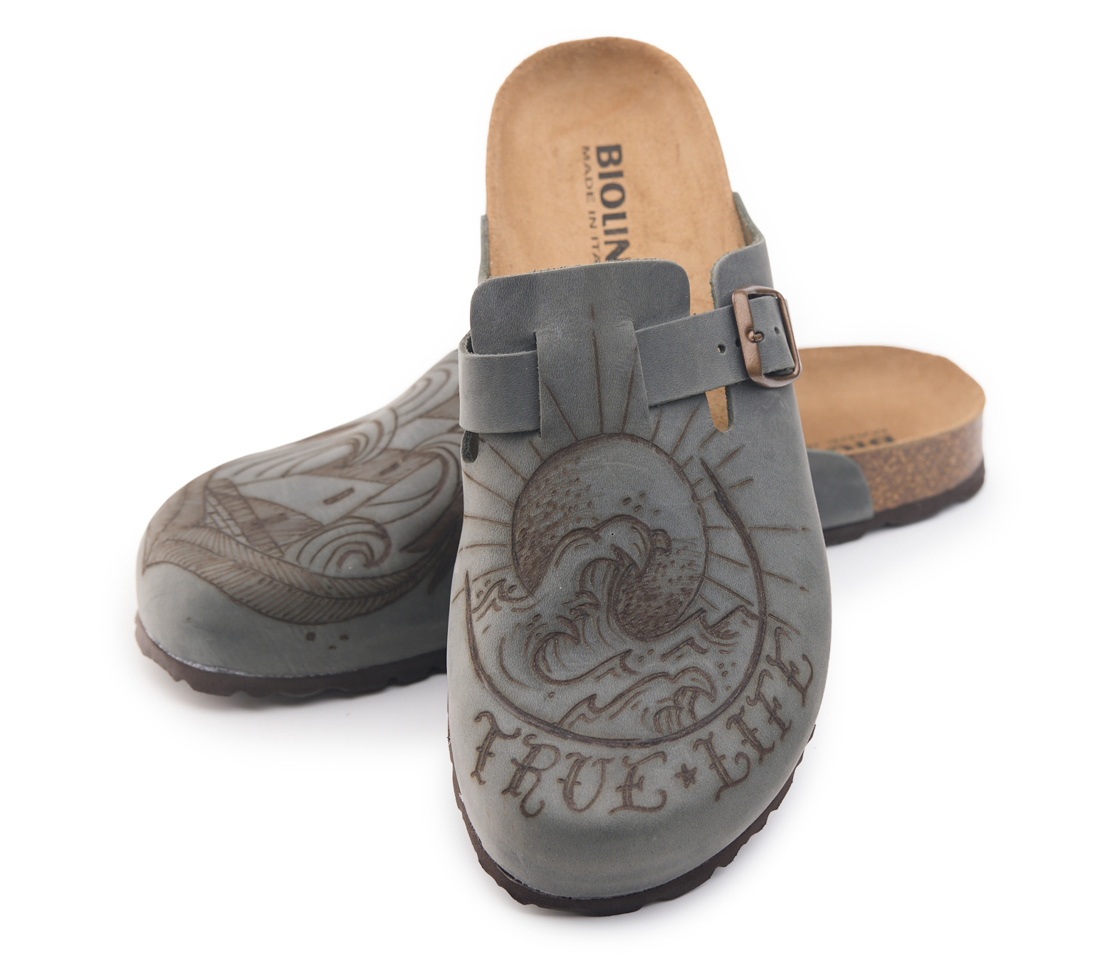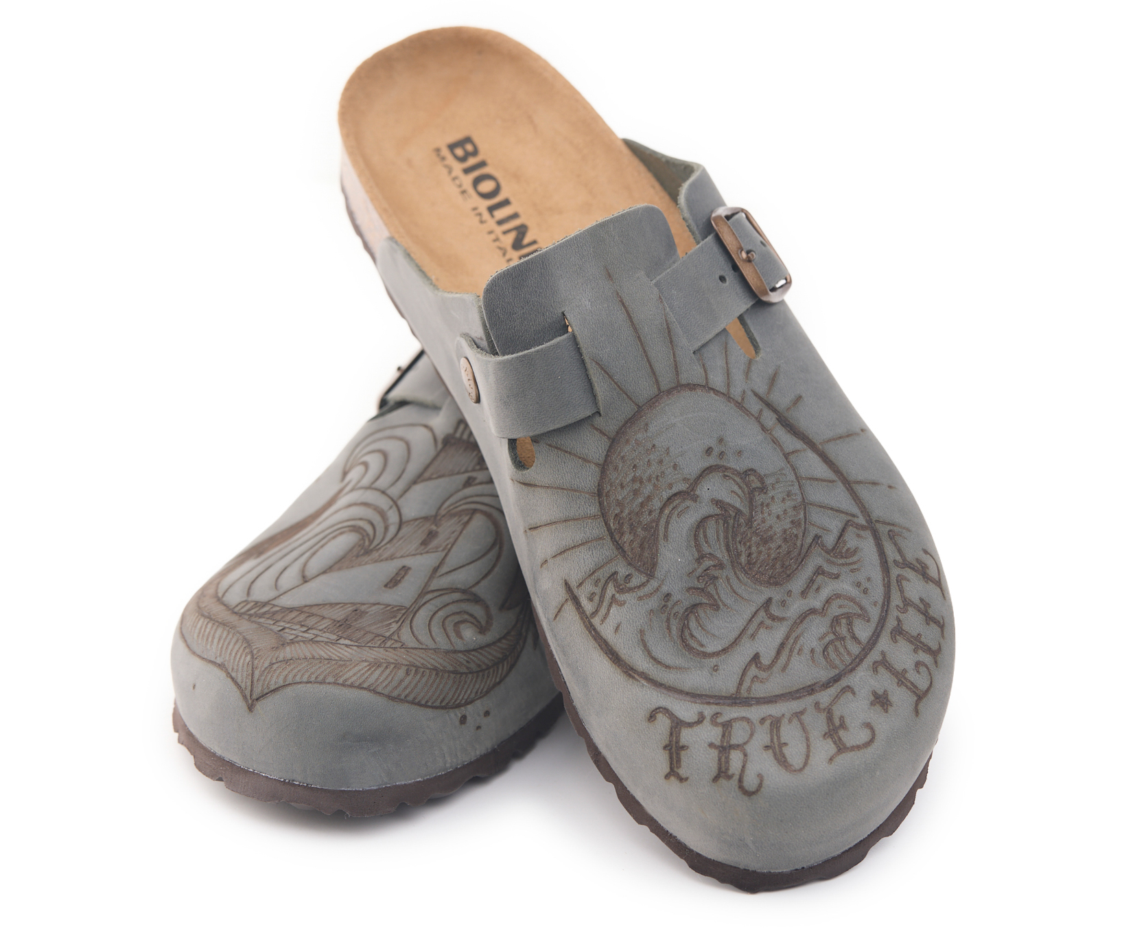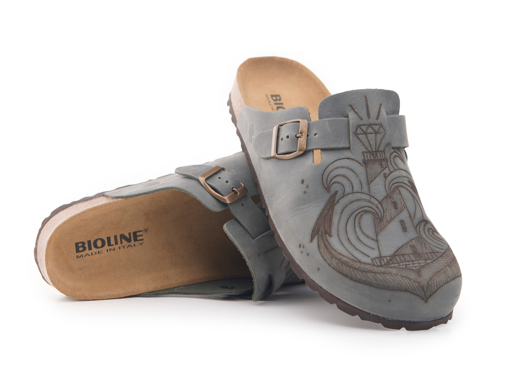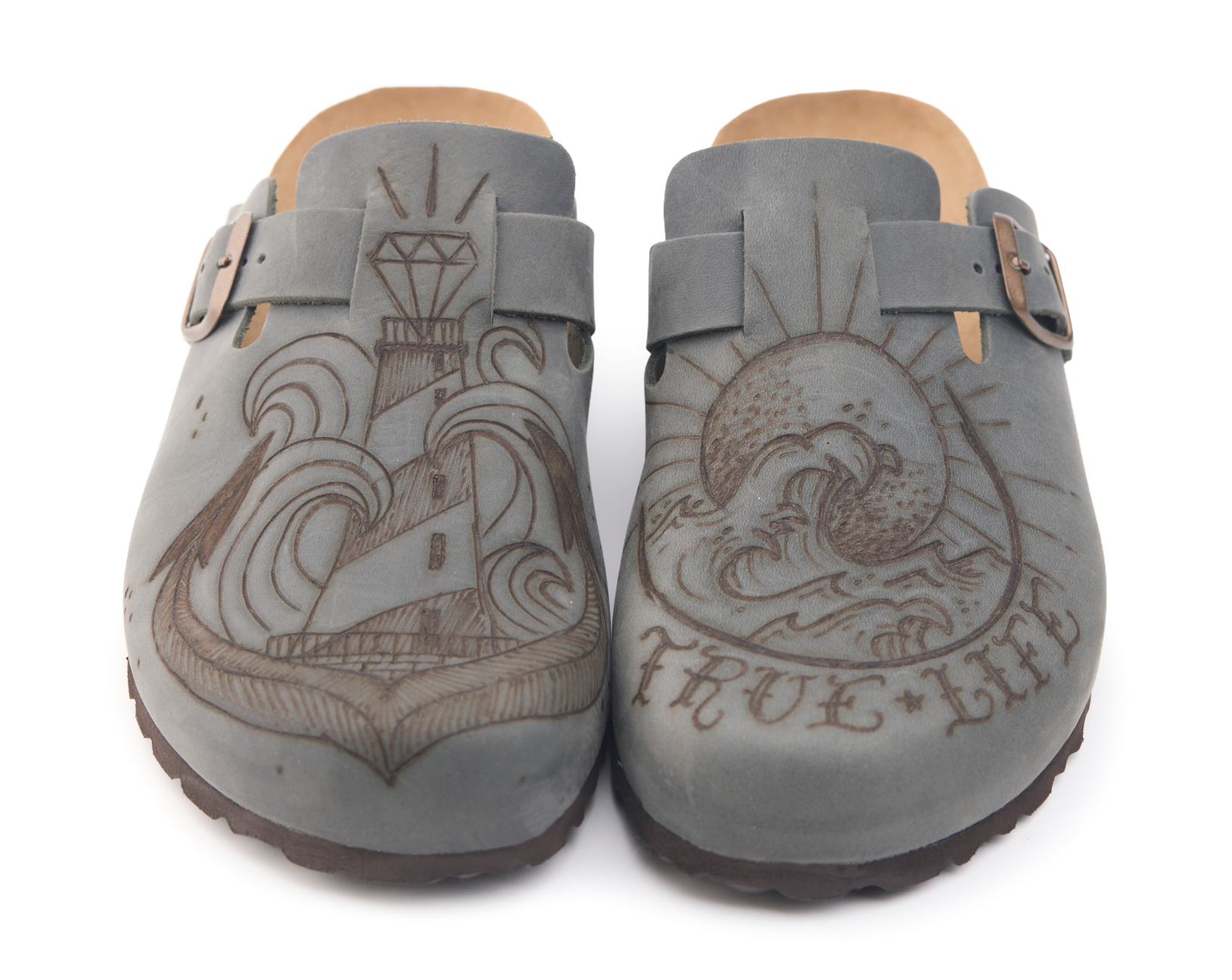 Sabot with greased nubuck leather upper worked seamlessly with wave and lighthouse hand-pyrographed by AC Longboards. Adjustable, with strap with metal buckle.