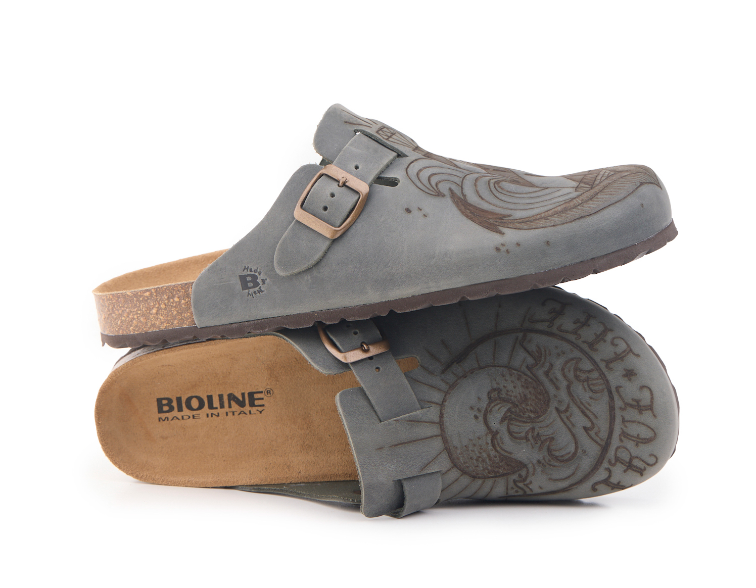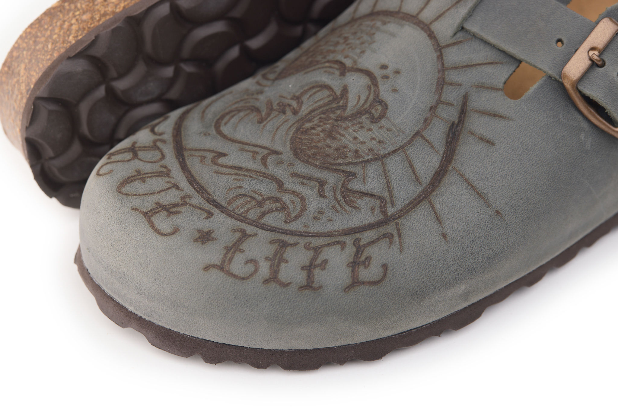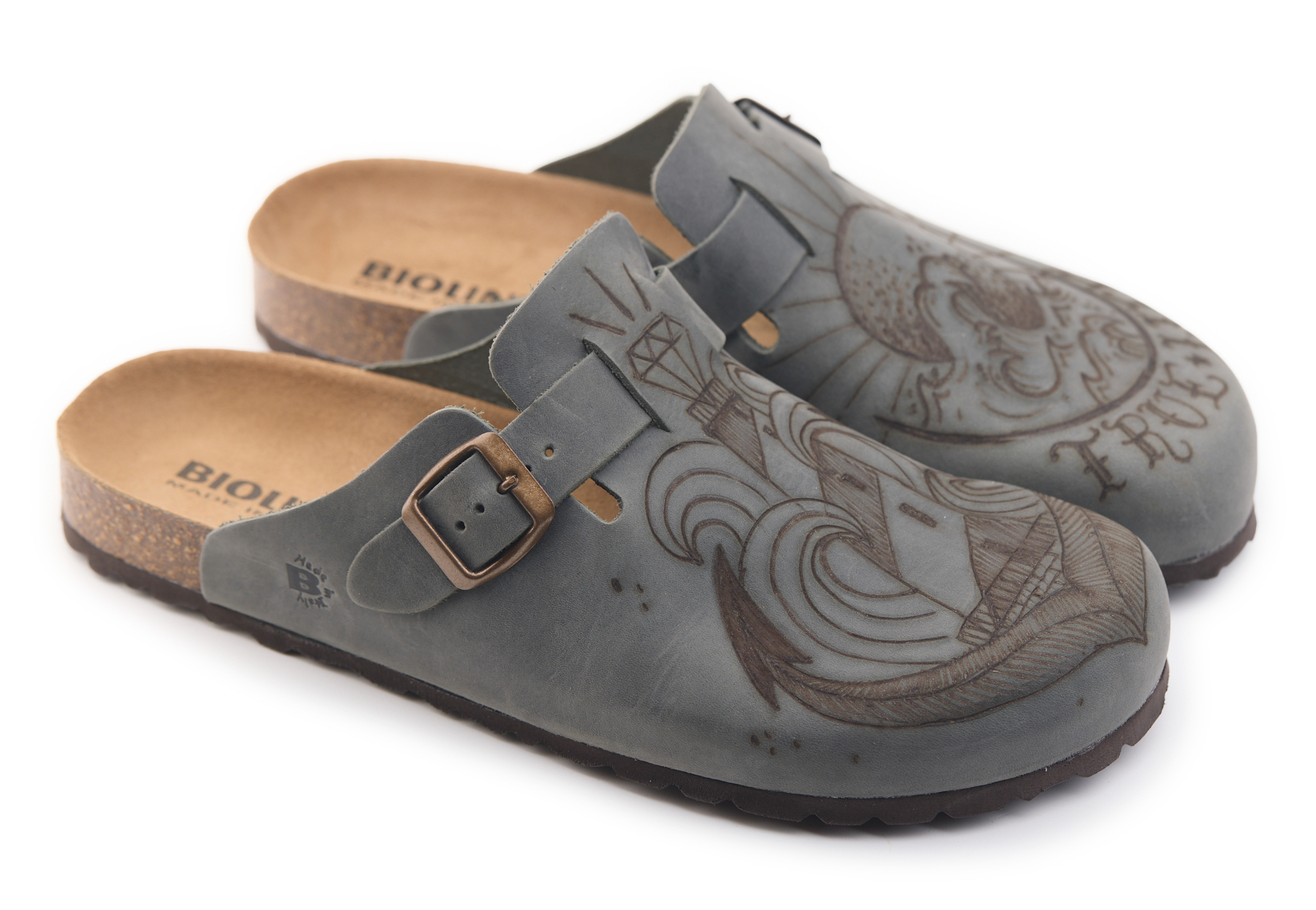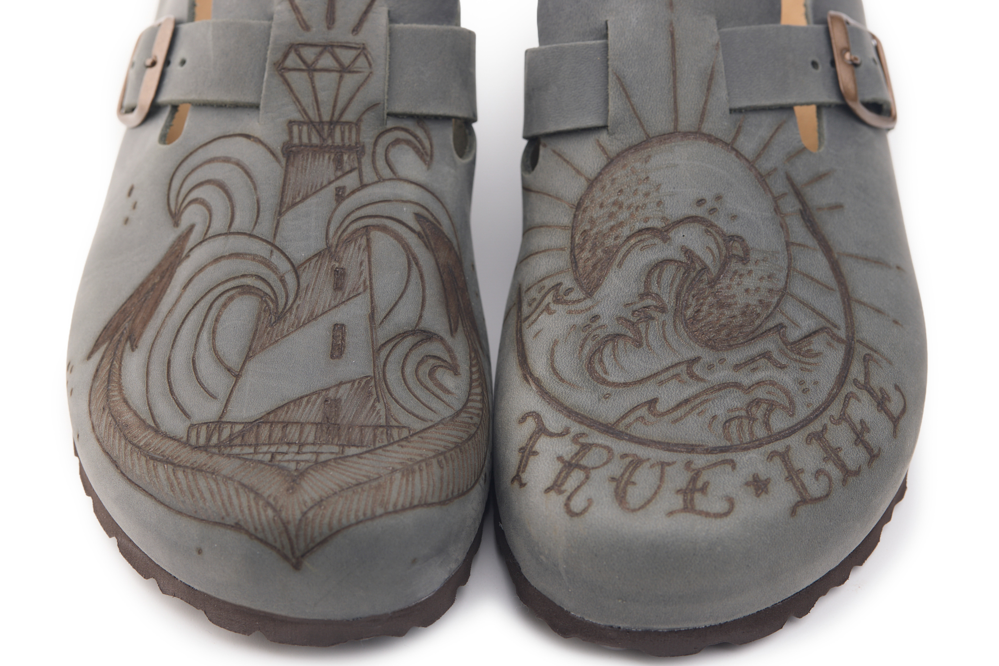 Sabot with greased nubuck leather upper worked seamlessly with wave and lighthouse hand-pyrographed by AC Longboards. Adjustable, with strap with metal buckle.