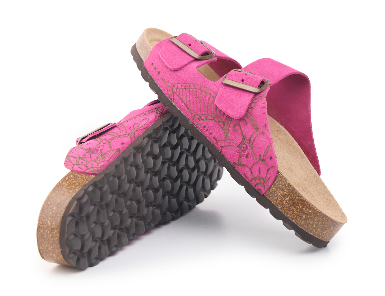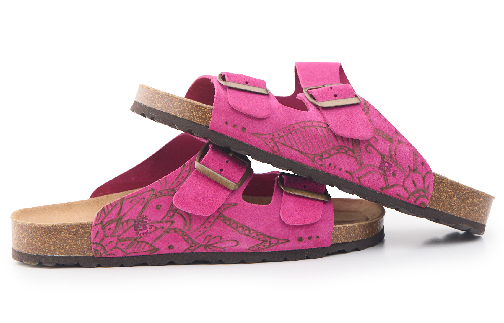 Adjustable two-buckle platform with cow split suede leather upper worked seamlessly with hand-pyrographed mandala by AC Longboards.