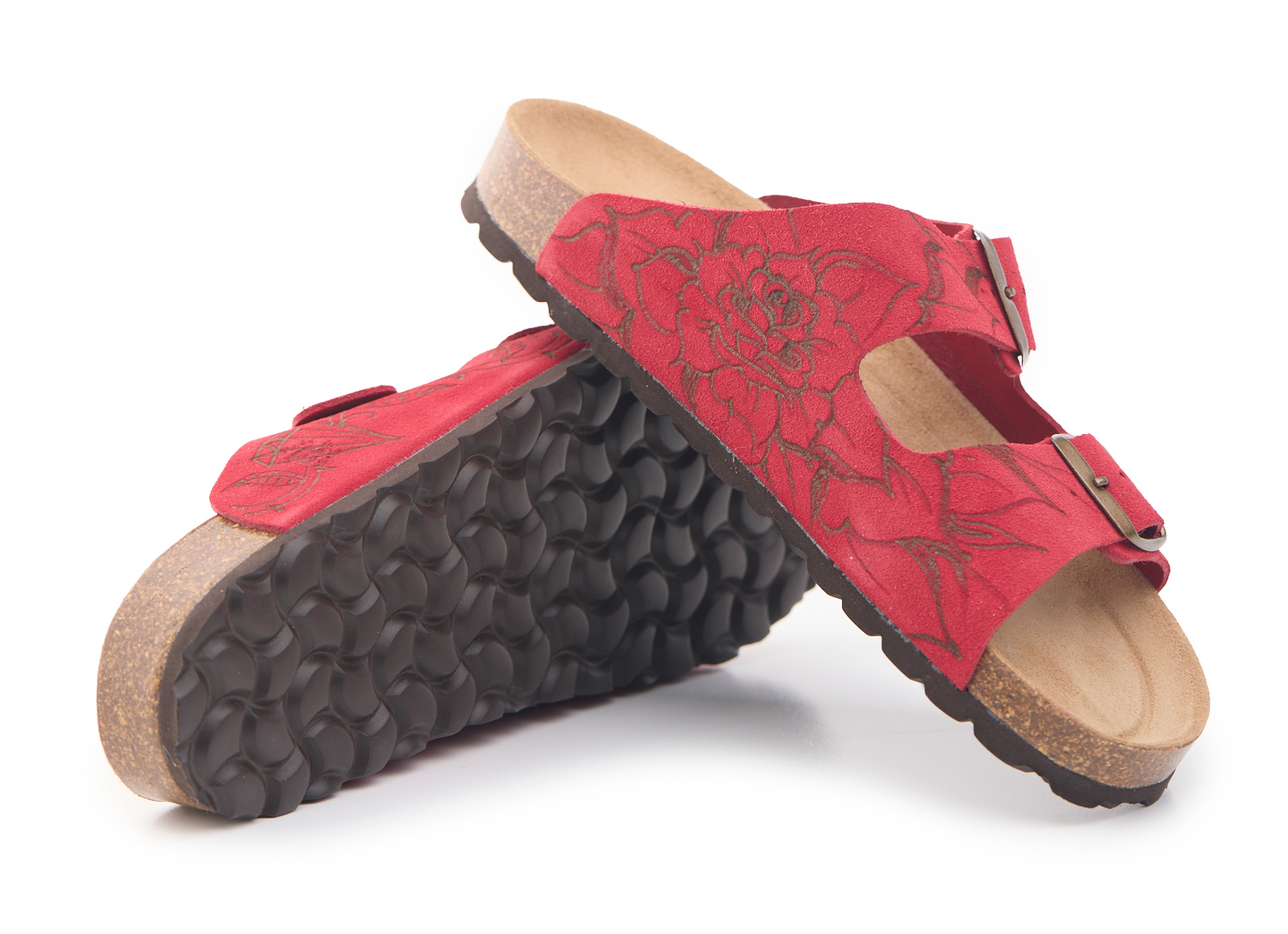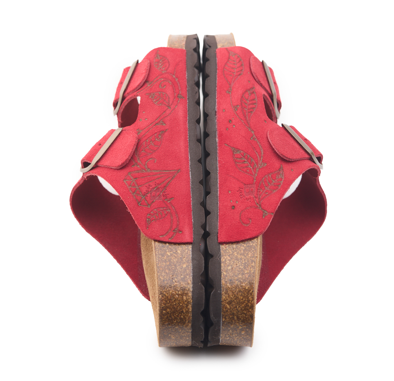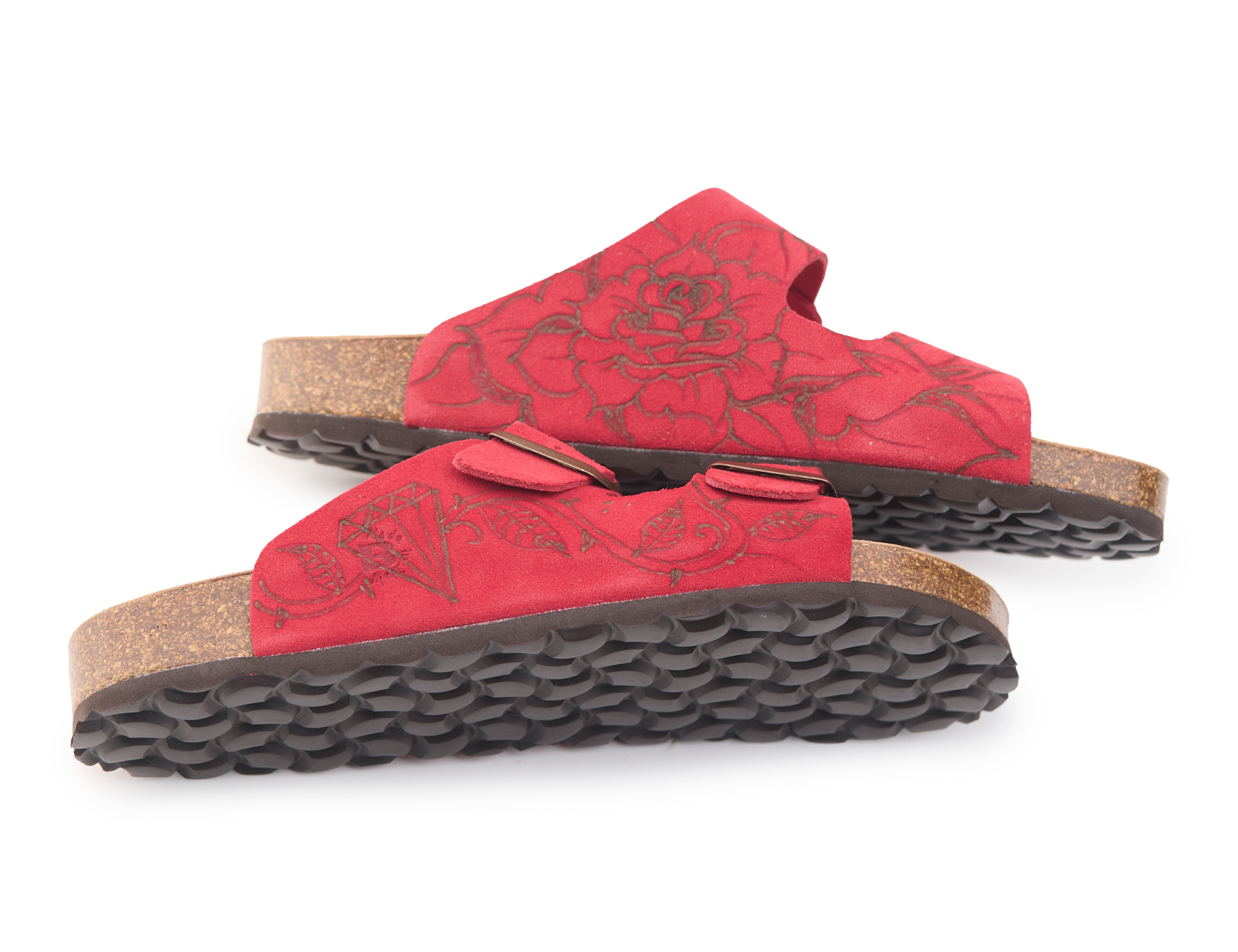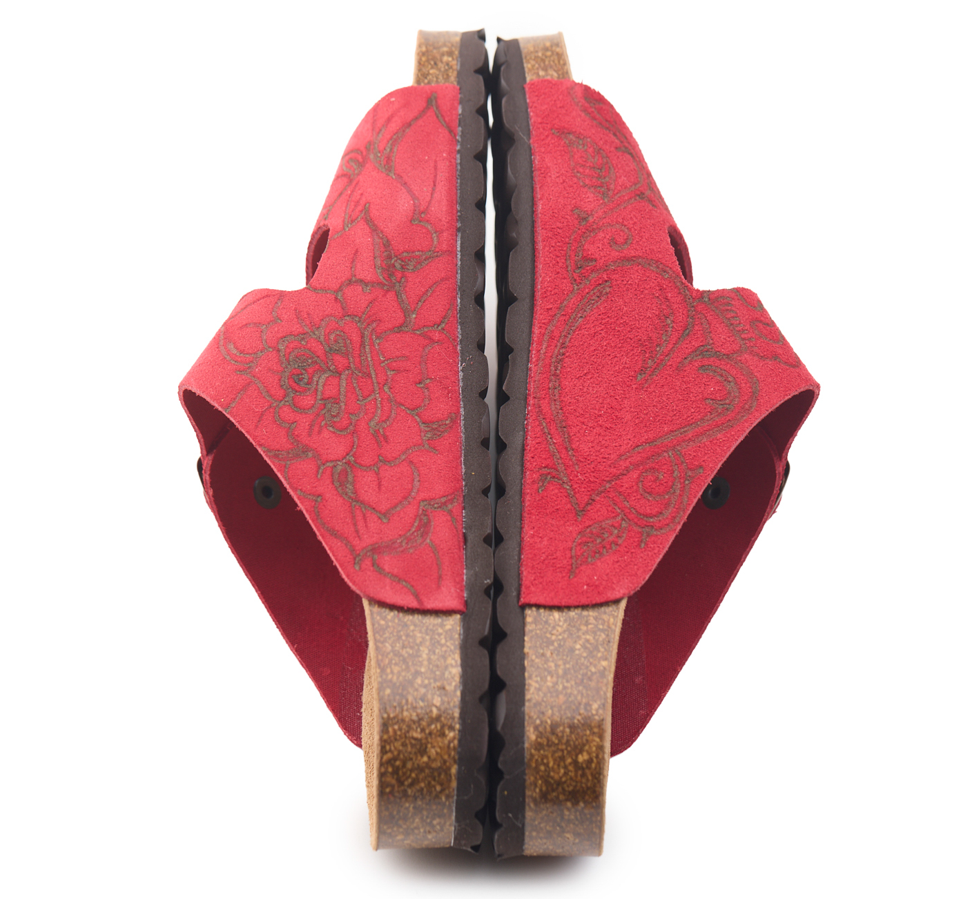 Adjustable two-buckle platform with split cowhide suede upper worked seamlessly with hand-pyrographed rose and heart by AC Longboards.