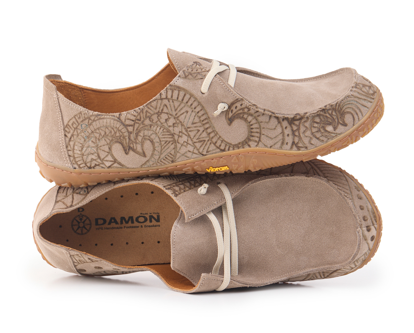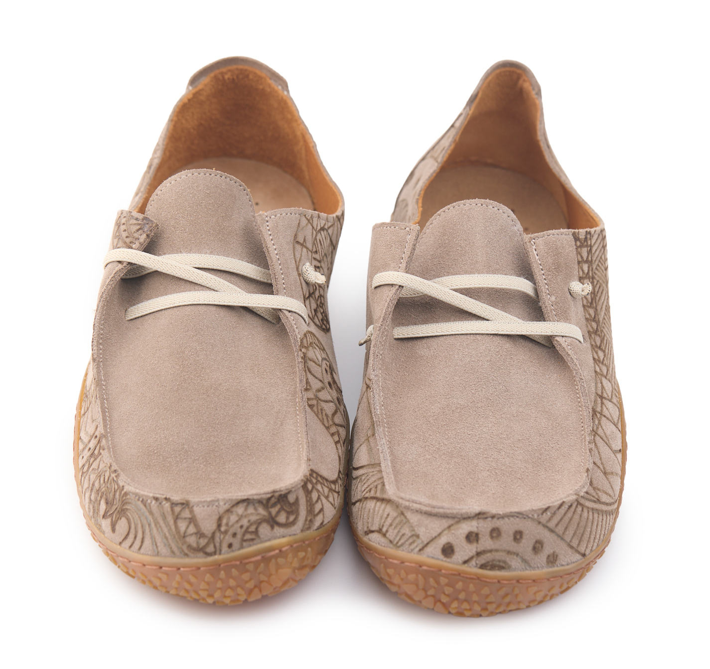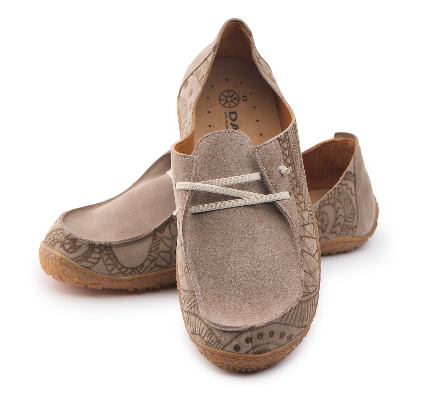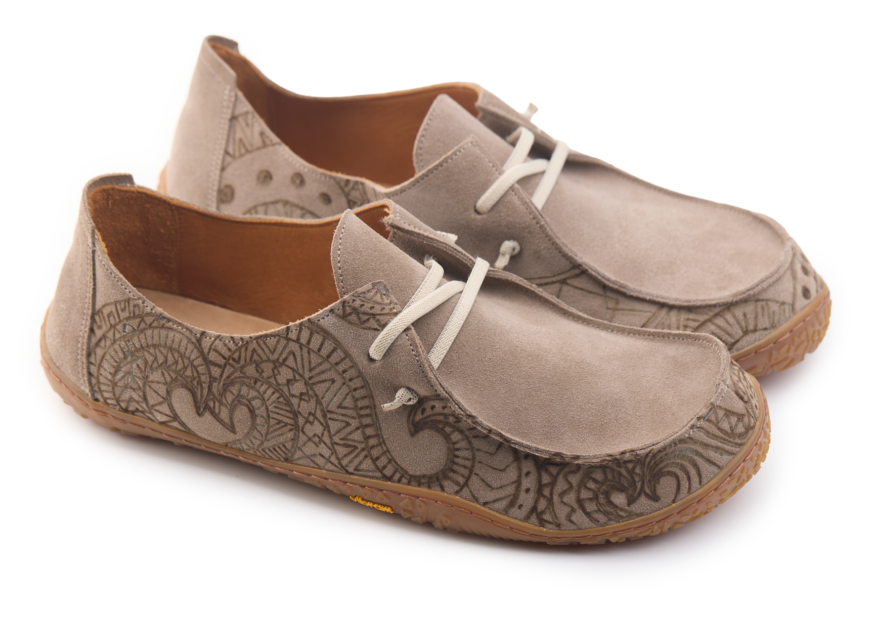 Barefoot moccasin made of suede leather, calfskin lining and knotted elastic laces. Hand pyrographed by AC Longboards with maori design.