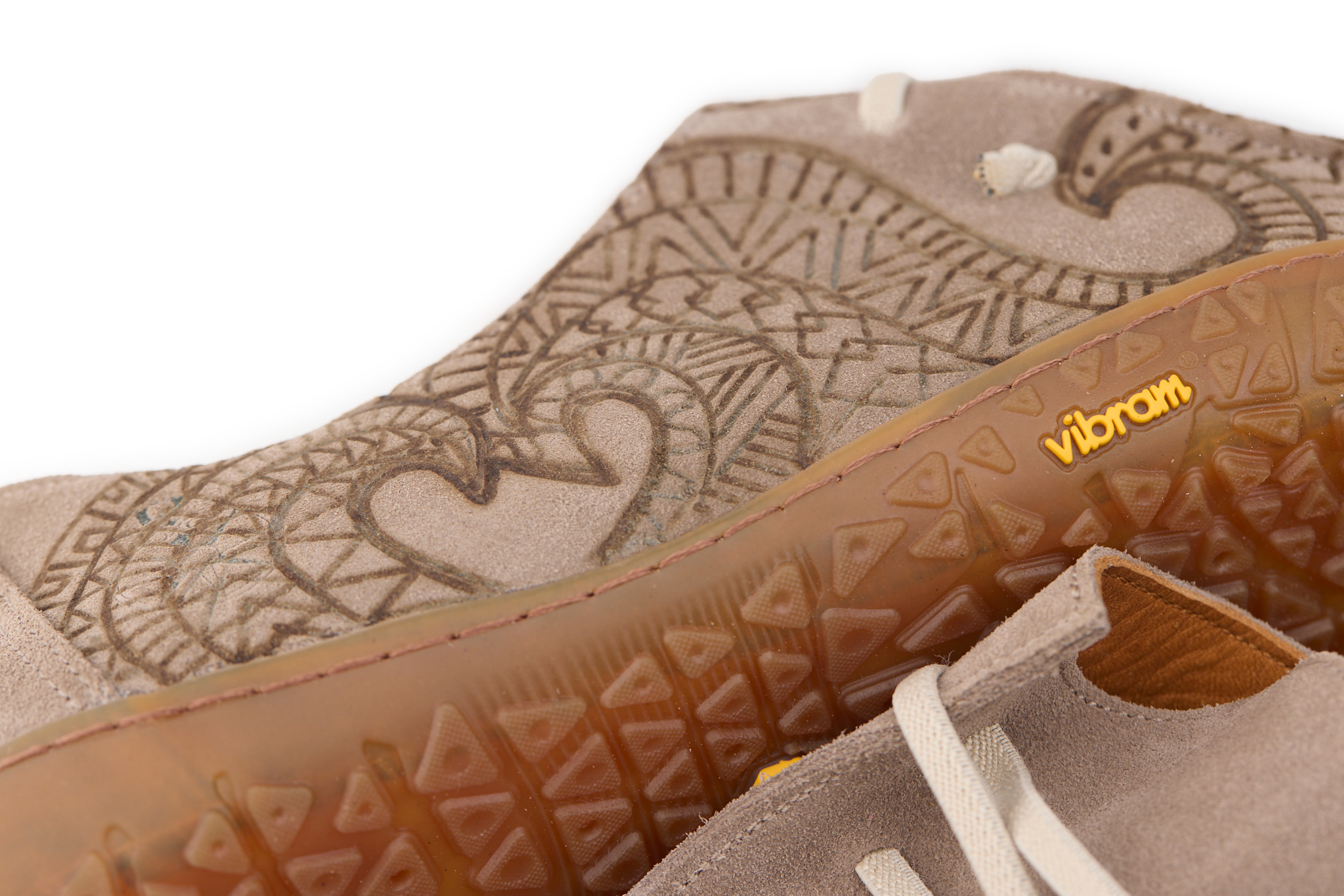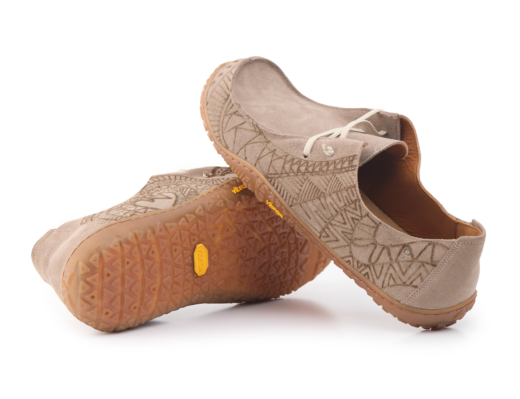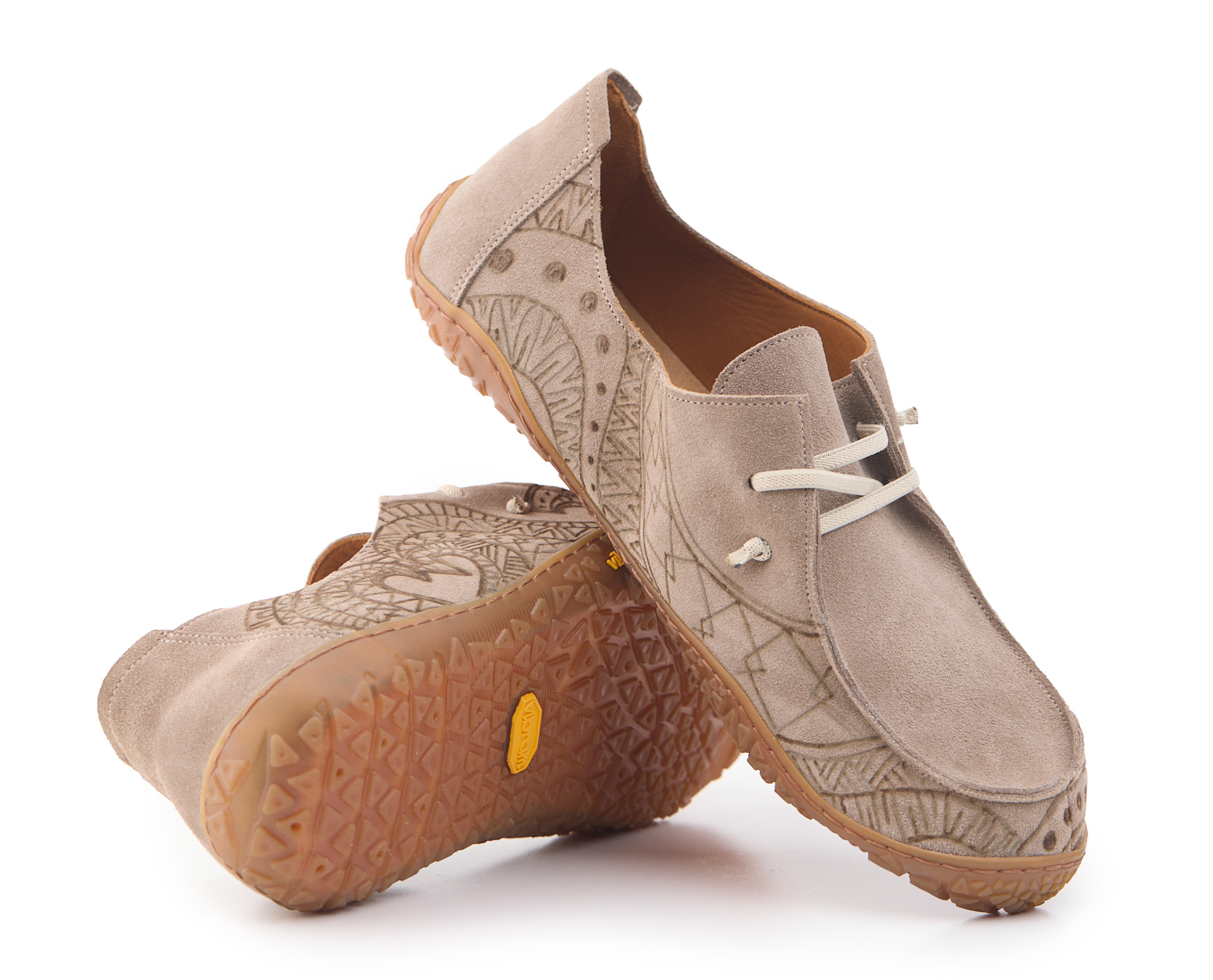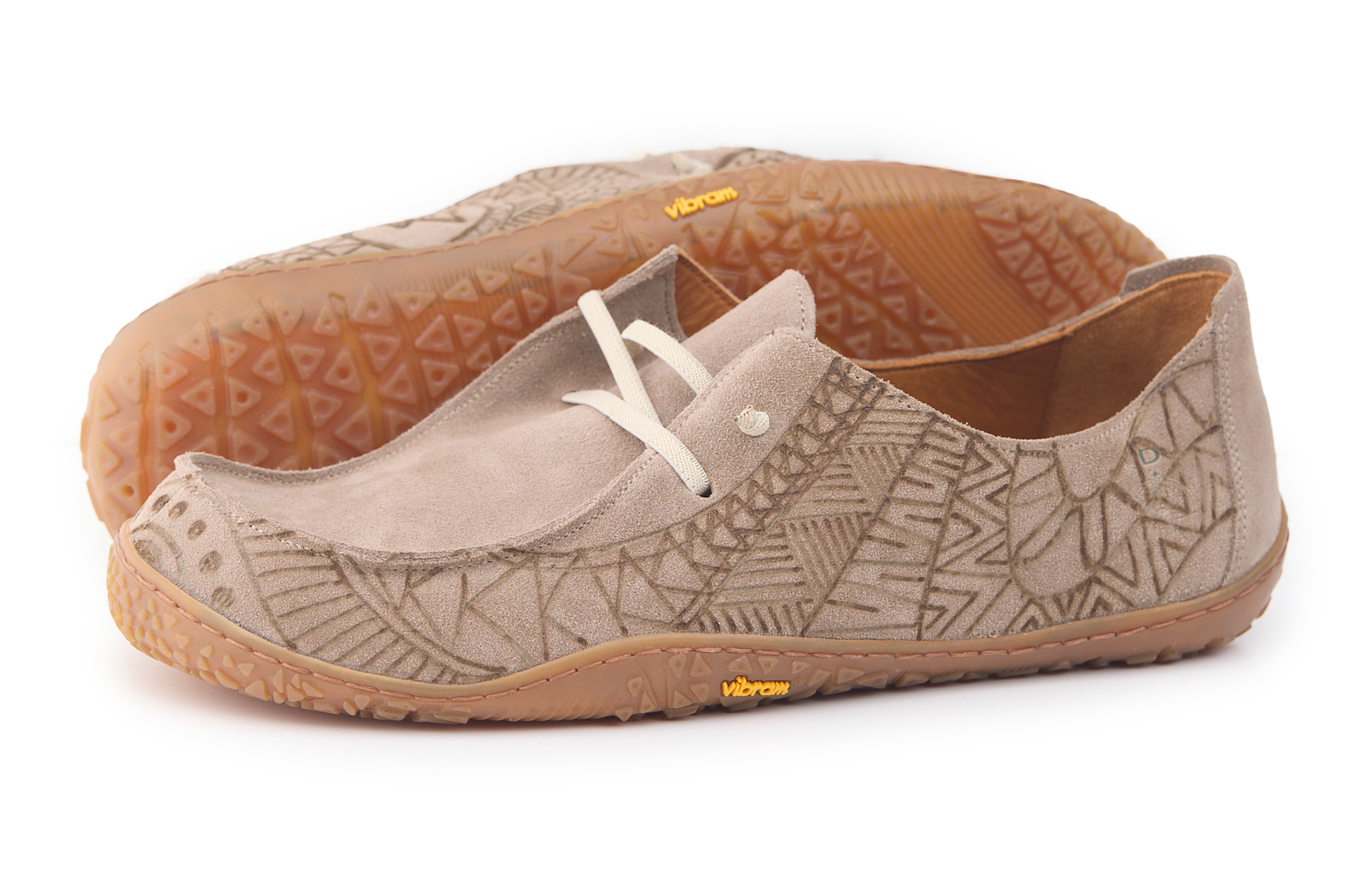 Barefoot moccasin made of suede leather, calfskin lining and knotted elastic laces. Hand pyrographed by AC Longboards with maori design.