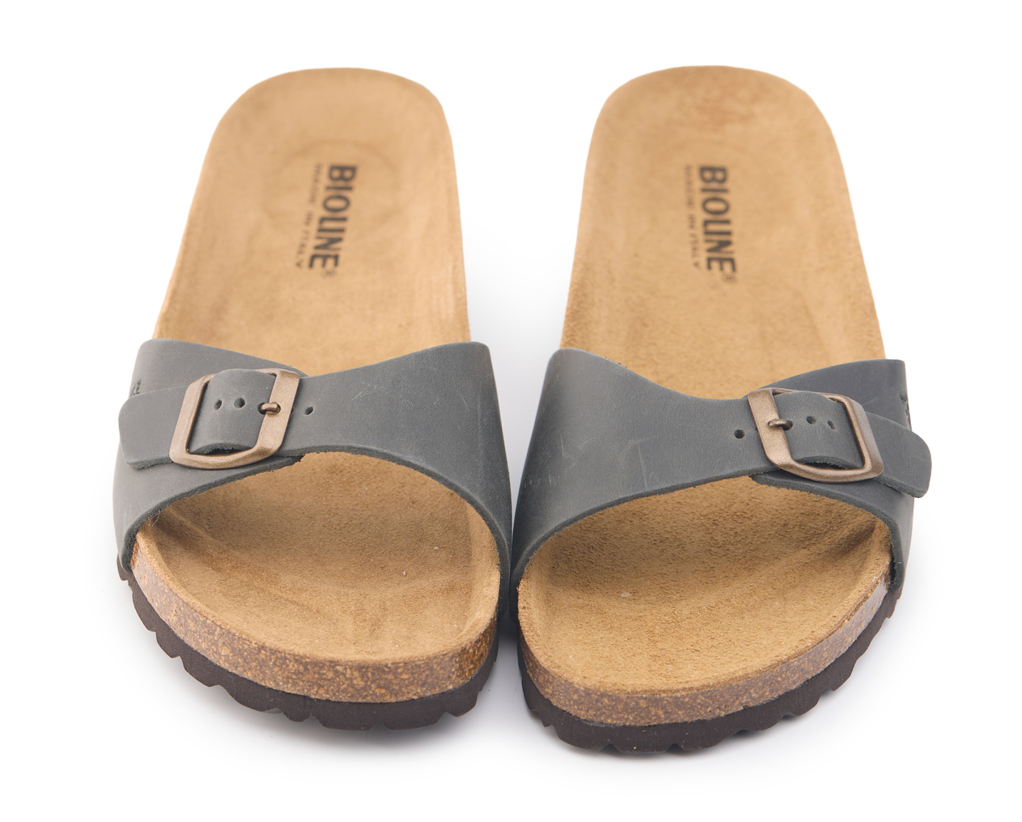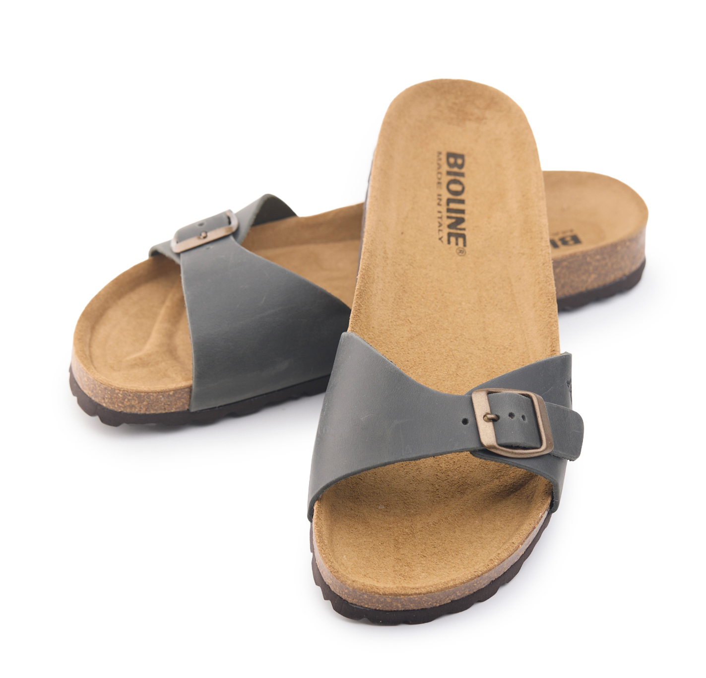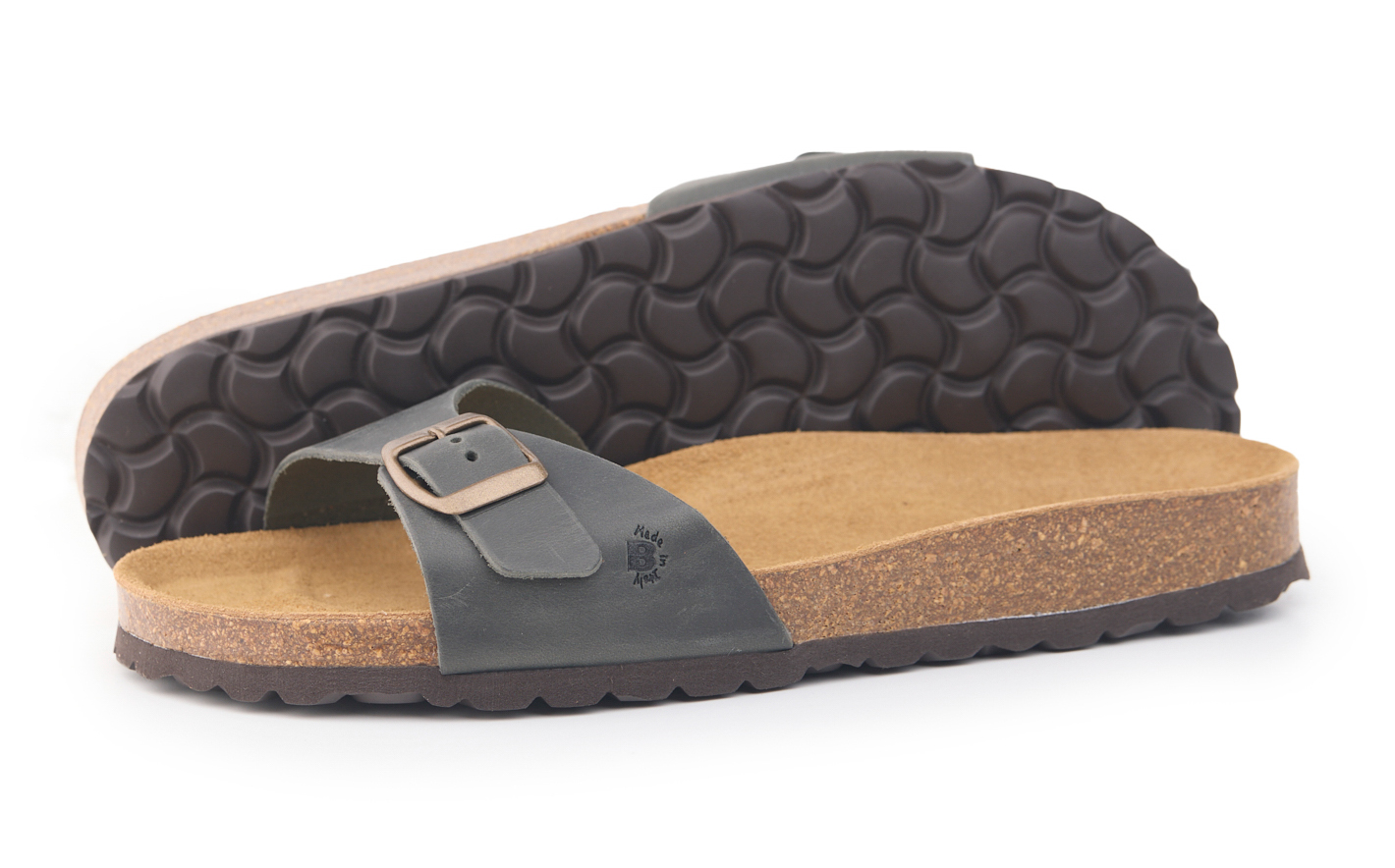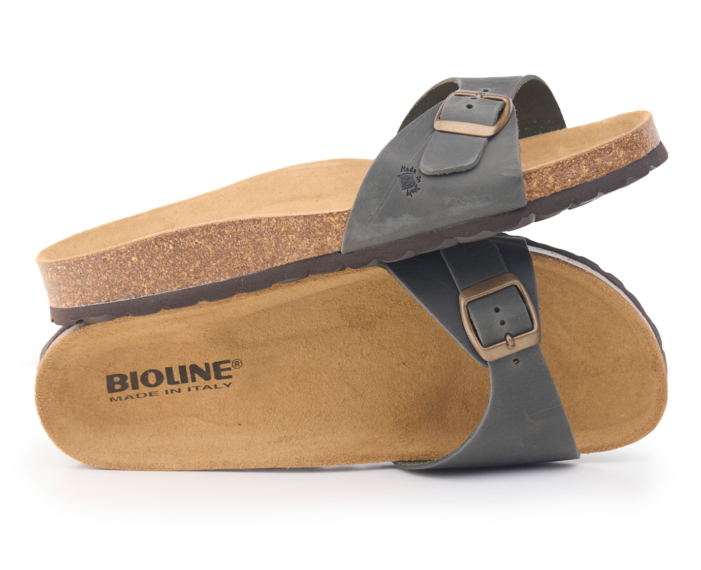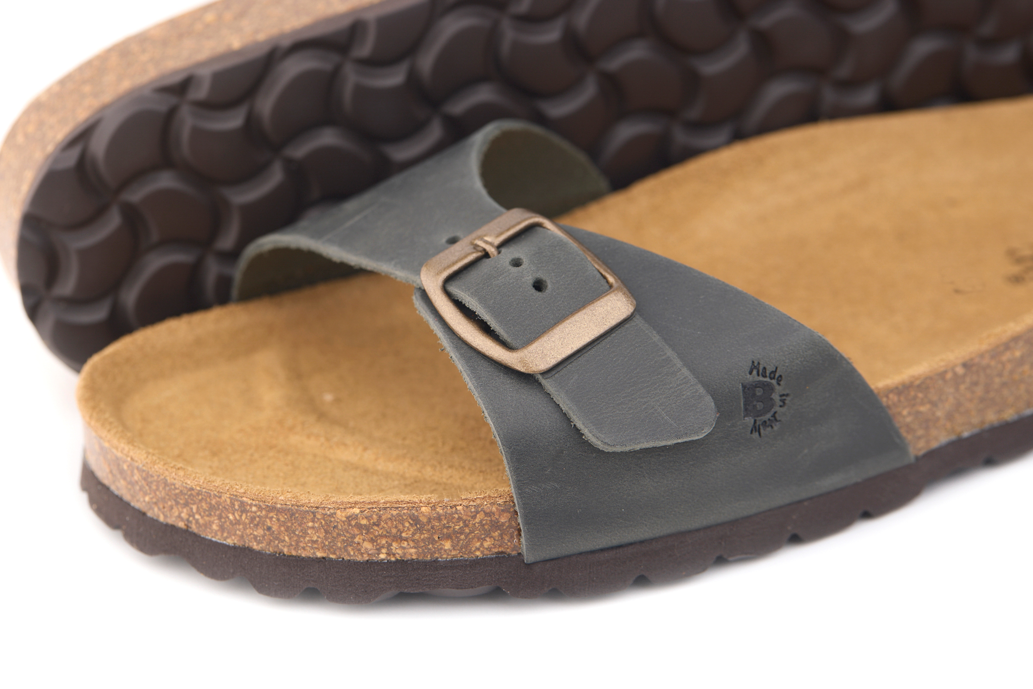 Pianella regolazione una fibbia con tomaia in pelle nabuk ingrassato senza cuciture, sottopiede in gomma-sughero rivestito in pelle e battistrada in EVA (etil vinil acetato) 8mm.