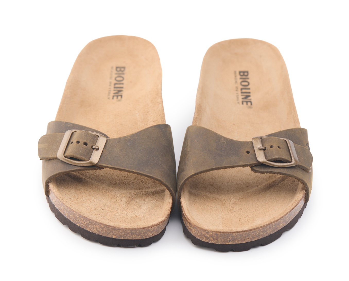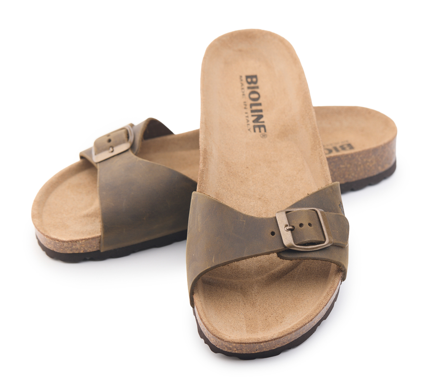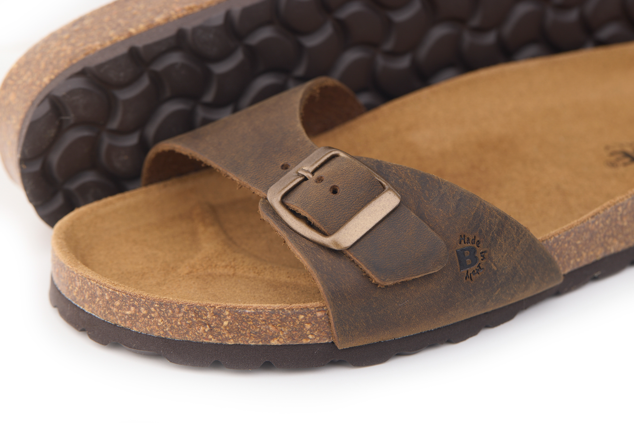 Pianella regolazione una fibbia con tomaia in pelle nabuk ingrassato senza cuciture, sottopiede in gomma-sughero rivestito in pelle e battistrada in EVA (etil vinil acetato) 8mm.