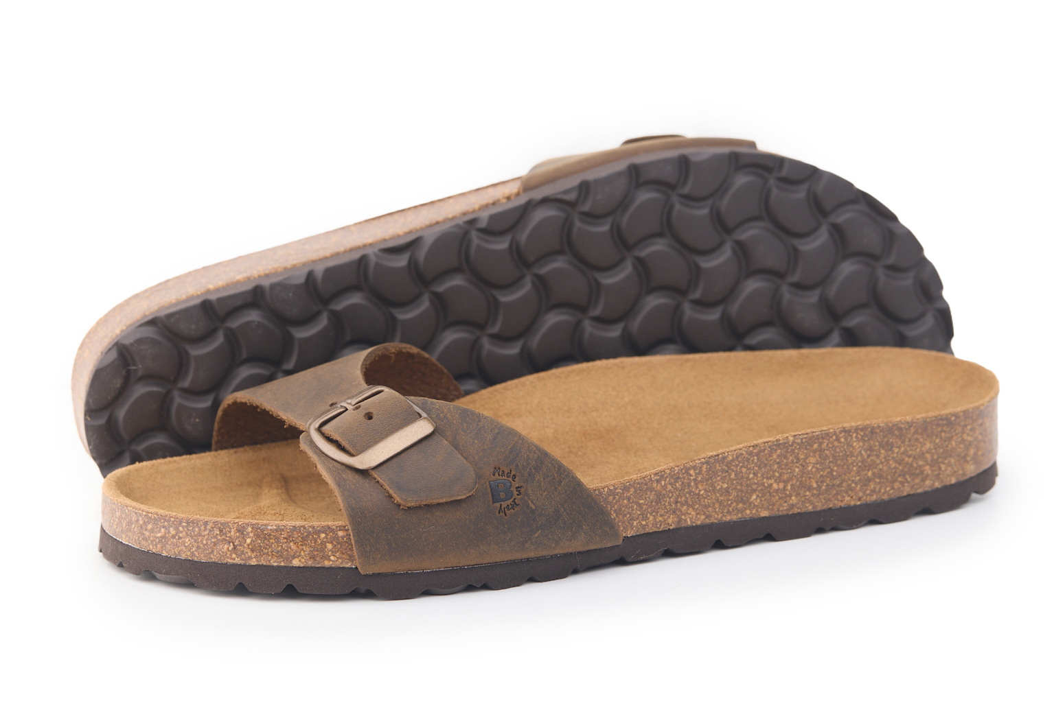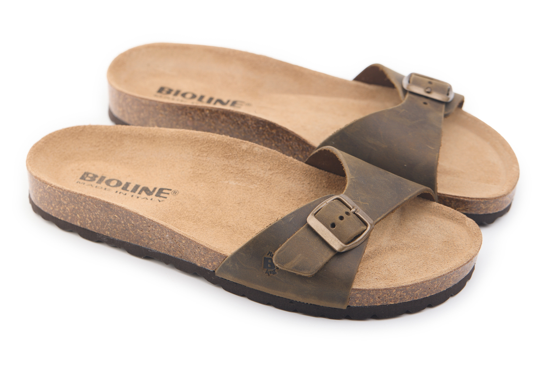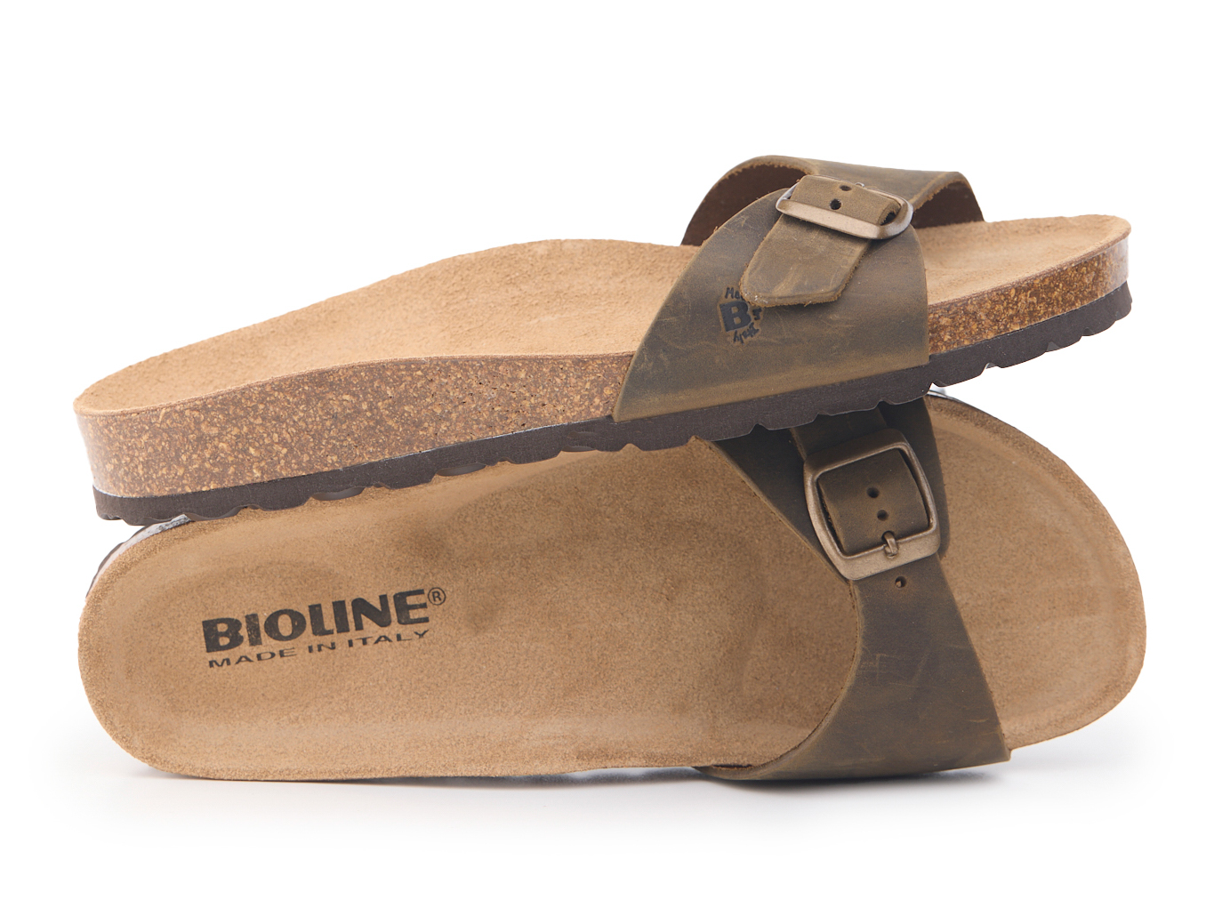 Pianella regolazione una fibbia con tomaia in pelle nabuk ingrassato senza cuciture, sottopiede in gomma-sughero rivestito in pelle e battistrada in EVA (etil vinil acetato) 8mm.