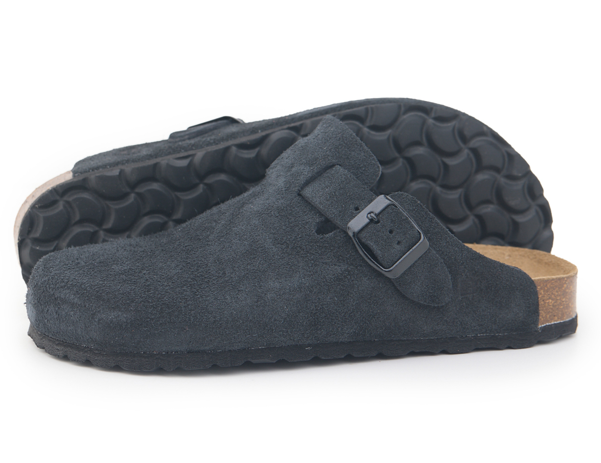 Sabot con tomaia in pelle crosta bovina scamosciata spessore 2.8-3 senza cuciture. Regolabile, con cinturino dotato di fibbia in metallo.