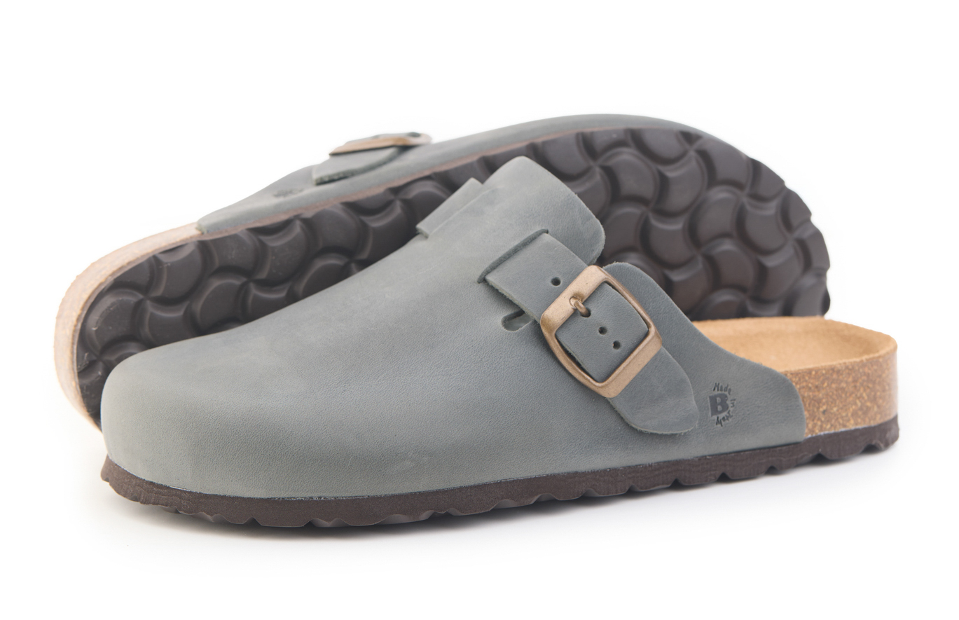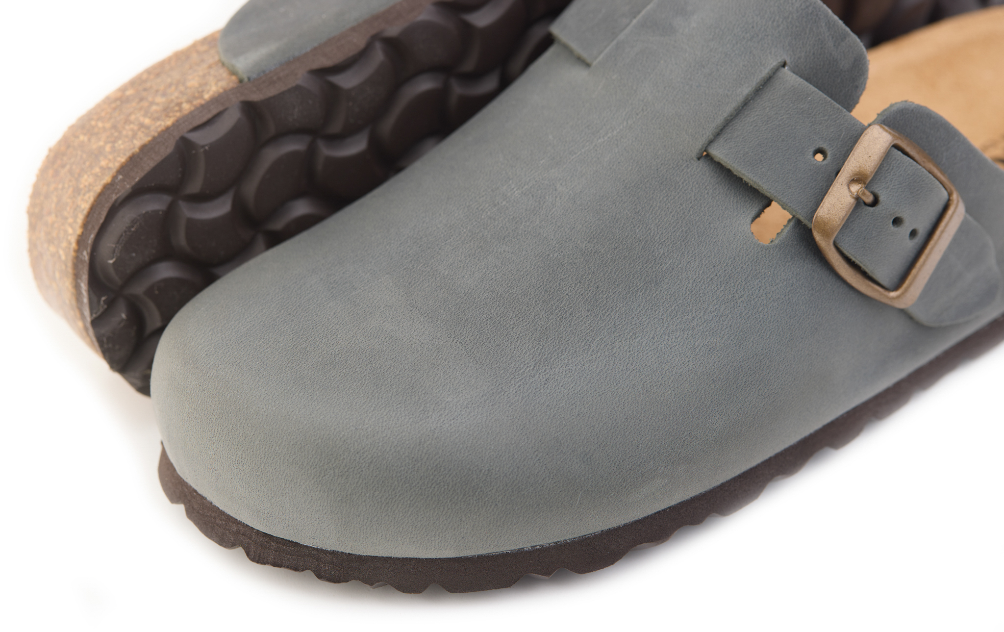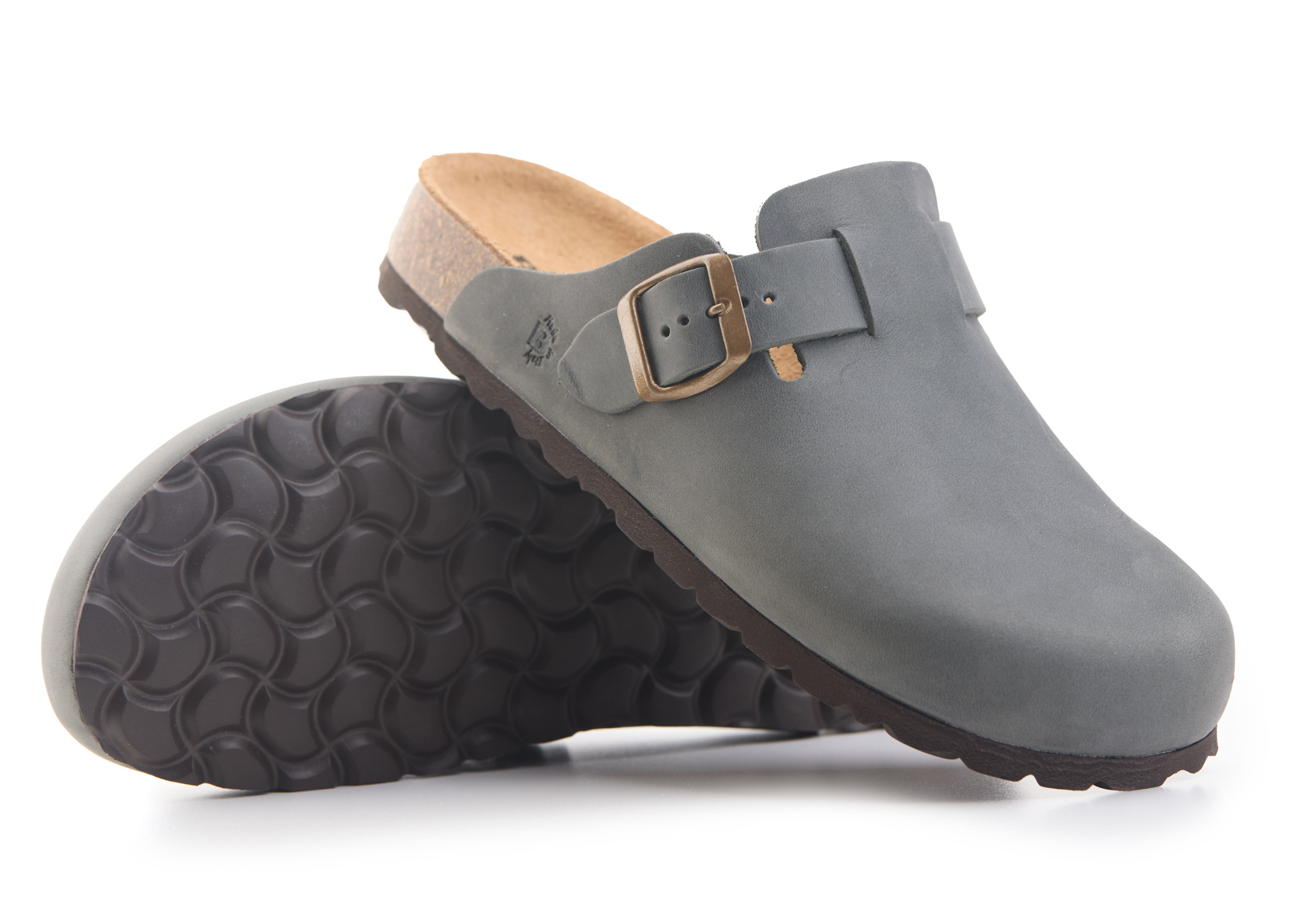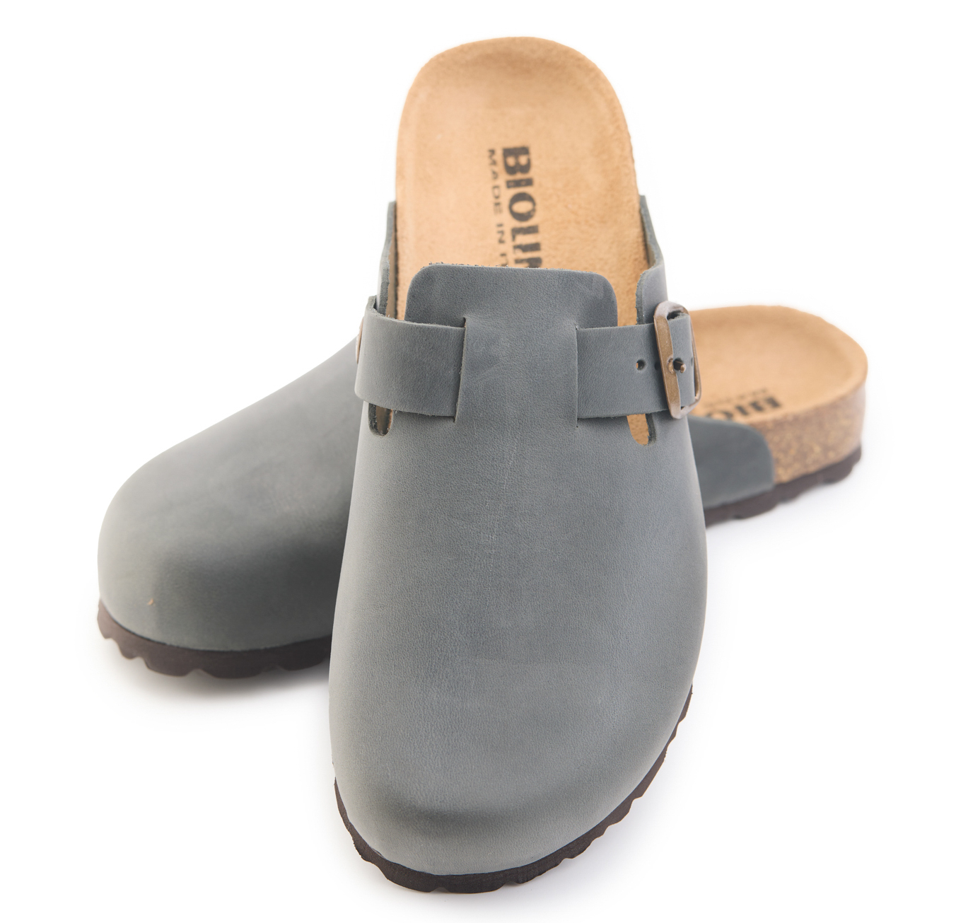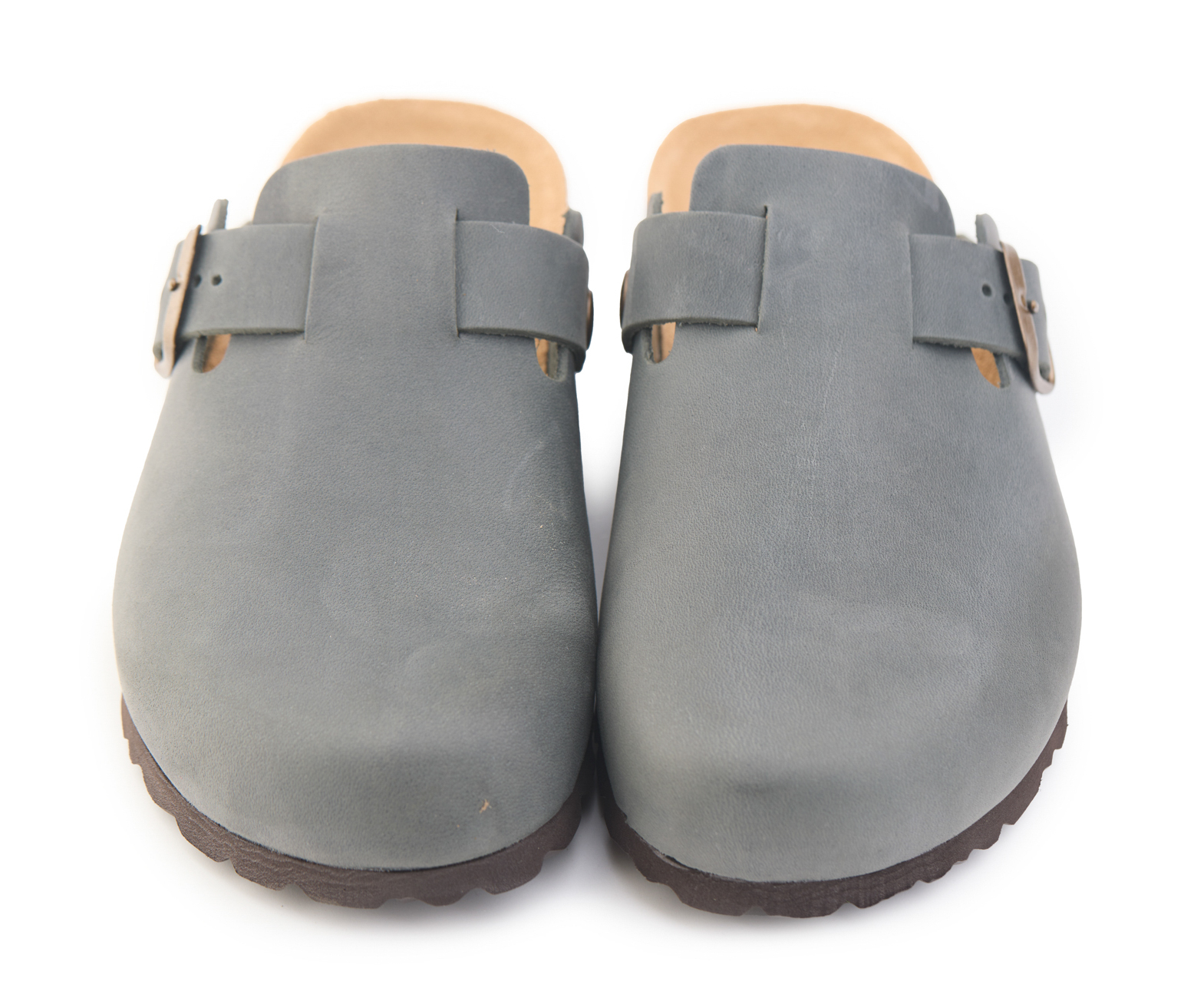Sabot con tomaia in pelle nabuk ingrassato lavorato senza cuciture. Regolabile, con cinturino dotato di fibbia in metallo.
