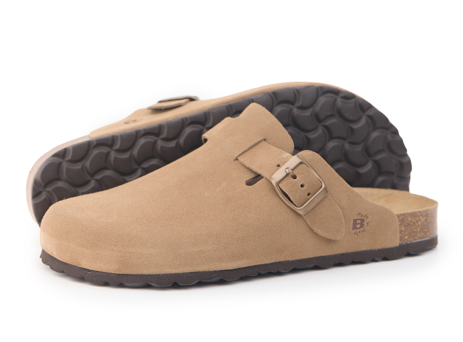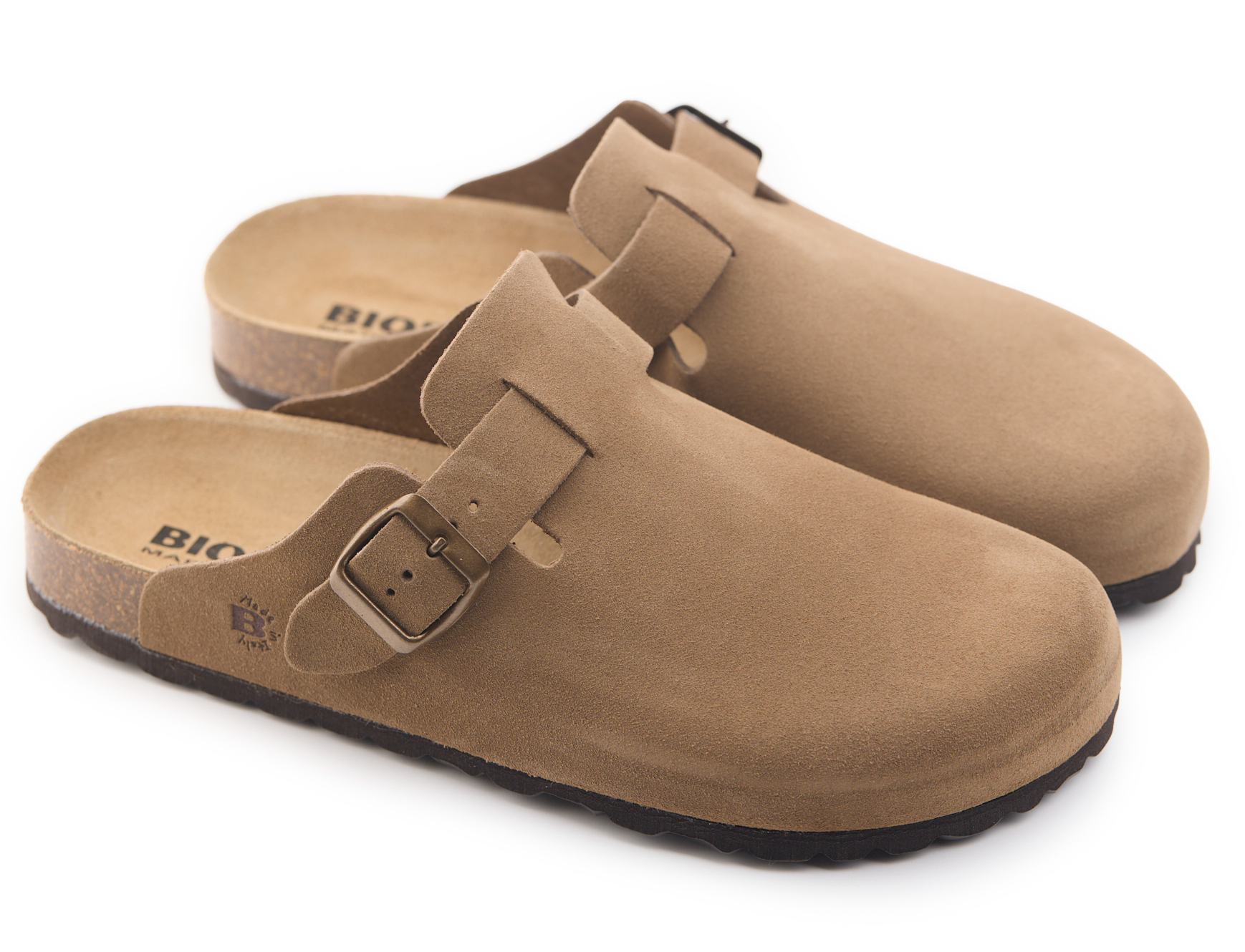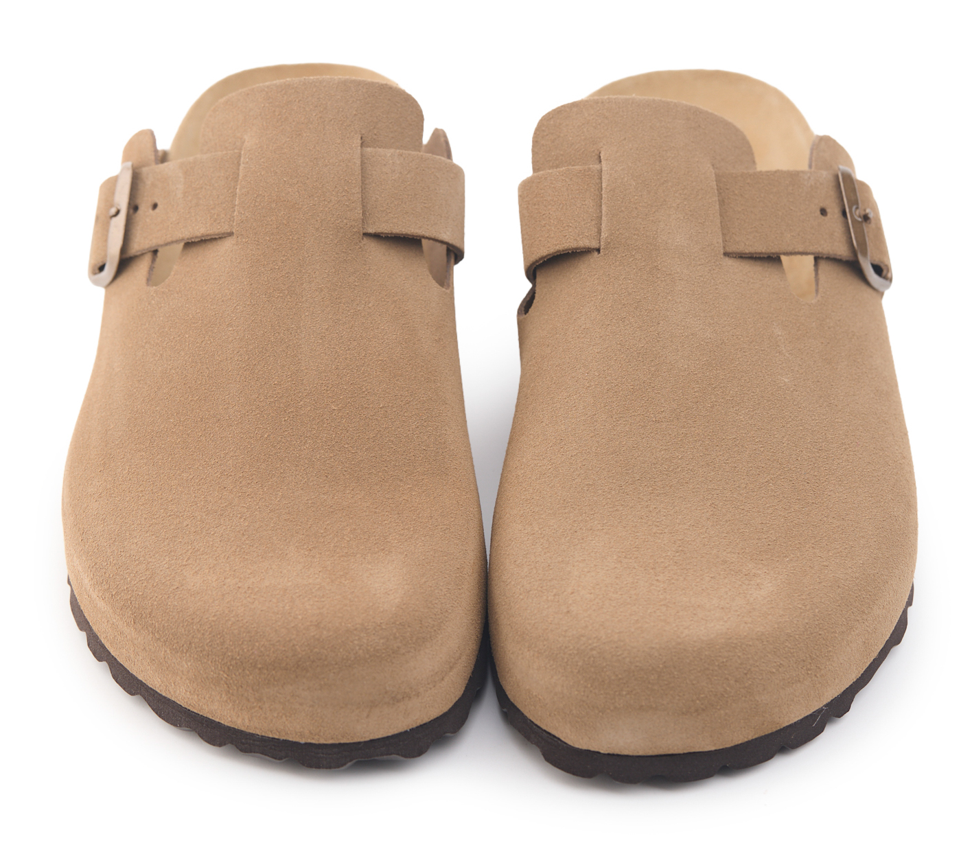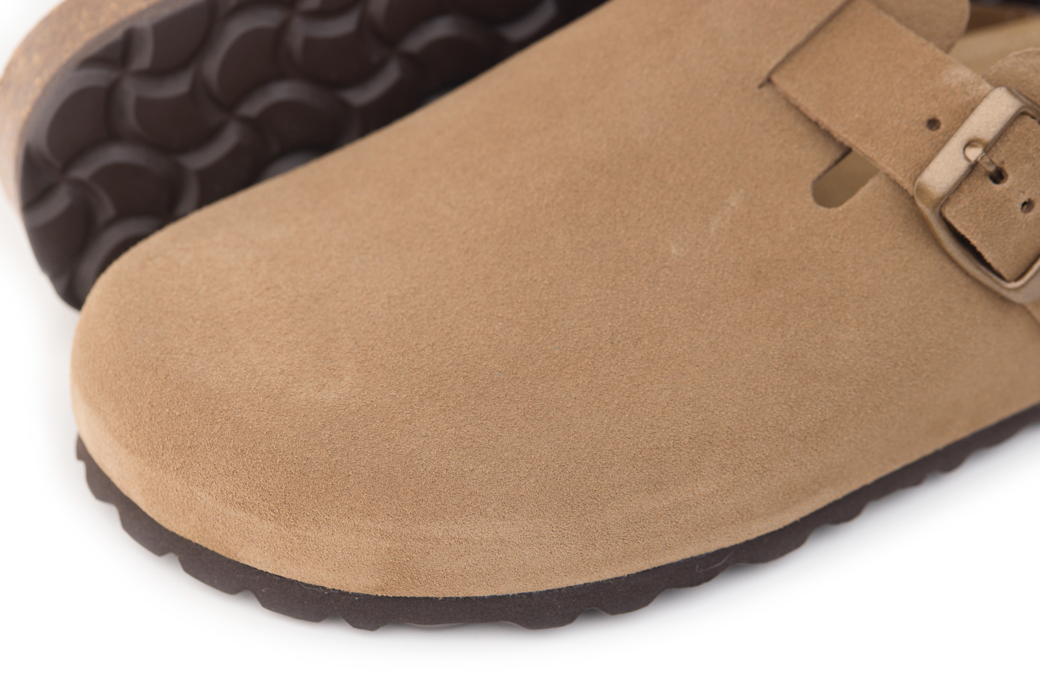 Sabot con tomaia in pelle crosta bovina scamosciata senza cuciture. Regolabile, con cinturino dotato di fibbia in metallo.