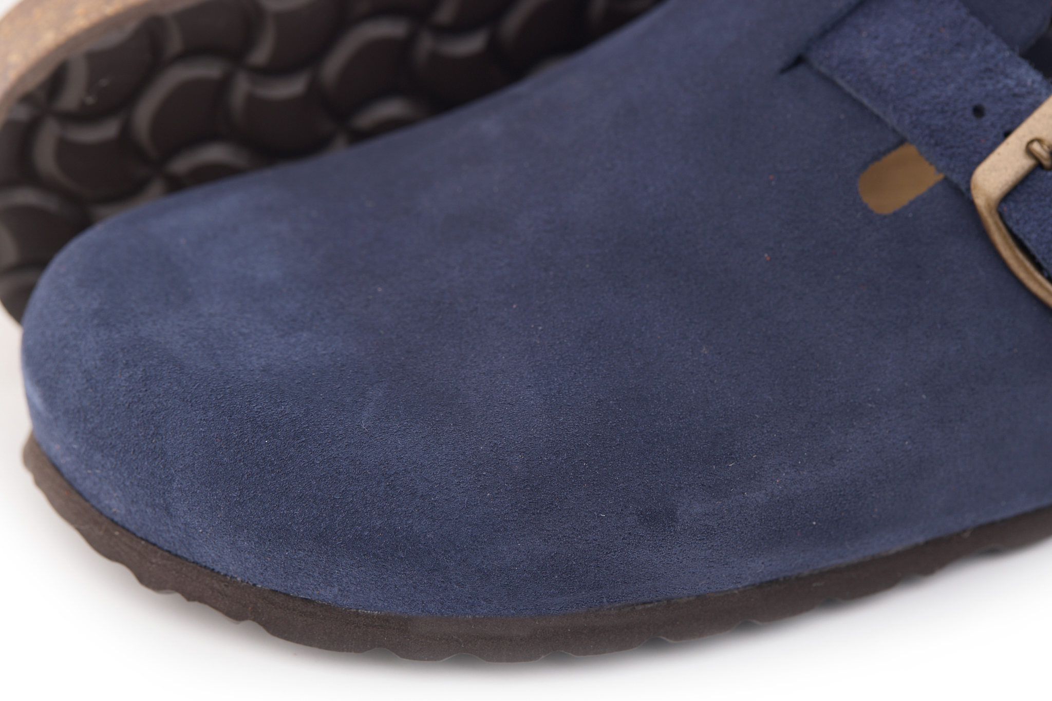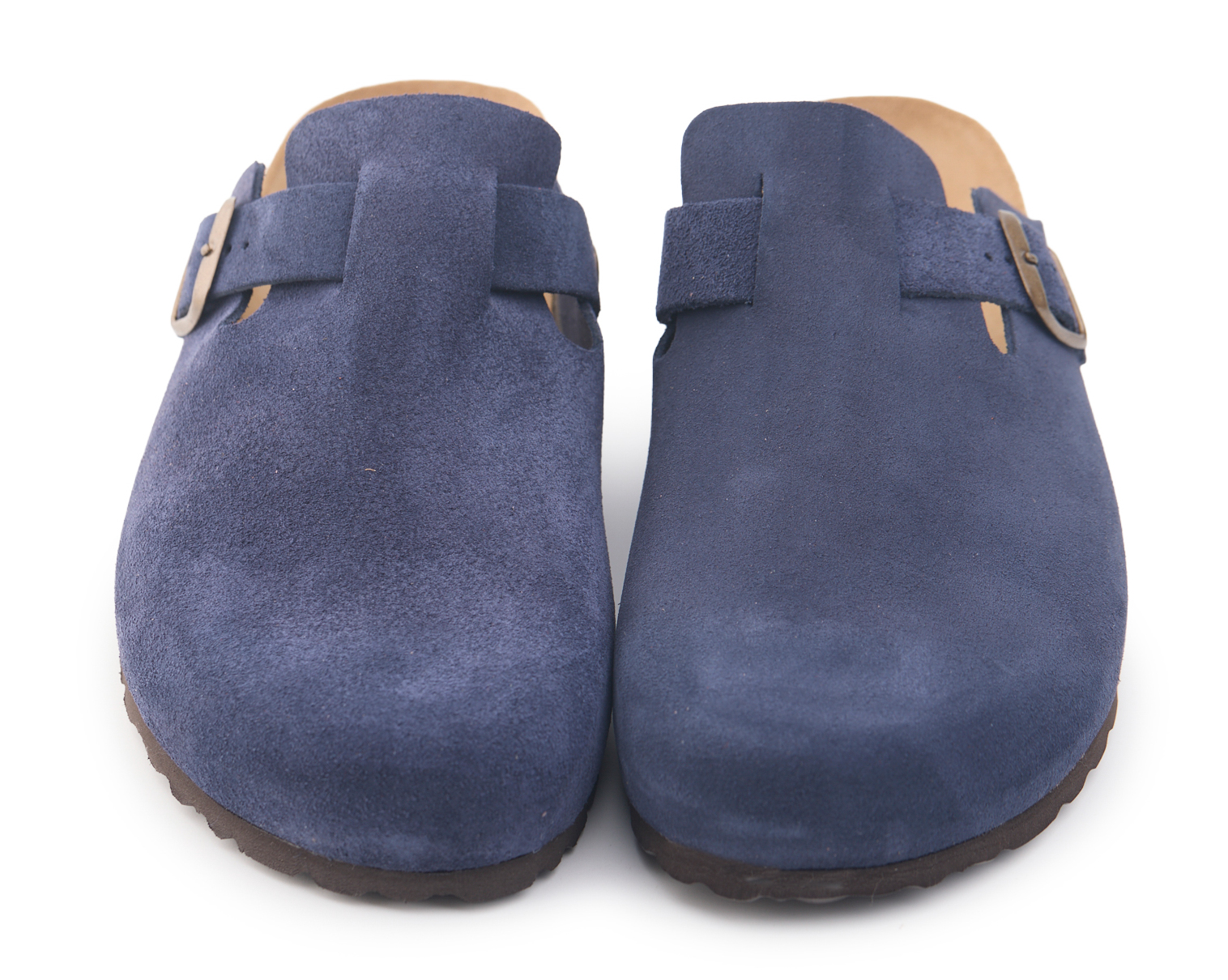 Sabot con tomaia in pelle crosta bovina scamosciata senza cuciture. Regolabile, con cinturino dotato di fibbia in metallo.