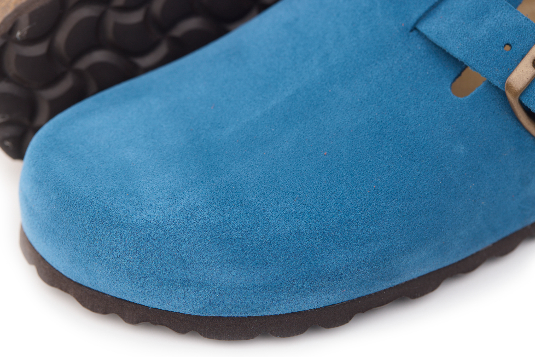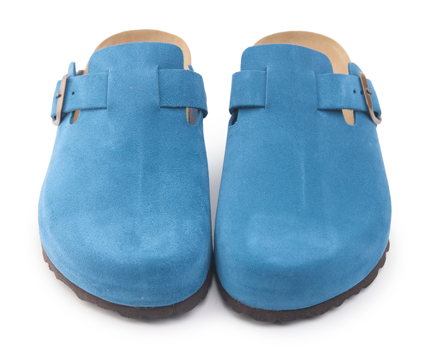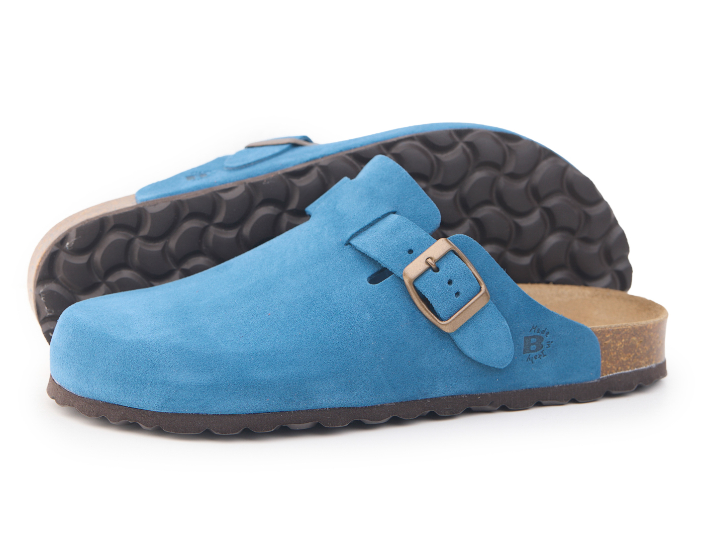 Sabot con tomaia in pelle crosta bovina scamosciata senza cuciture. Regolabile, con cinturino dotato di fibbia in metallo.