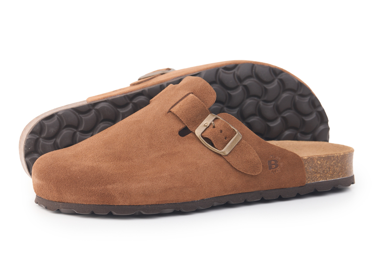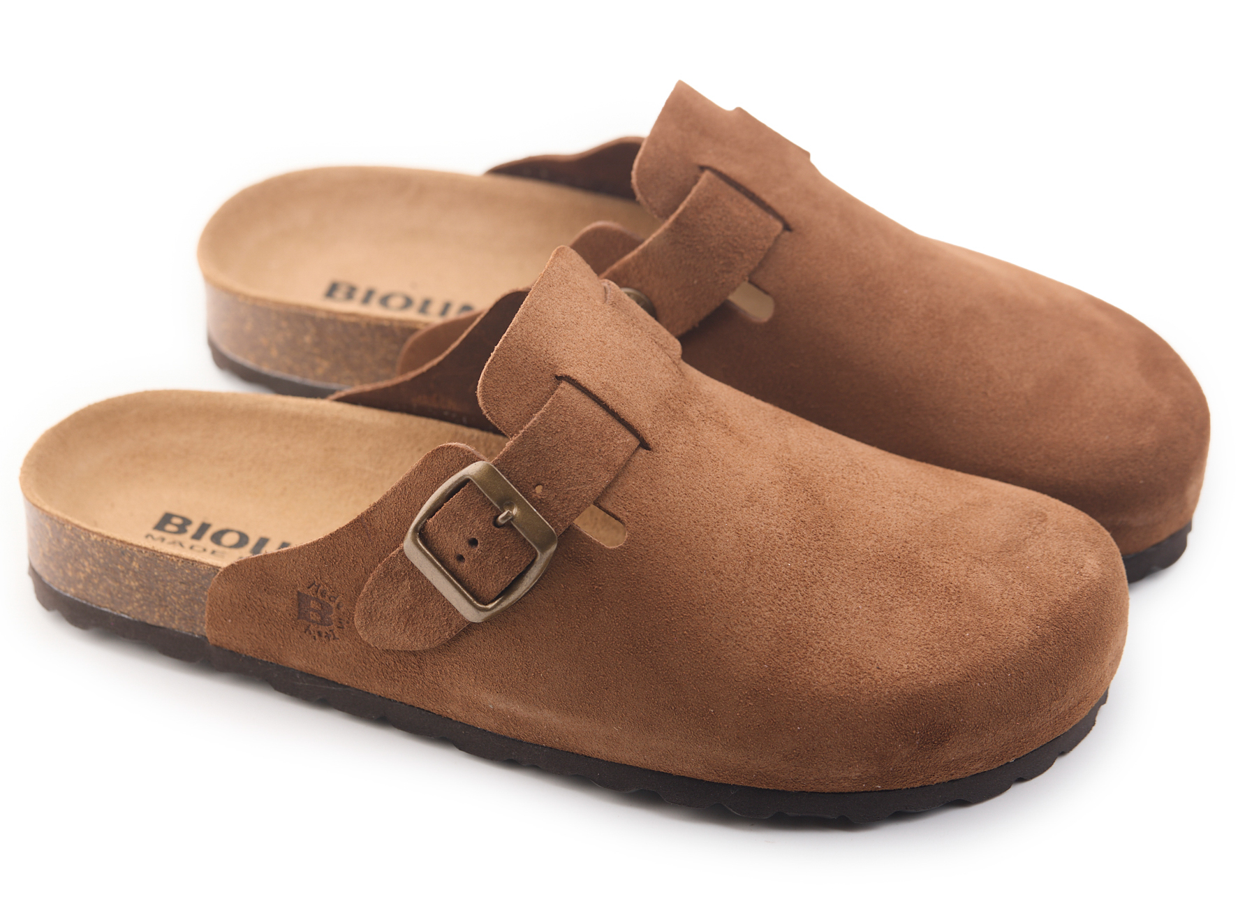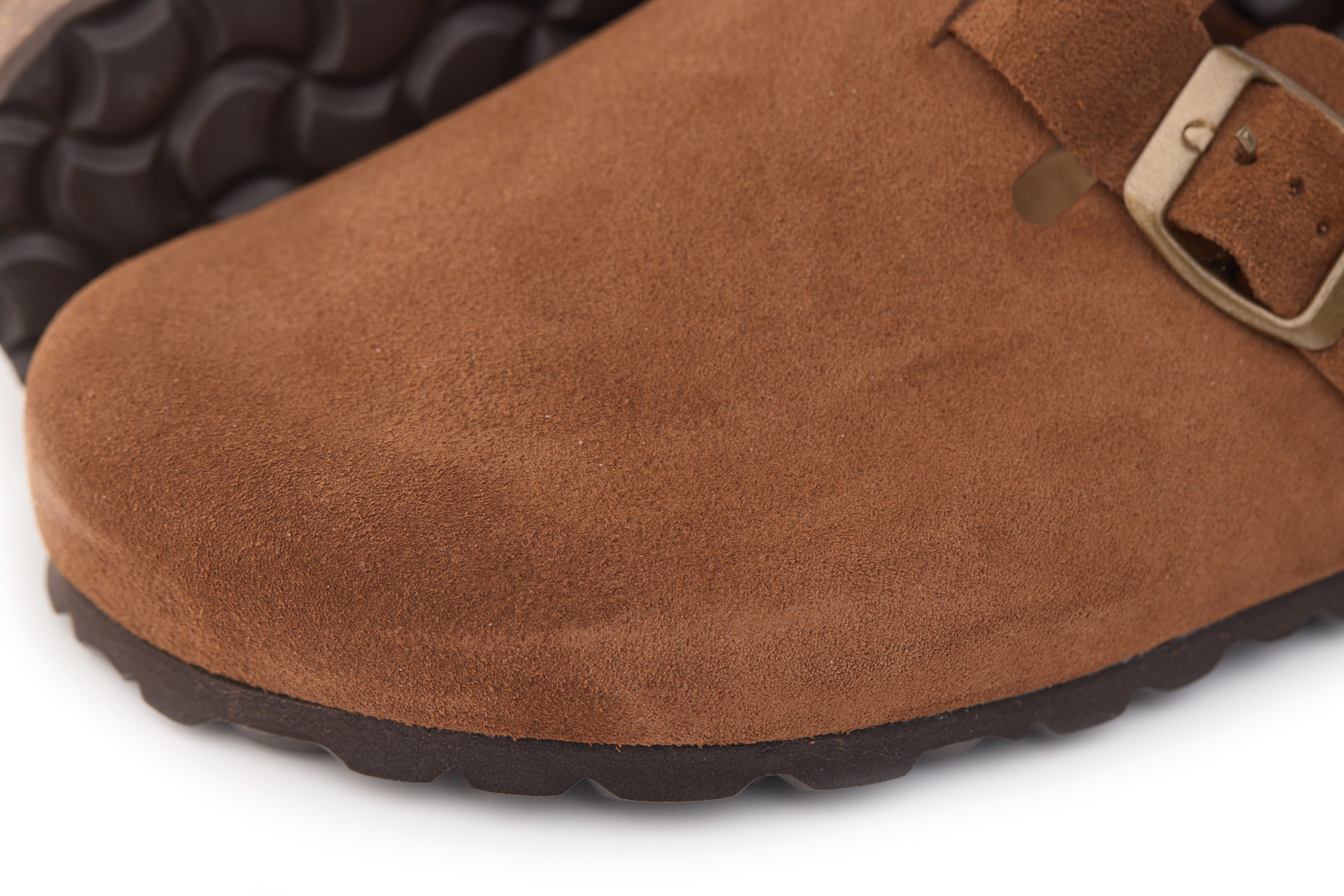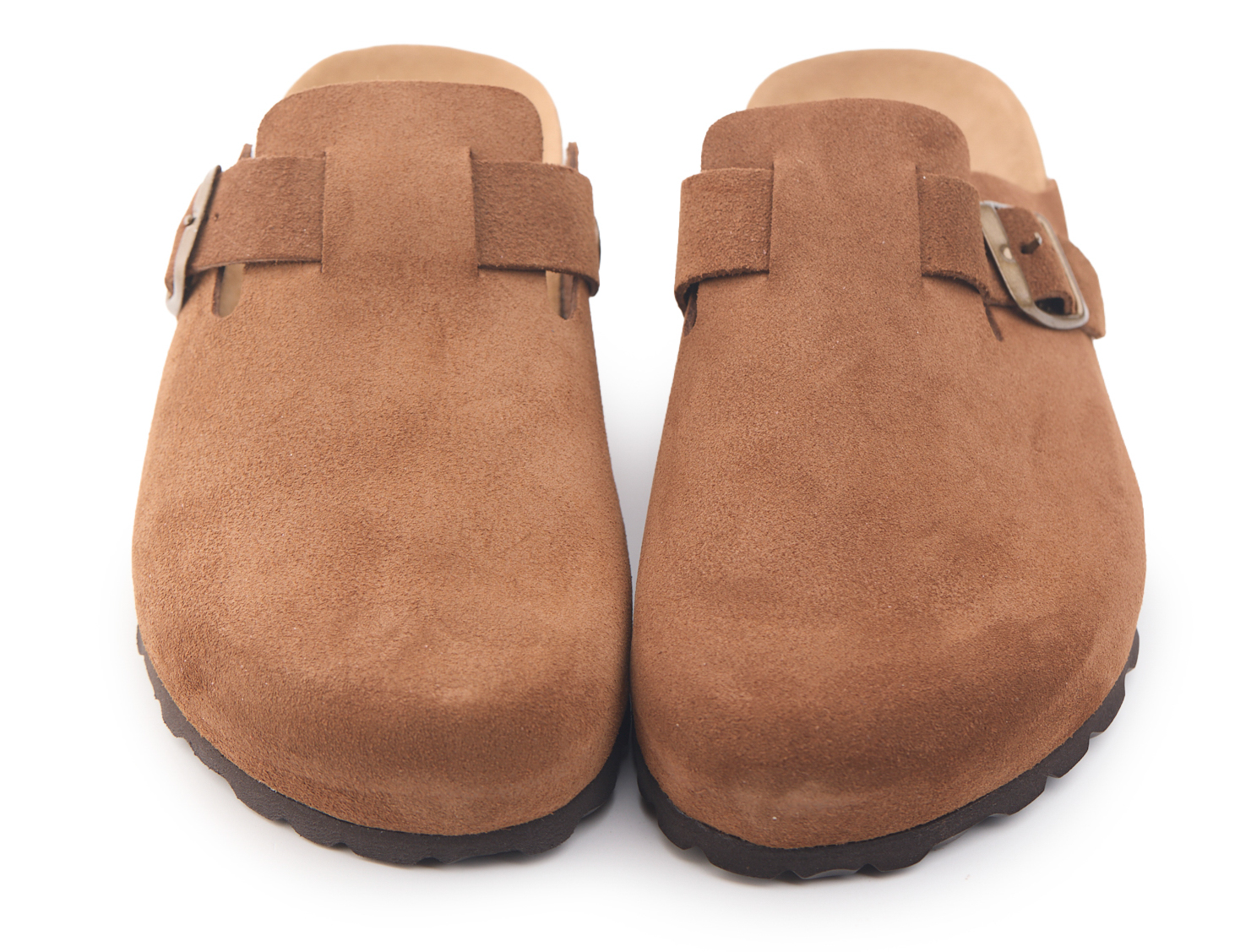 Sabot con tomaia in pelle crosta bovina scamosciata senza cuciture. Regolabile, con cinturino dotato di fibbia in metallo.
