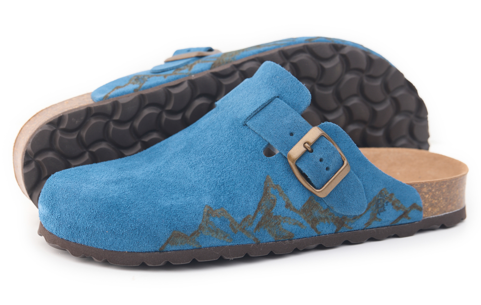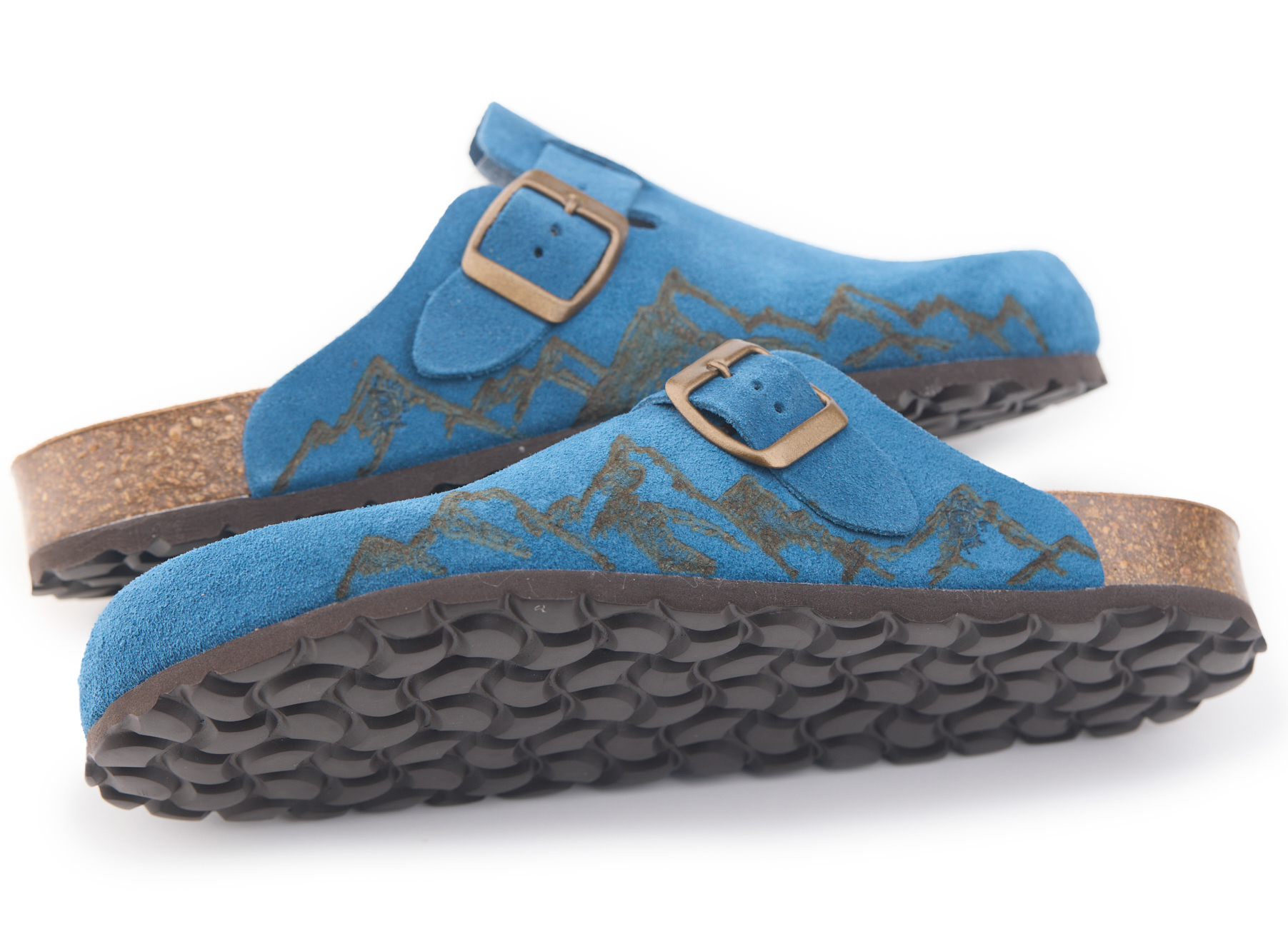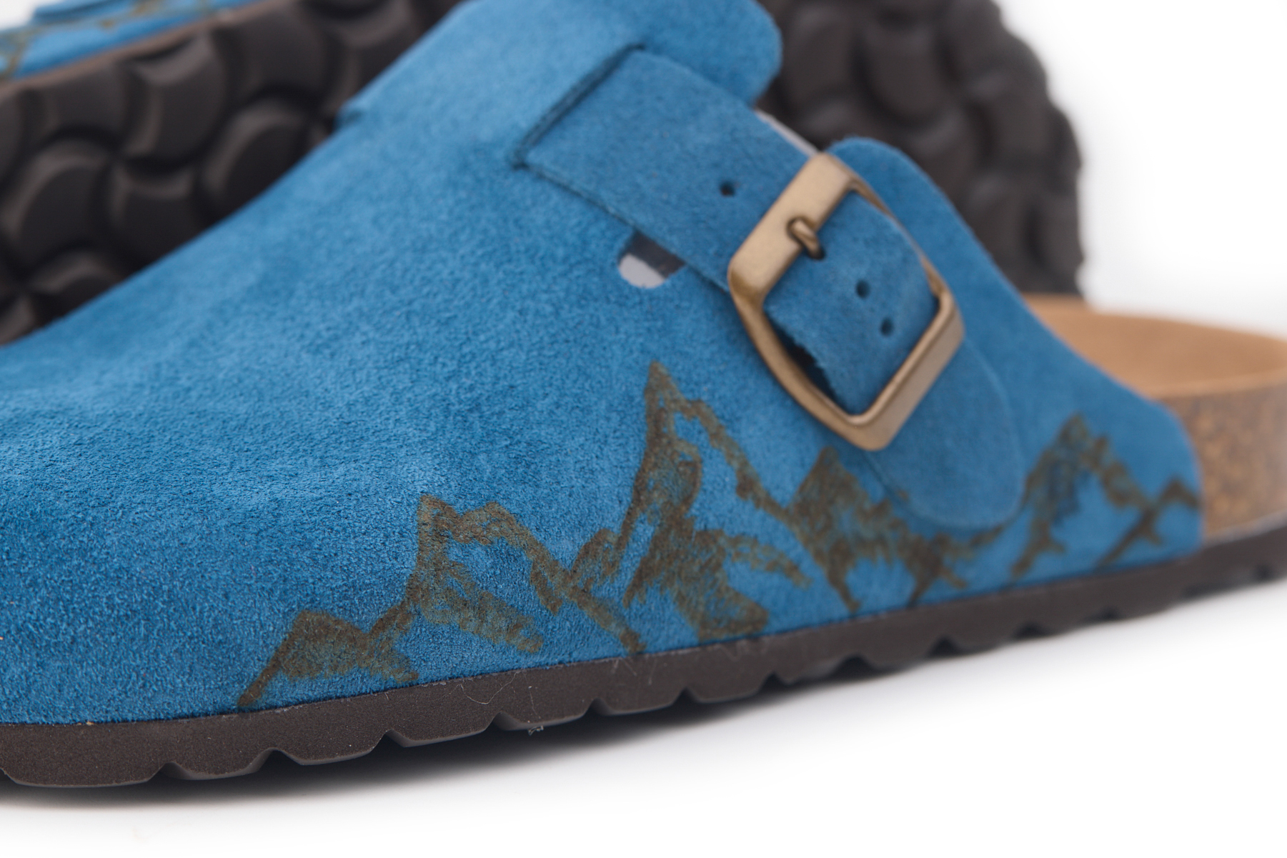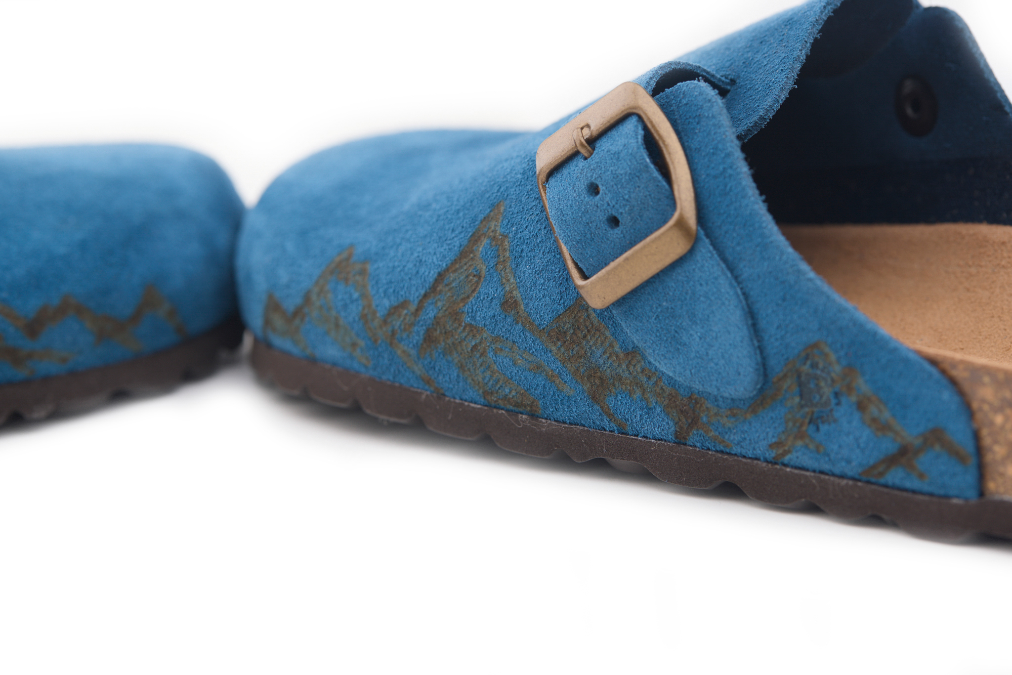 Sabot con tomaia in pelle crosta bovina scamosciata lavorato senza cuciture con montagne pirografate a mano da AC Longboards. Regolabile, con cinturino dotato di fibbia in metallo.