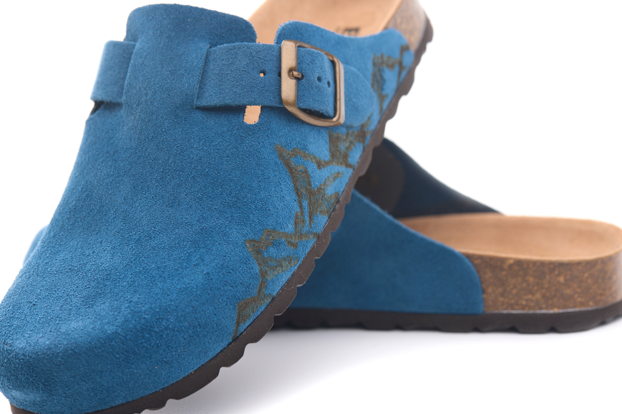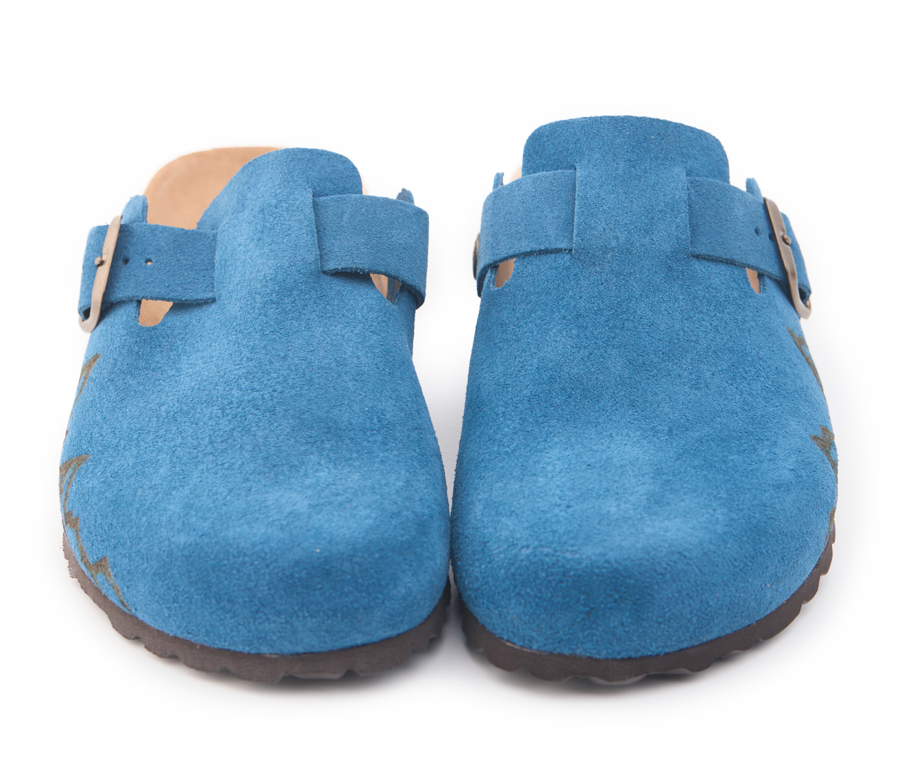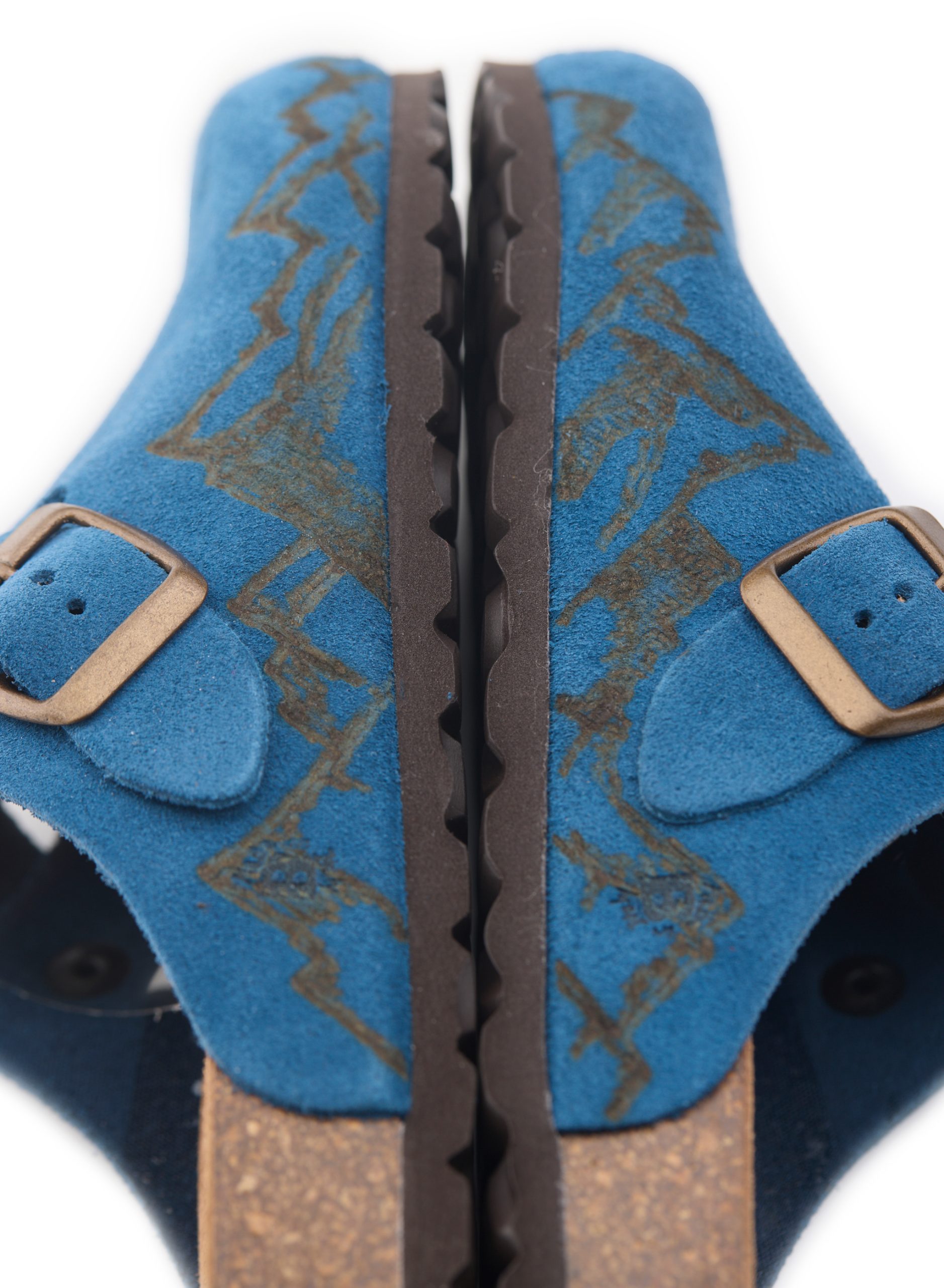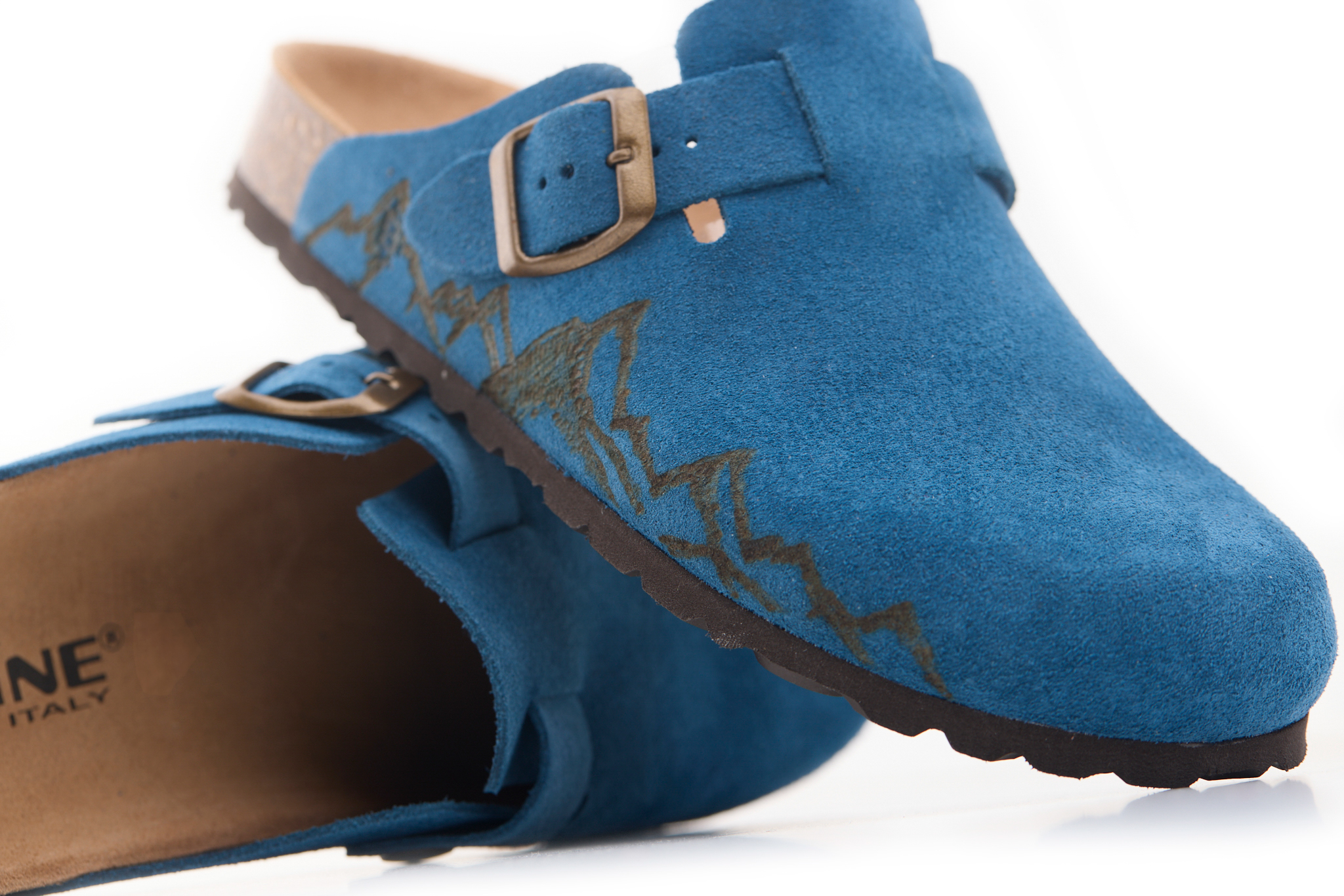 Sabot con tomaia in pelle crosta bovina scamosciata lavorato senza cuciture con montagne pirografate a mano da AC Longboards. Regolabile, con cinturino dotato di fibbia in metallo.