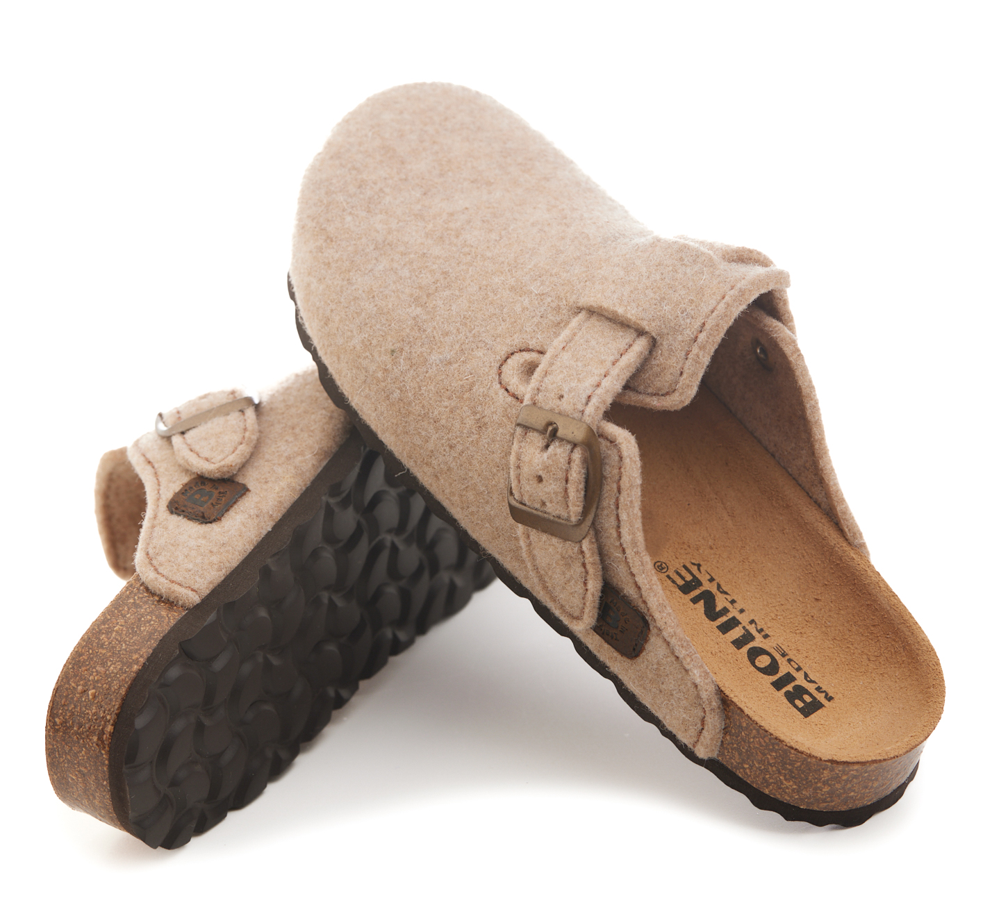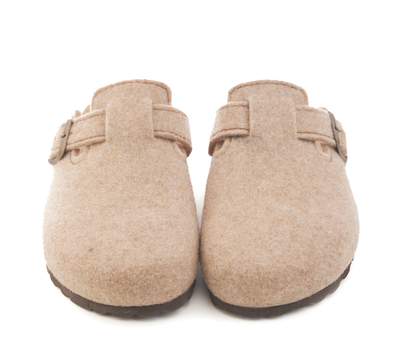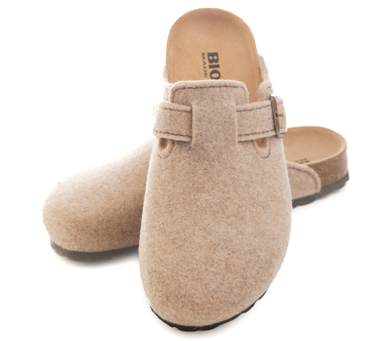 Sabot con tomaia in lana merinos. Regolabile, con cinturino dotato di fibbia in metallo.