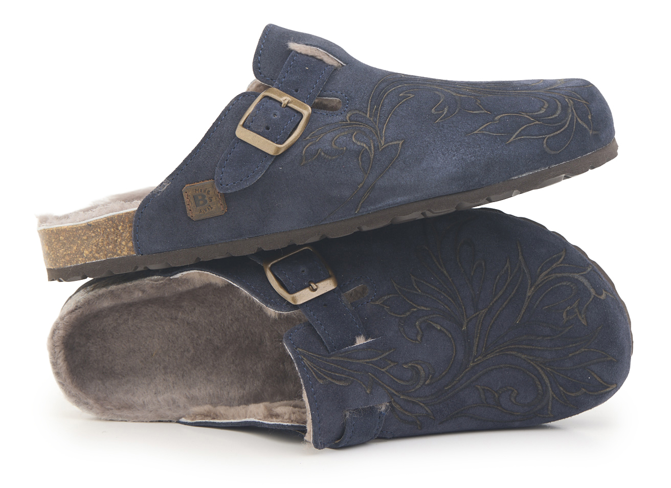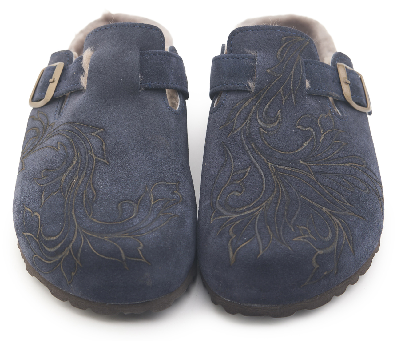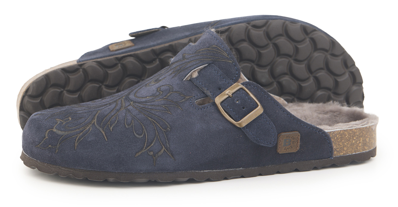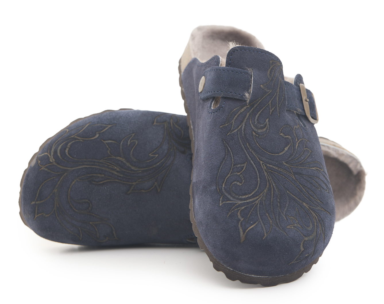 Sabot con tomaia in pelle scamosciata, fodera in vero montone e disegno flower pirografata a mano da A.C Longboards. Regolabile, con cinturino dotato di fibbia in metallo.