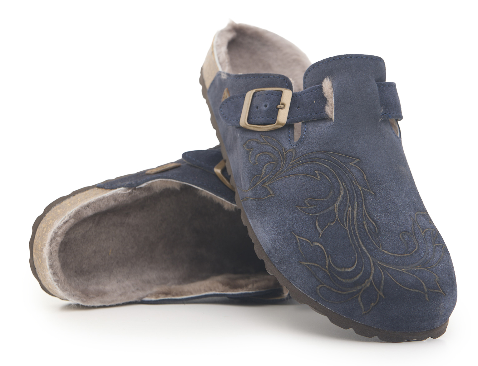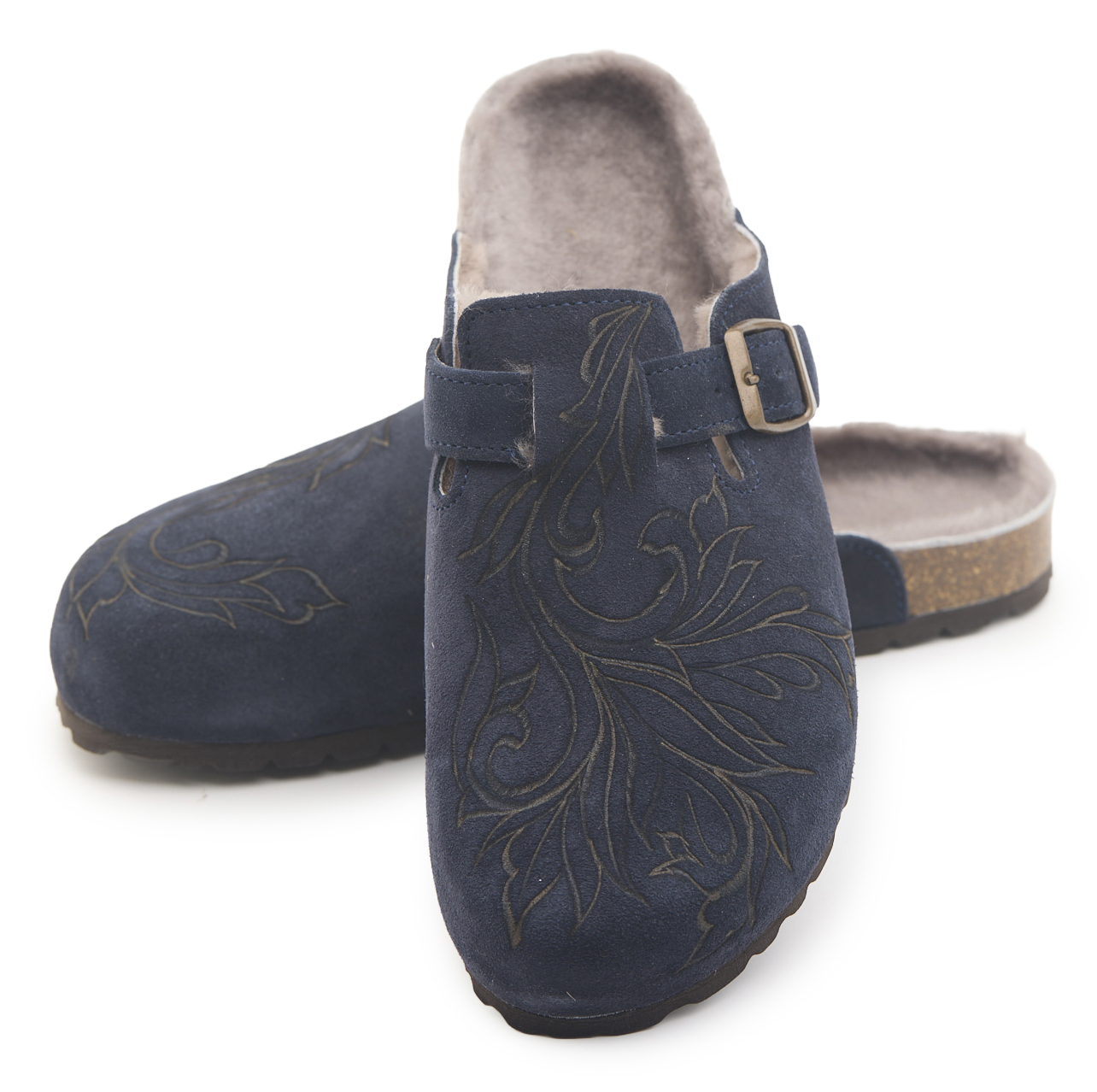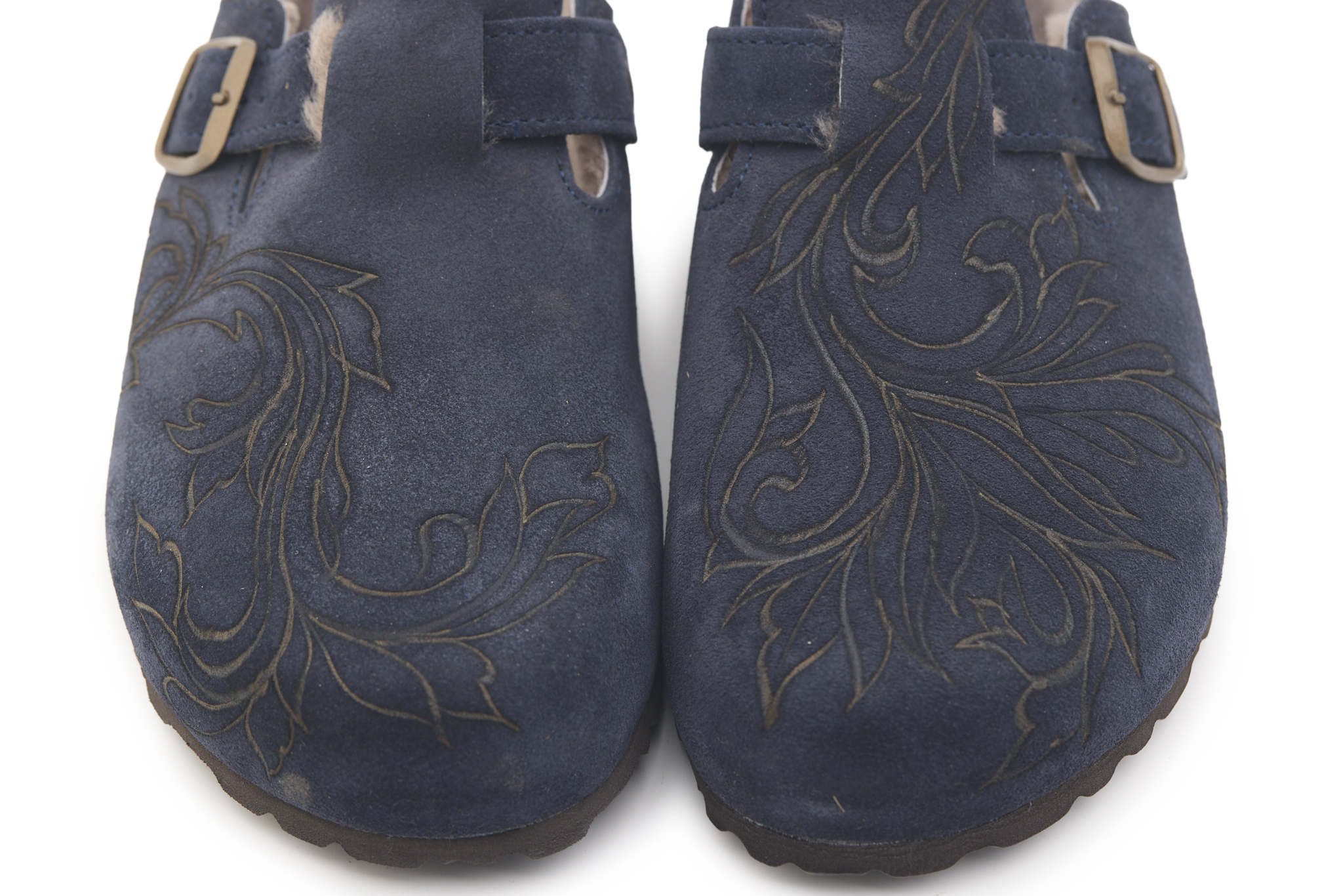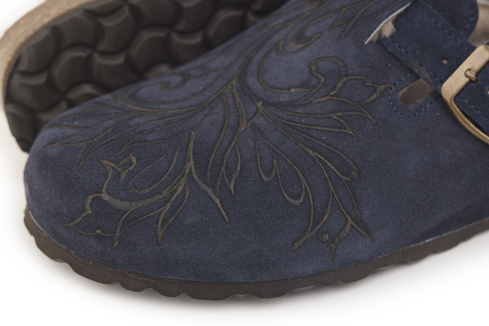 Sabot con tomaia in pelle scamosciata, fodera in vero montone e disegno flower pirografata a mano da A.C Longboards. Regolabile, con cinturino dotato di fibbia in metallo.