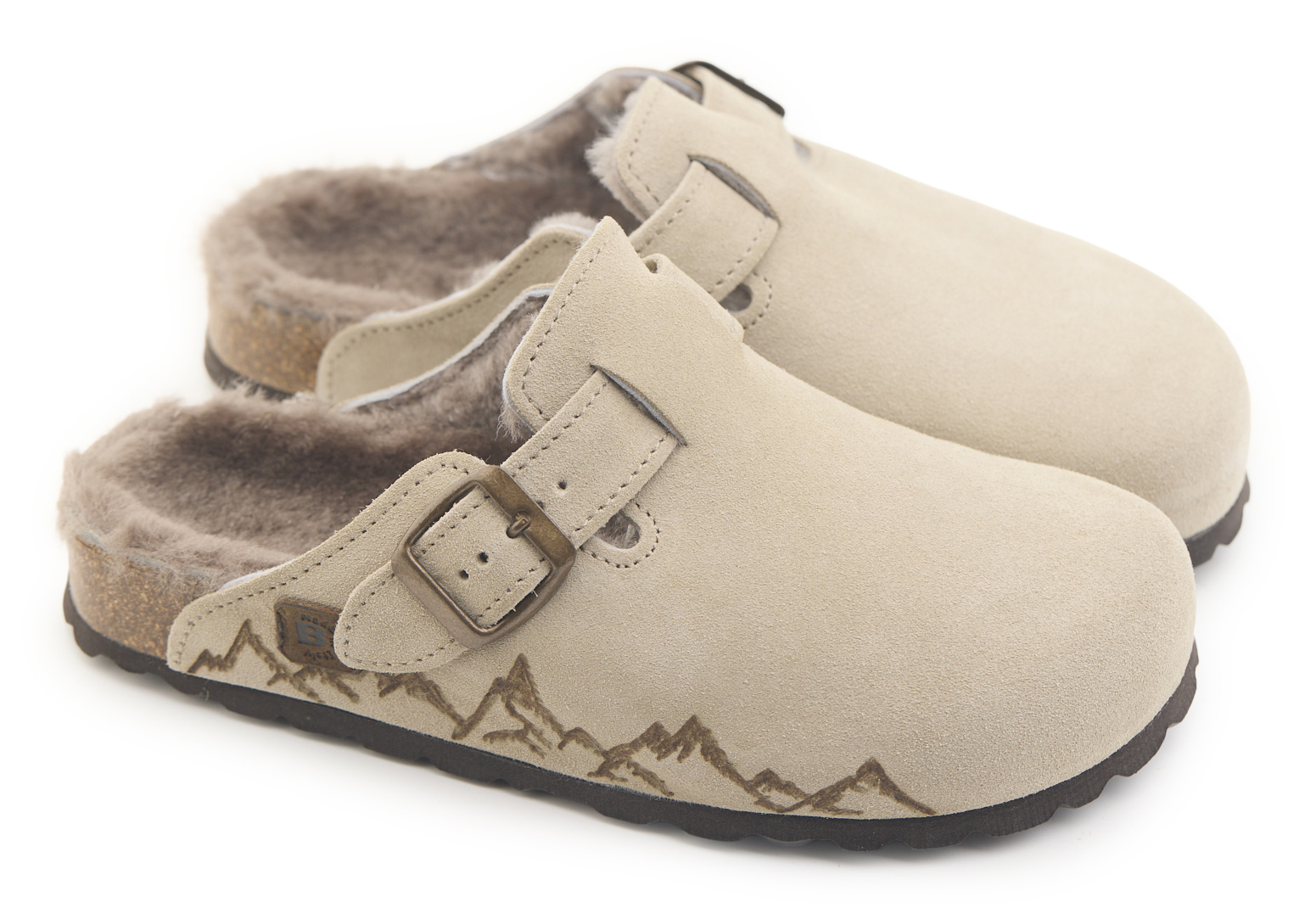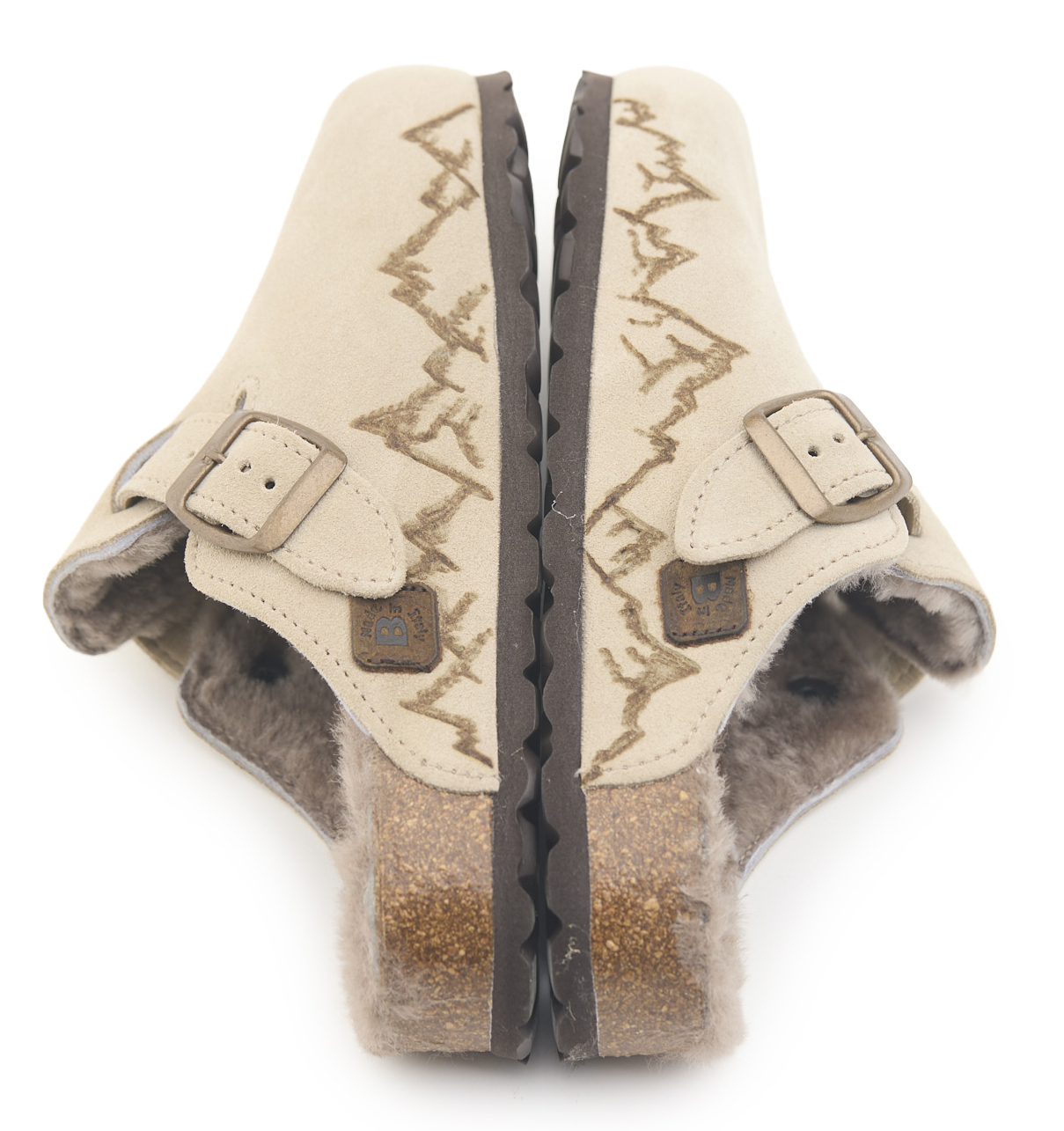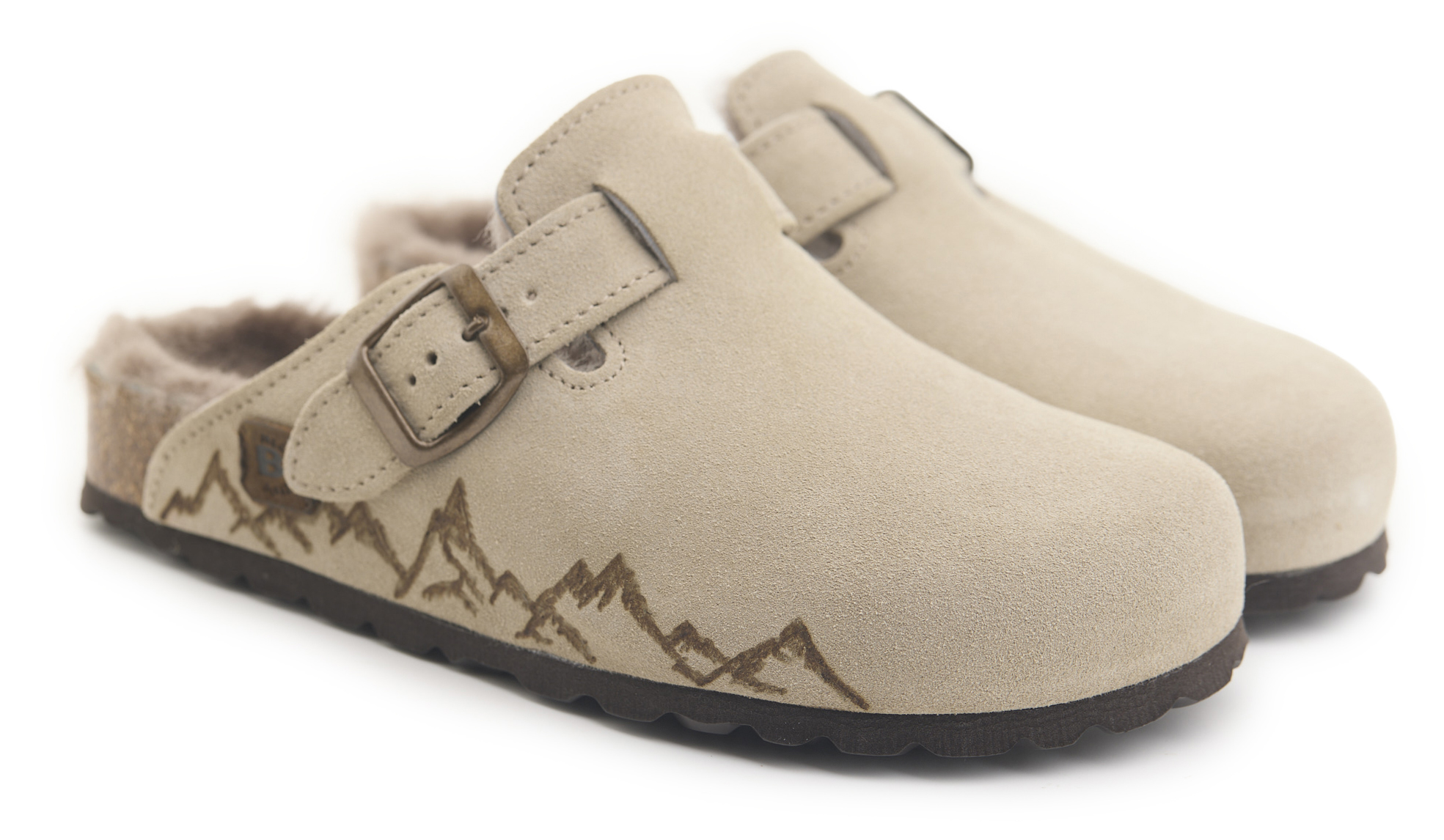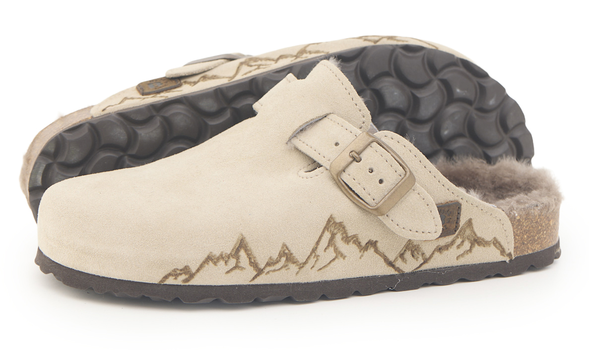 Sabot con tomaia in pelle scamosciata, fodera in vero montone e disegno montagne pirografate a mano da AC Longboars. Regolabile, con cinturino dotato di fibbia in metallo.
