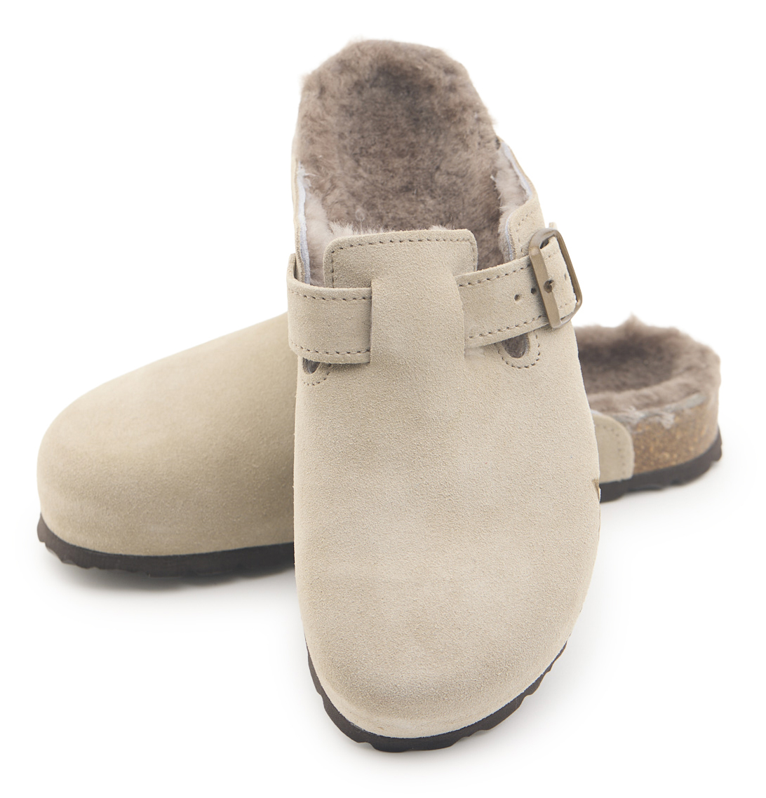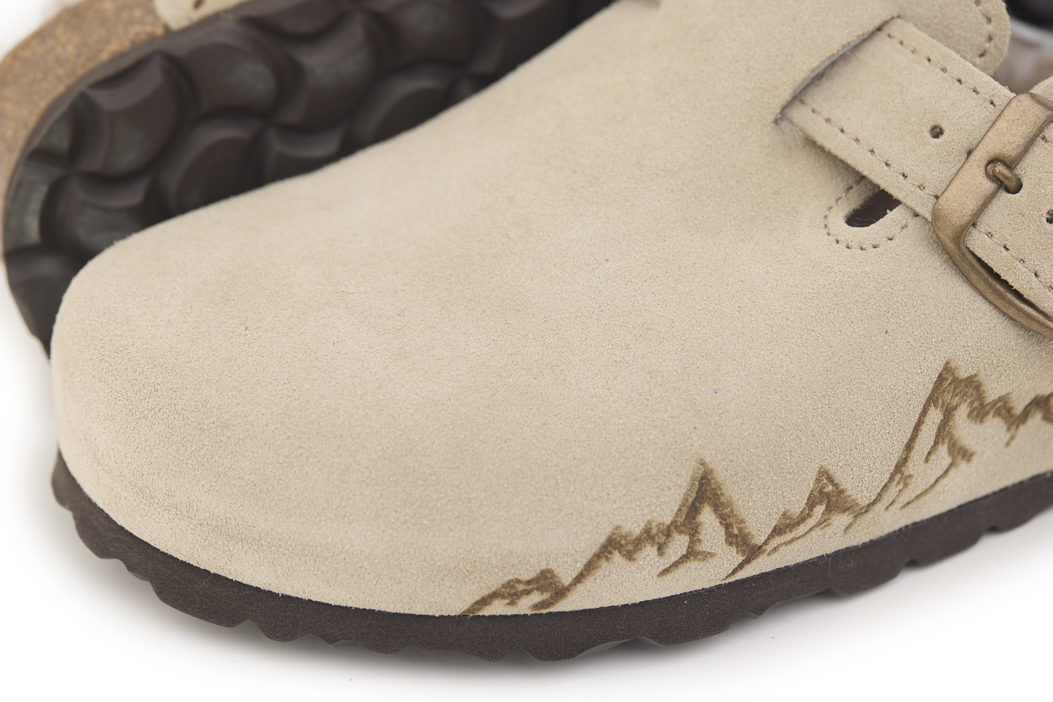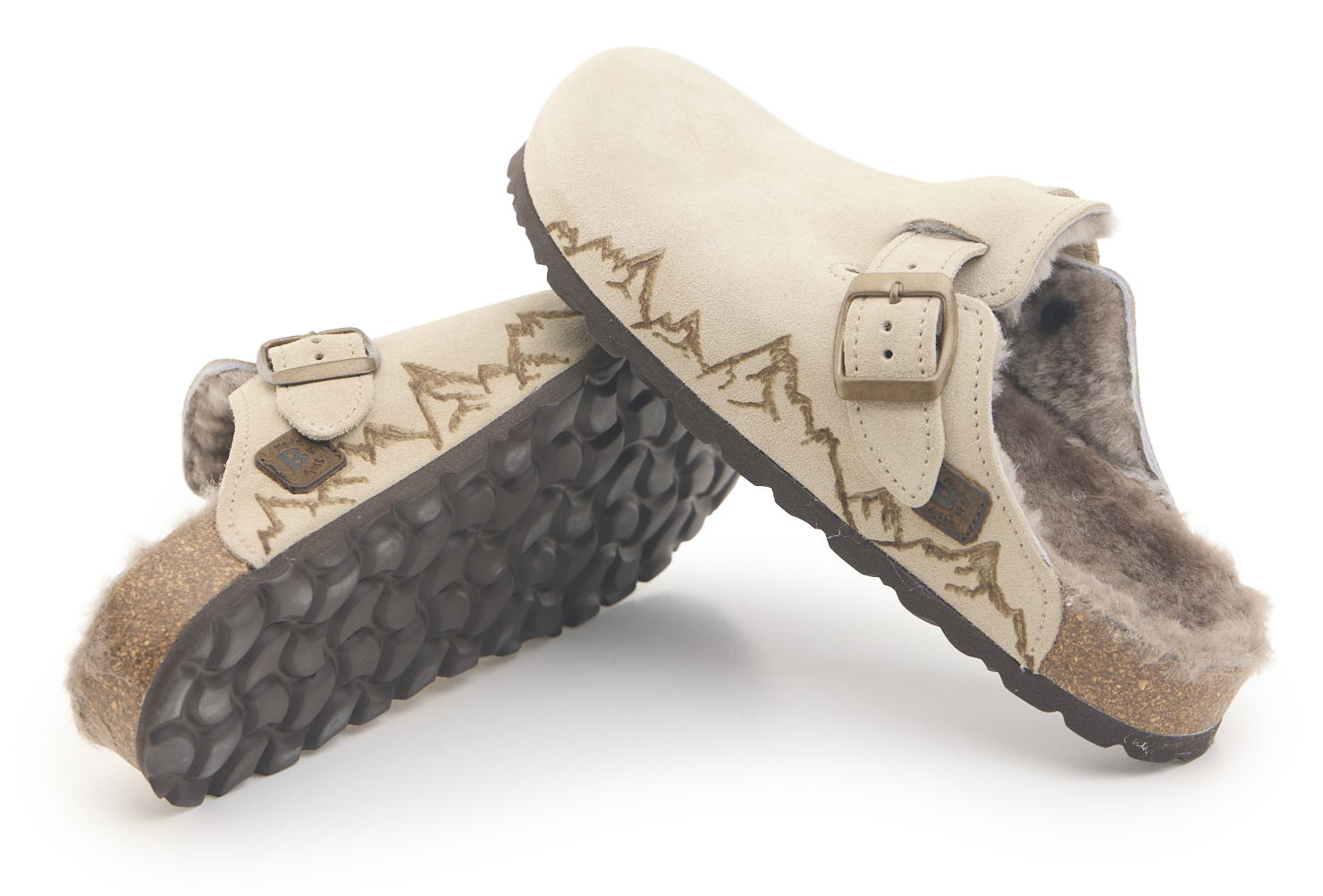 Sabot con tomaia in pelle scamosciata, fodera in vero montone e disegno montagne pirografate a mano da AC Longboars. Regolabile, con cinturino dotato di fibbia in metallo.