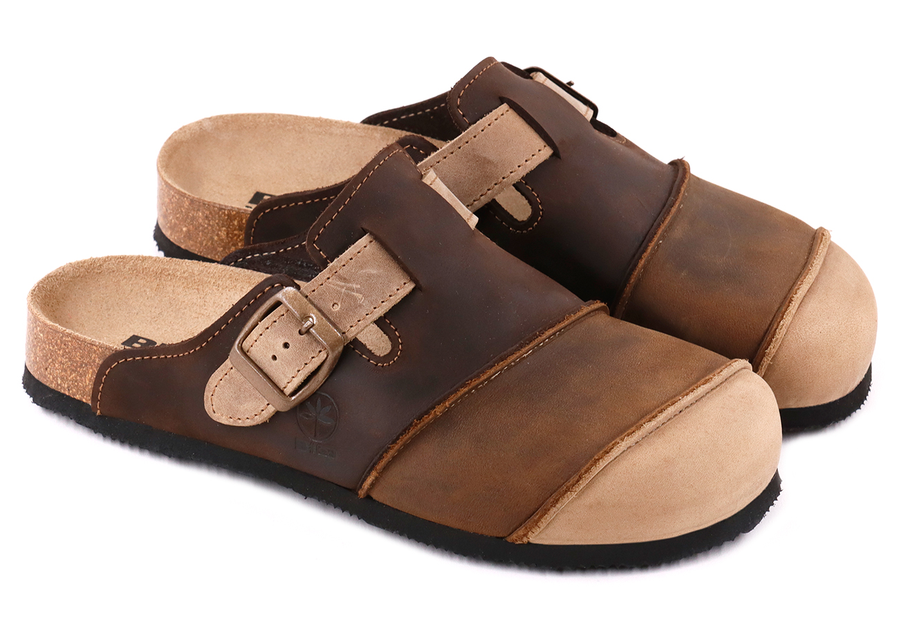 Sabot tri-colore con tomaia in pelle nabuk ingrassato lavorato con cuciture. Regolabile, con cinturino dotato di fibbia in metallo.