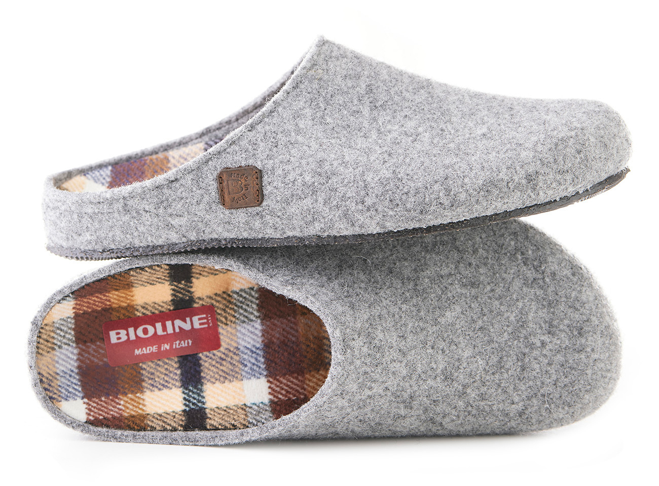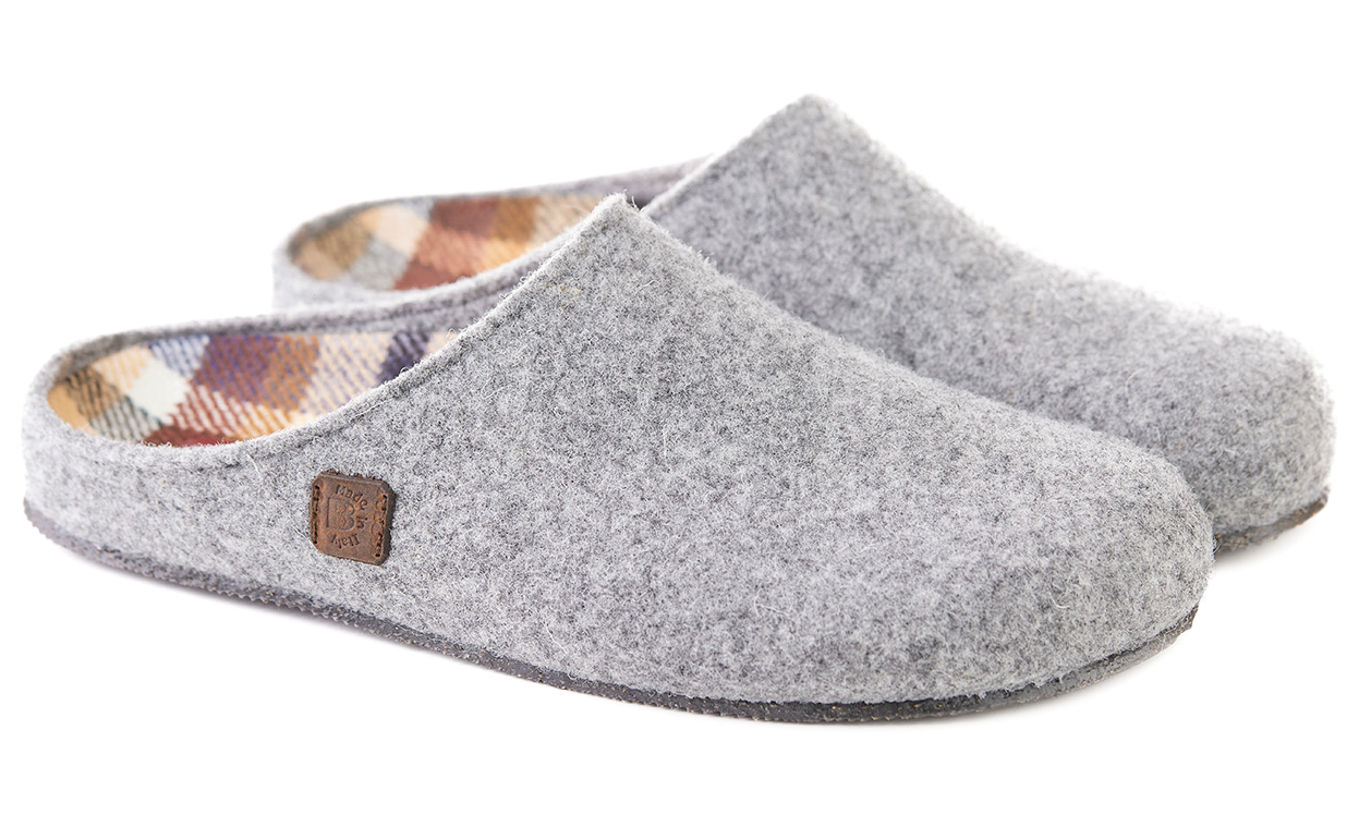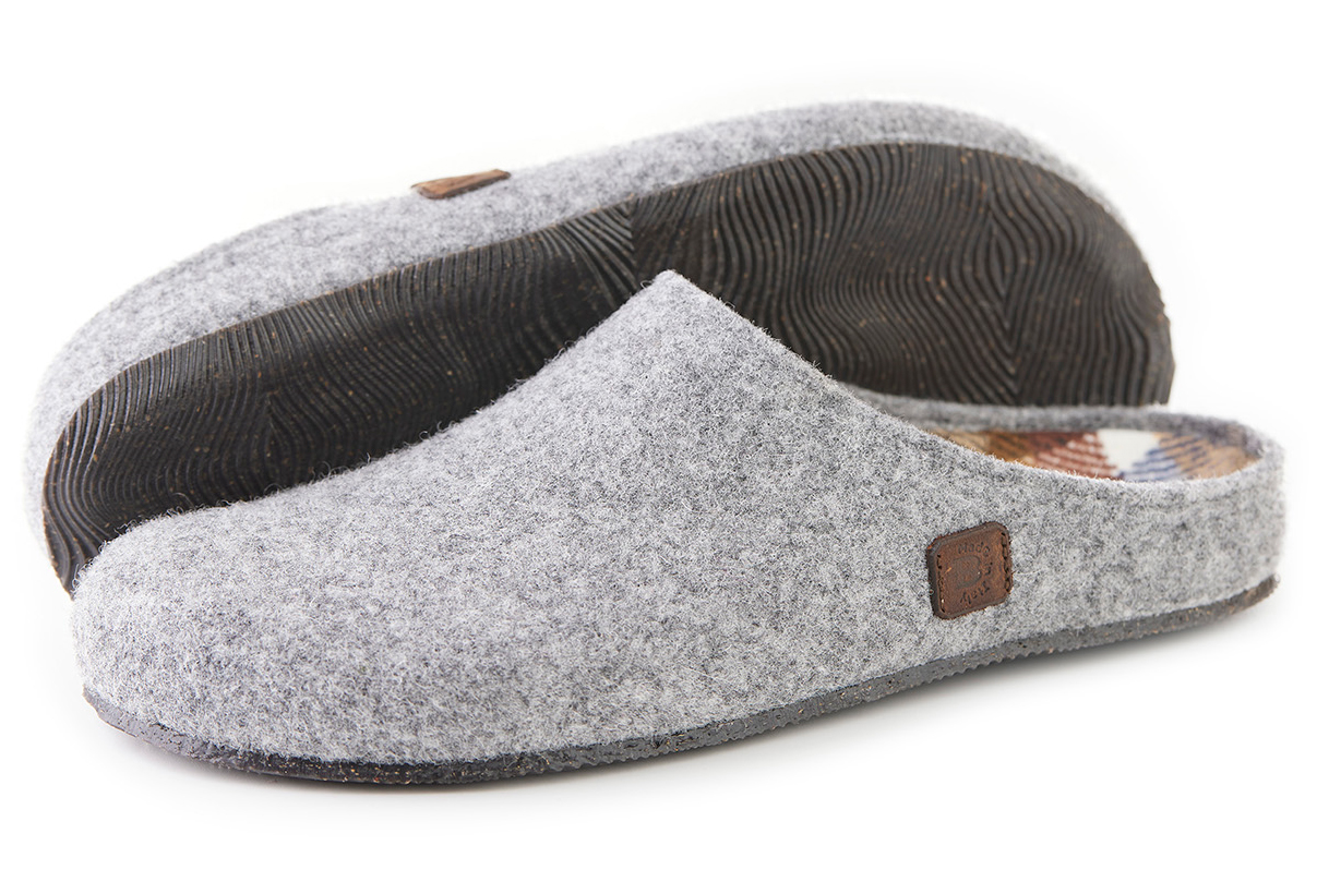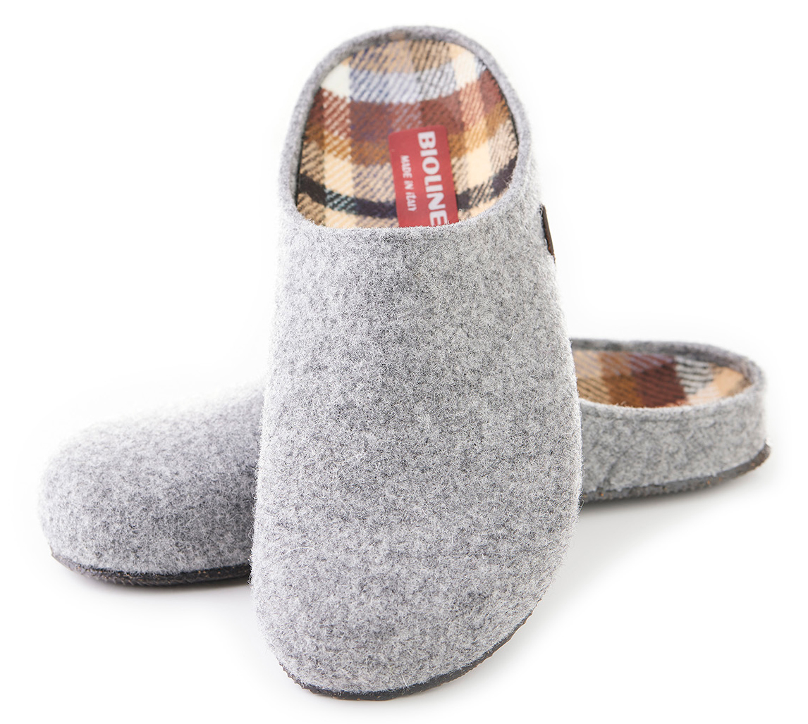 Pantofola-sabot con tomaia in feltro di lana merinos con sottopiede anatomico estraibile gomma-sughero foderato in lana stampa scozzese, battistrada 4mm con mescola in materiale termoplastico.