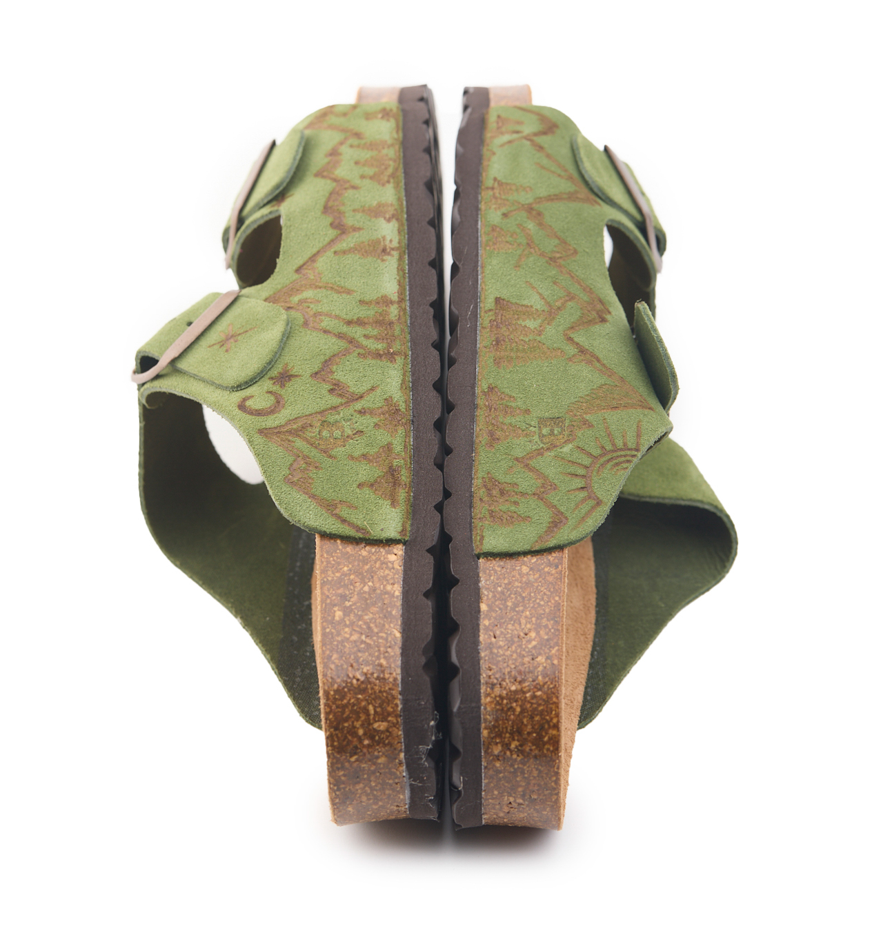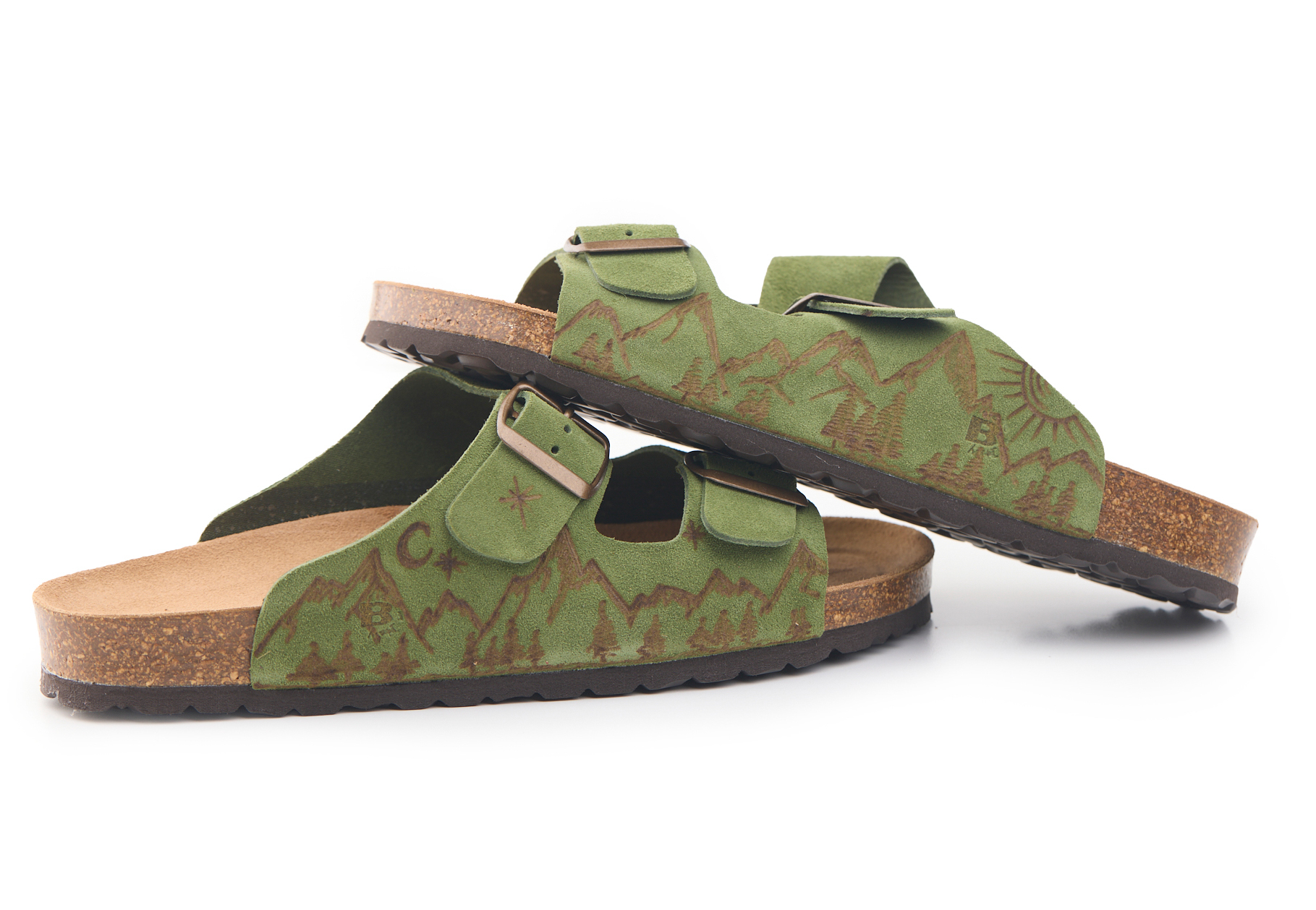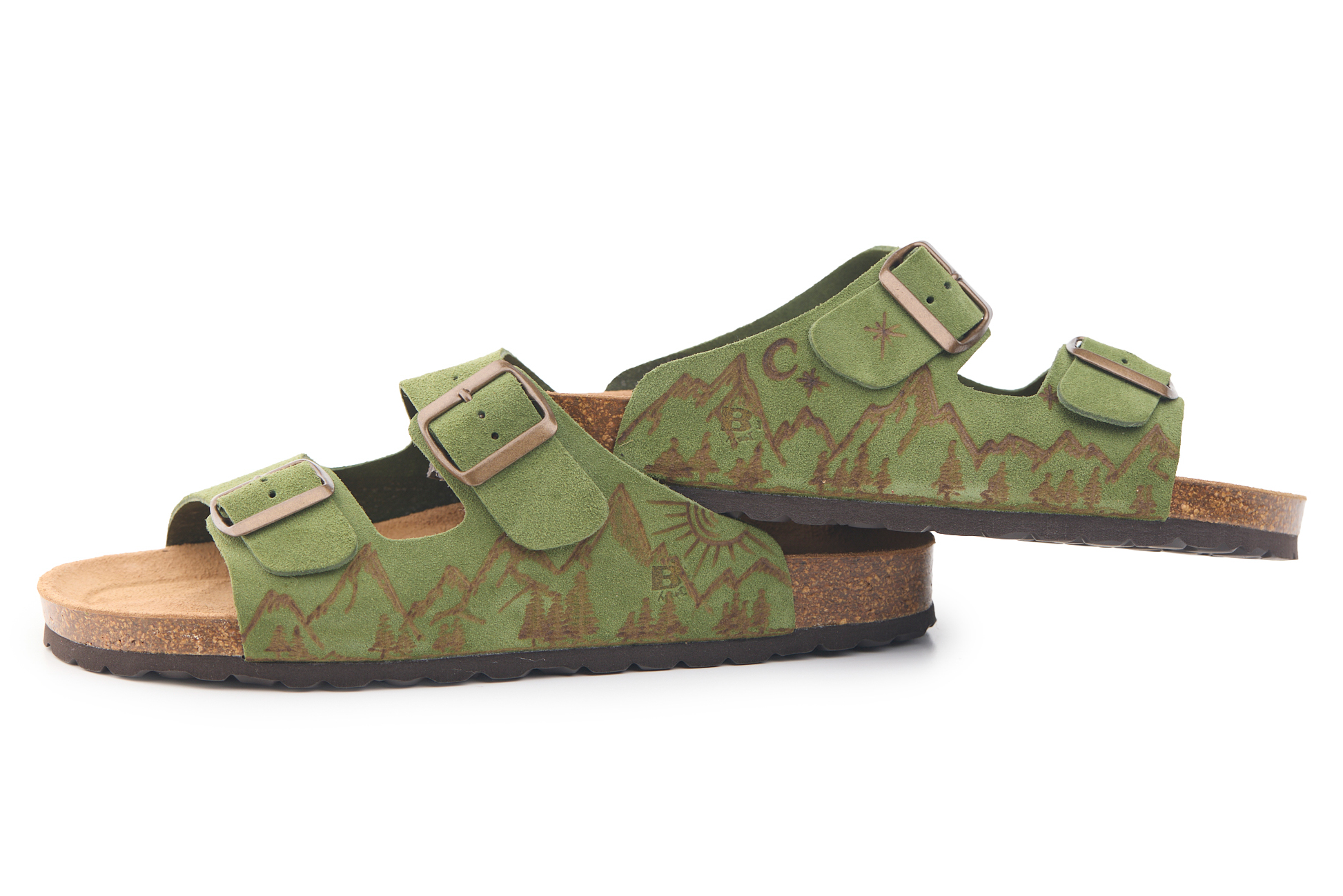 Pianella regolazione due fibbie con tomaia in pelle crosta bovina scamosciata lavorata senza cuciture con montagne pirografate a mano da AC Longboards.