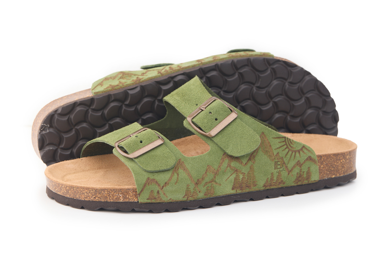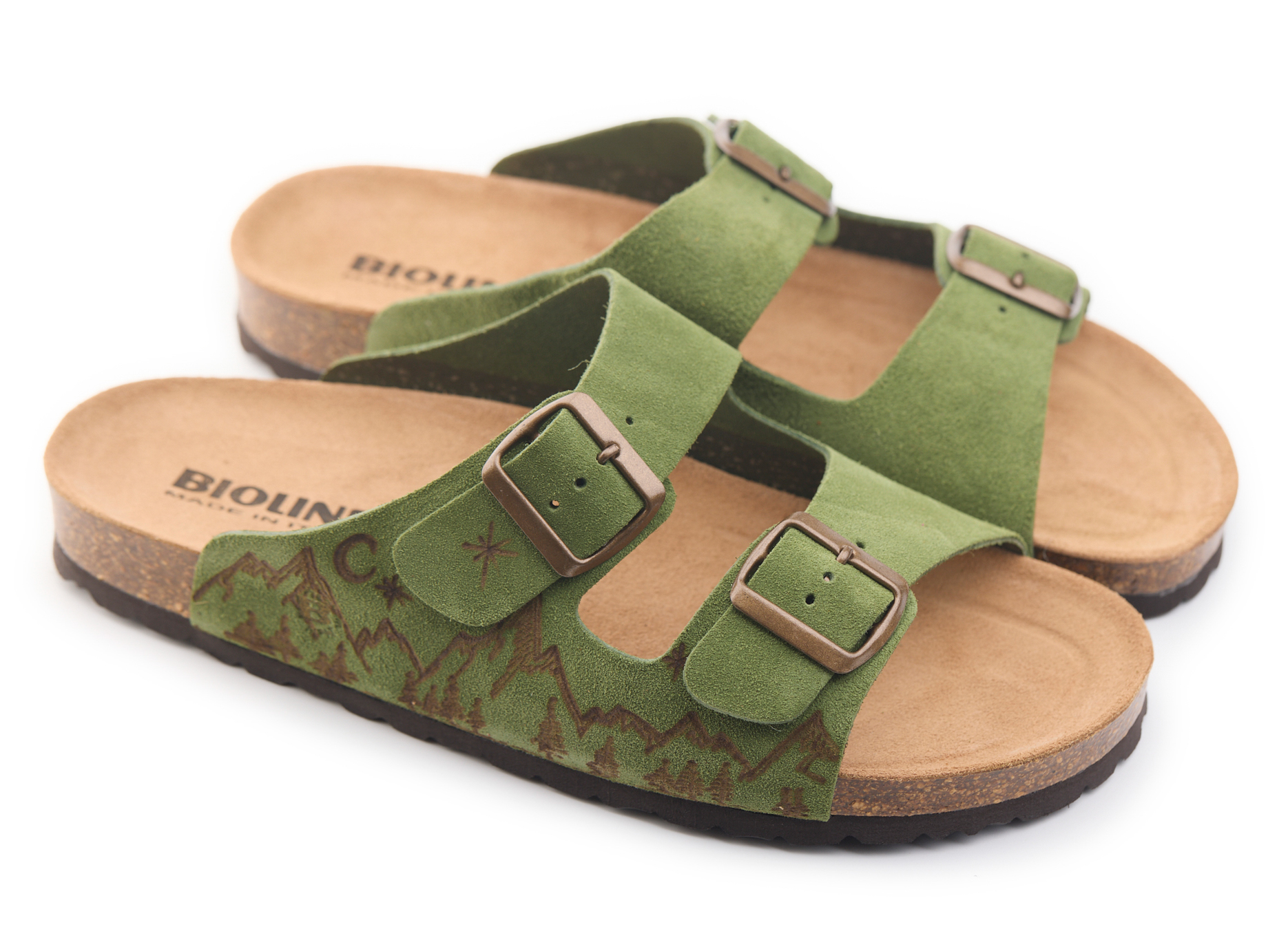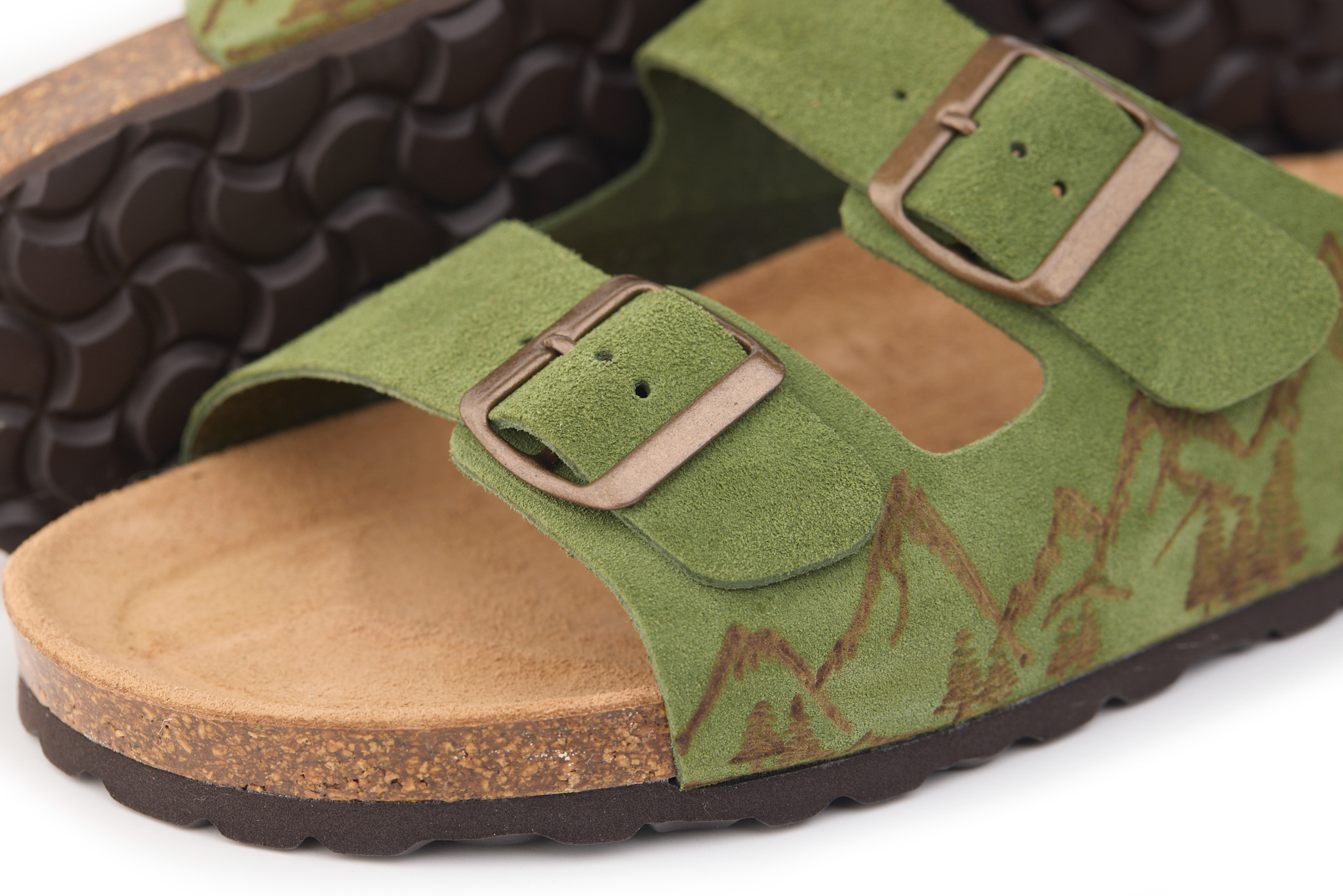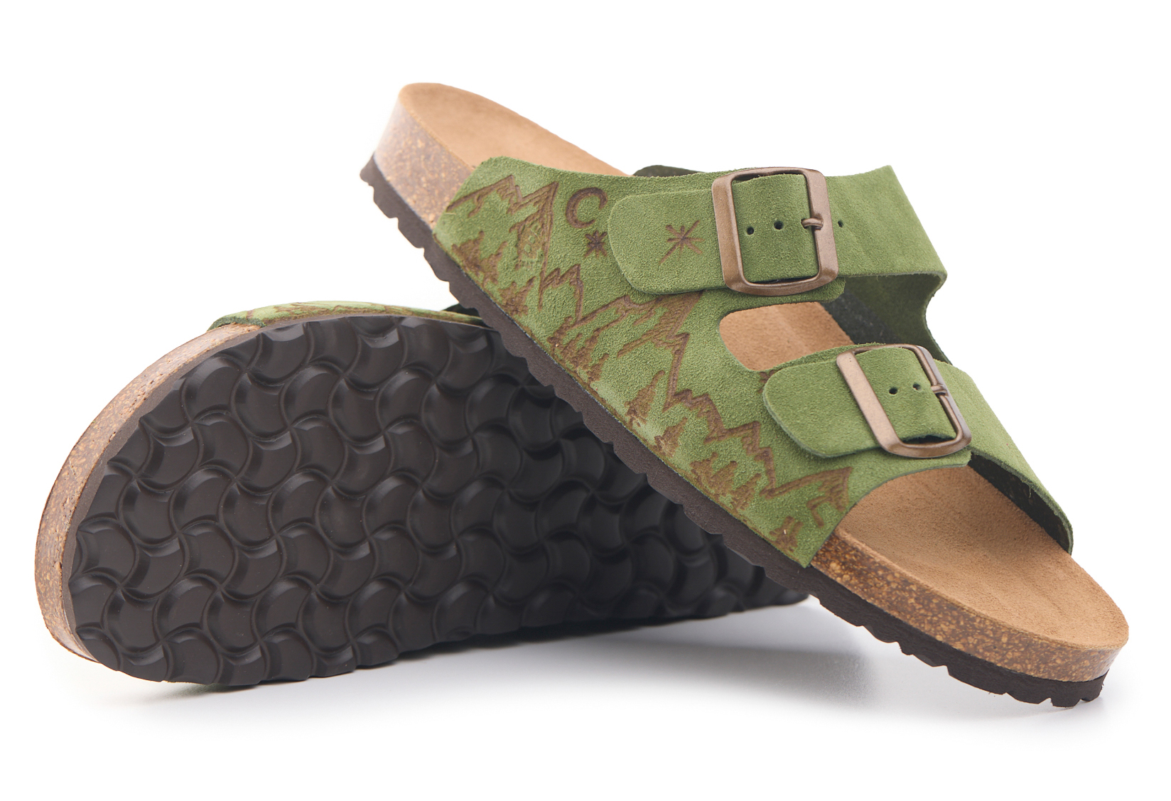 Pianella regolazione due fibbie con tomaia in pelle crosta bovina scamosciata lavorata senza cuciture con montagne pirografate a mano da AC Longboards.