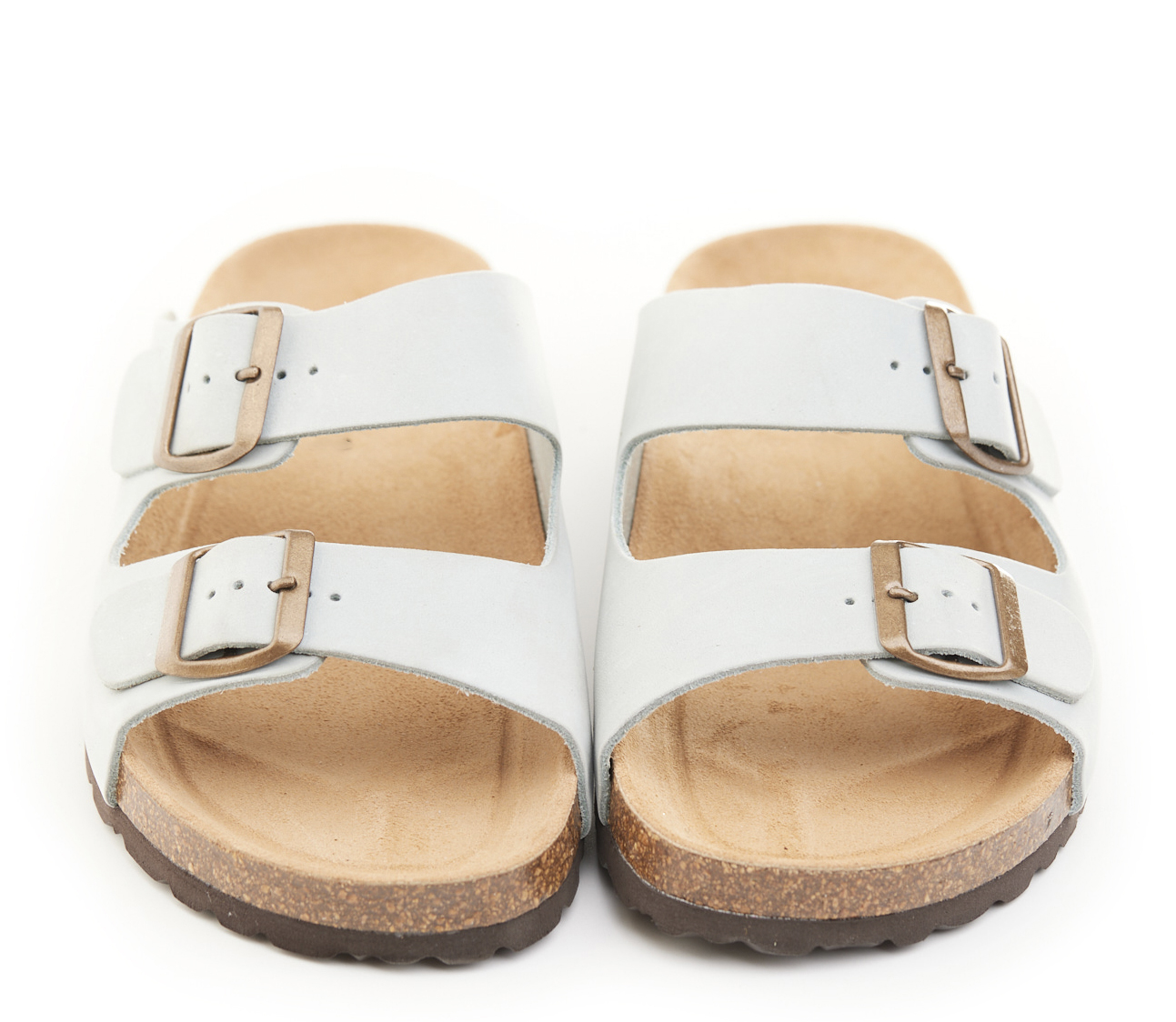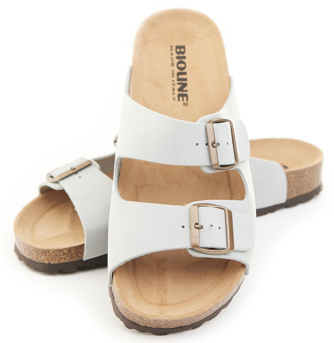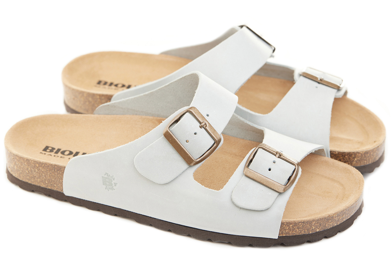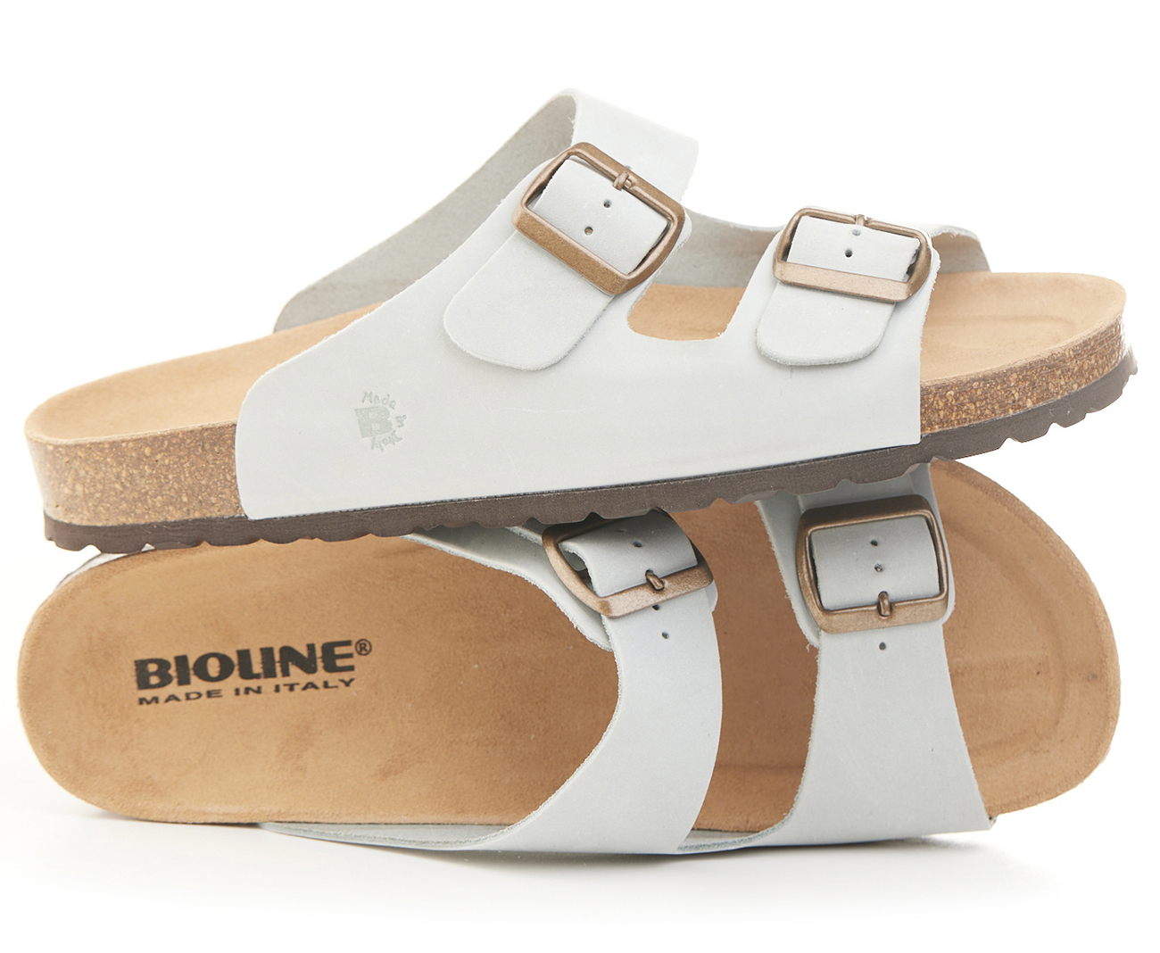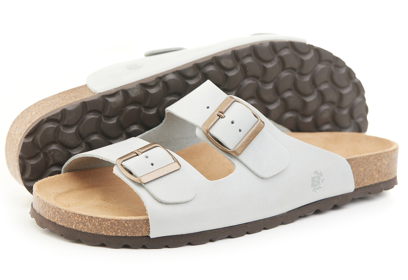 Pianella regolazione due fibbie con tomaia in pelle nabuk ingrassato senza cuciture, sottopiede in gomma-sughero rivestito in pelle e battistrada in EVA (etil vinil acetato) 8mm.