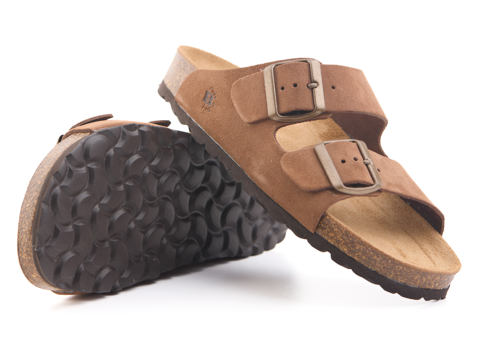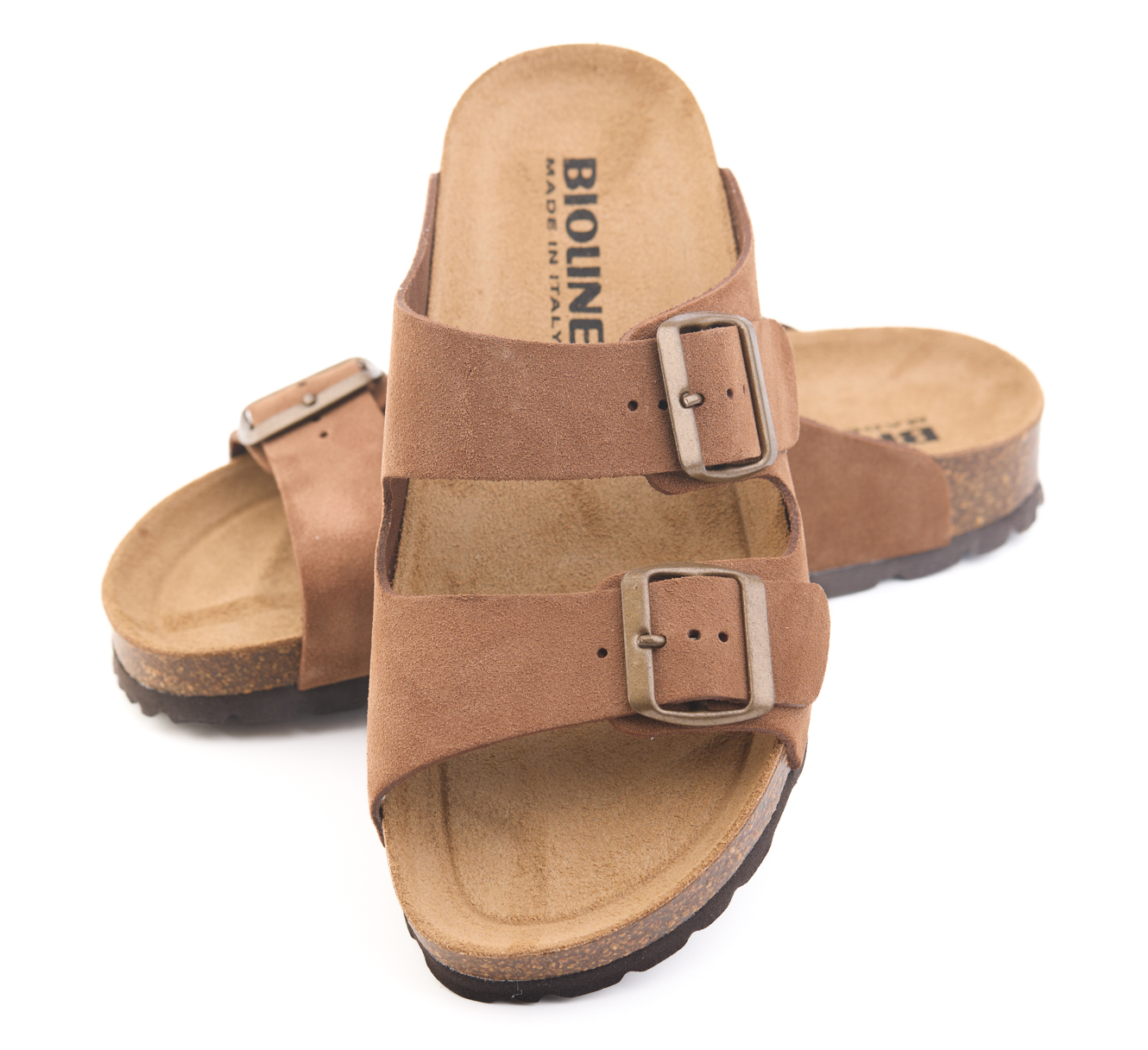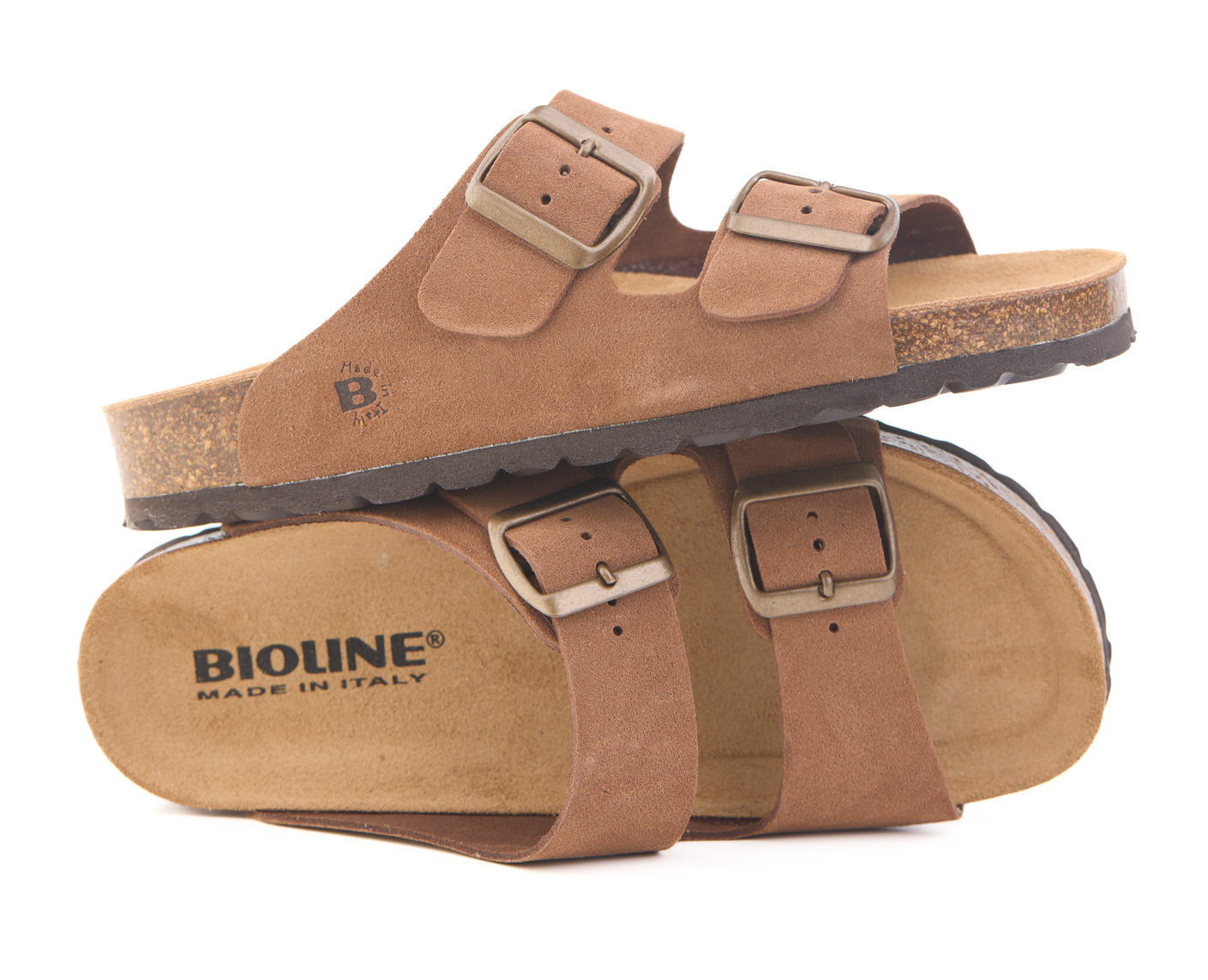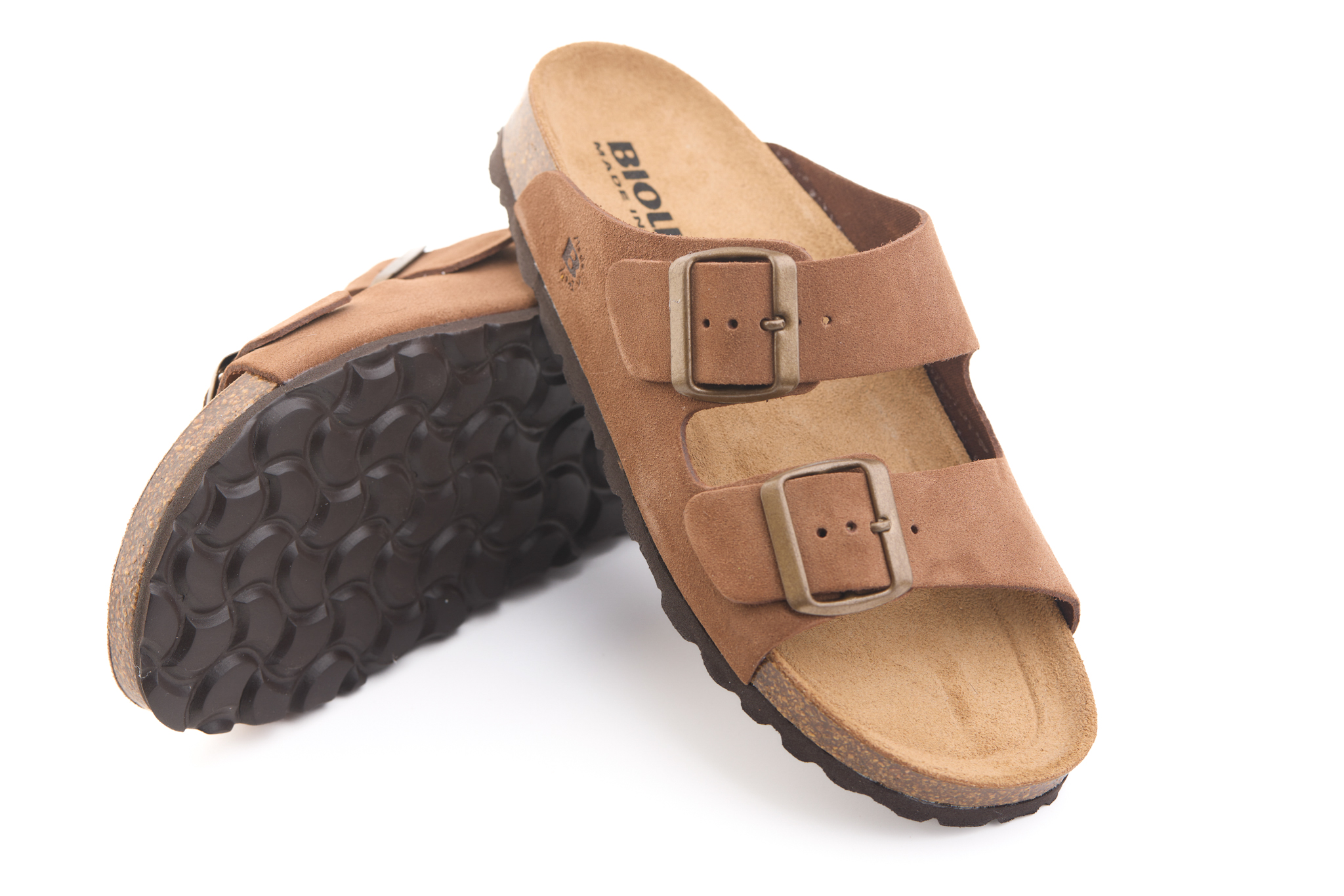 Pianella regolazione due fibbie con tomaia in pelle crosta bovina scamosciata senza cuciture, sottopiede in gomma-sughero ricoperto in pelle e battistrada in EVA (etil vinil acetato) 8mm.