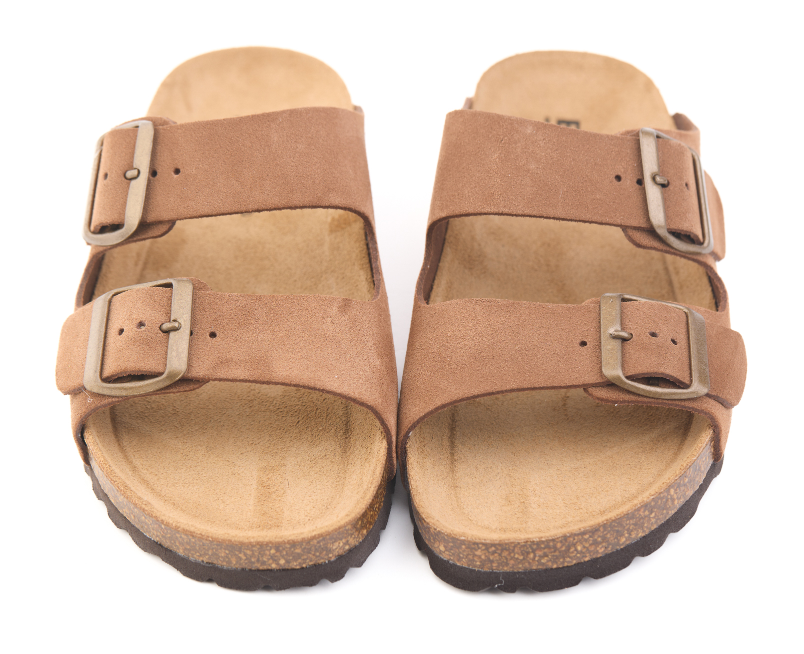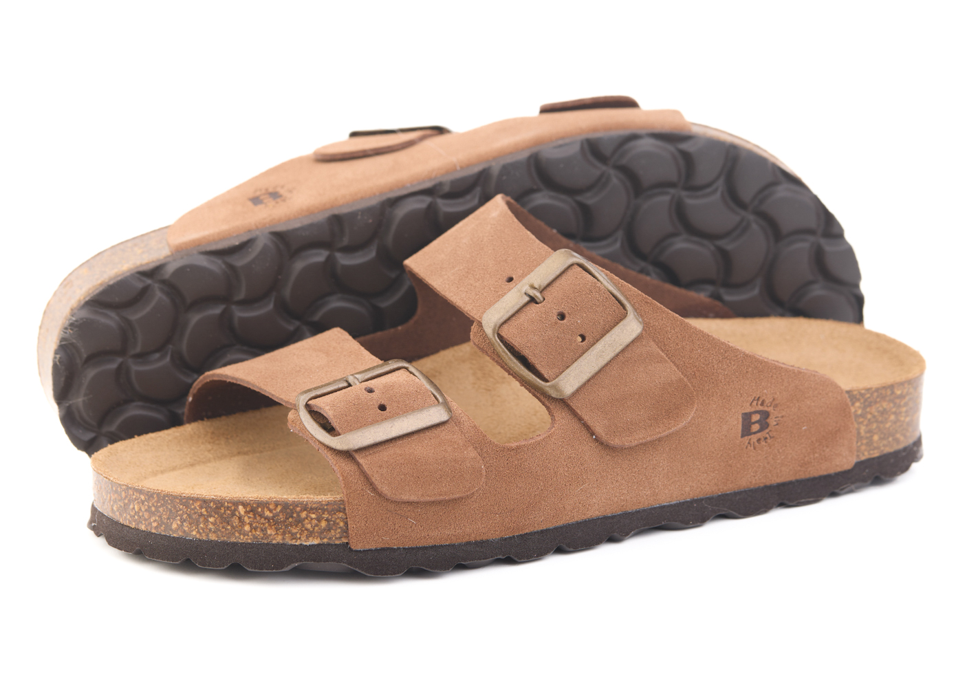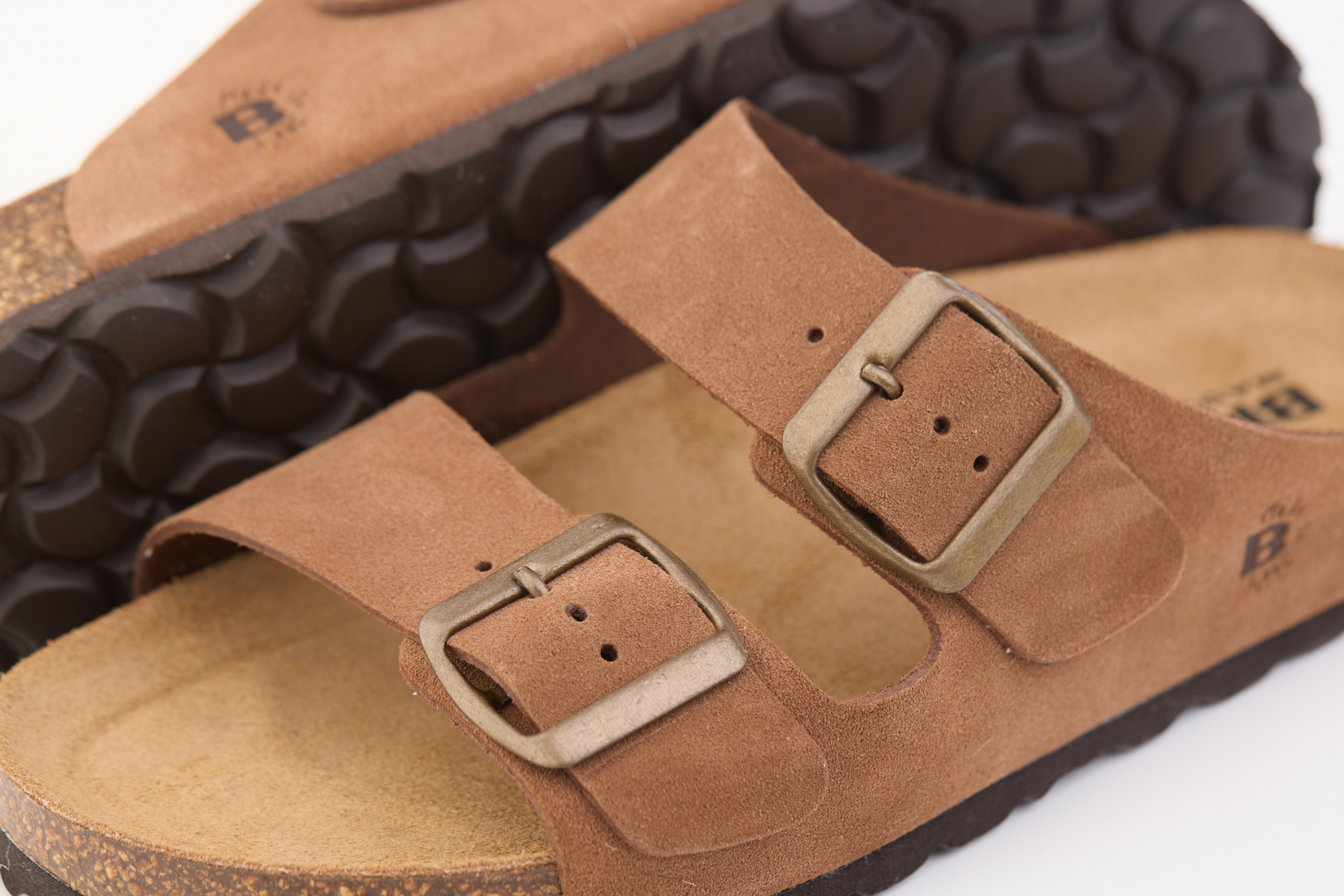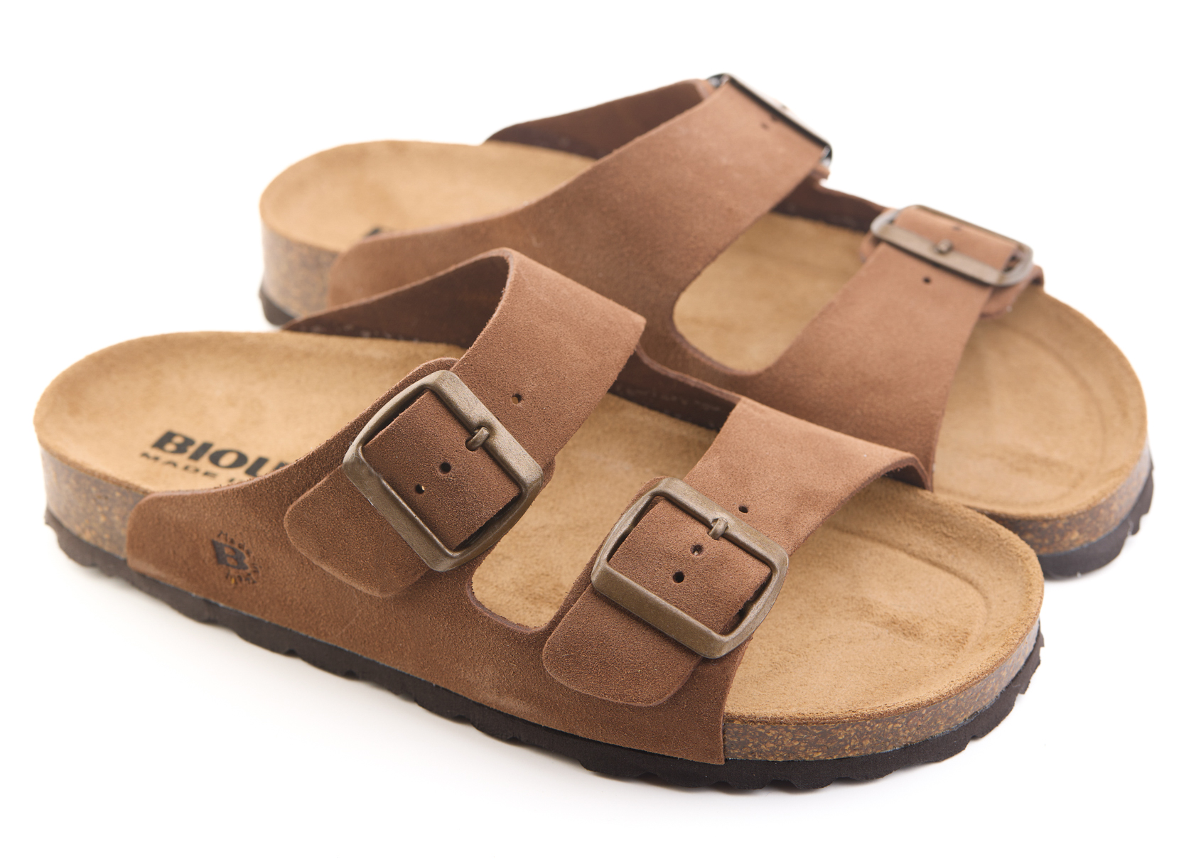 Pianella regolazione due fibbie con tomaia in pelle crosta bovina scamosciata senza cuciture, sottopiede in gomma-sughero ricoperto in pelle e battistrada in EVA (etil vinil acetato) 8mm.
