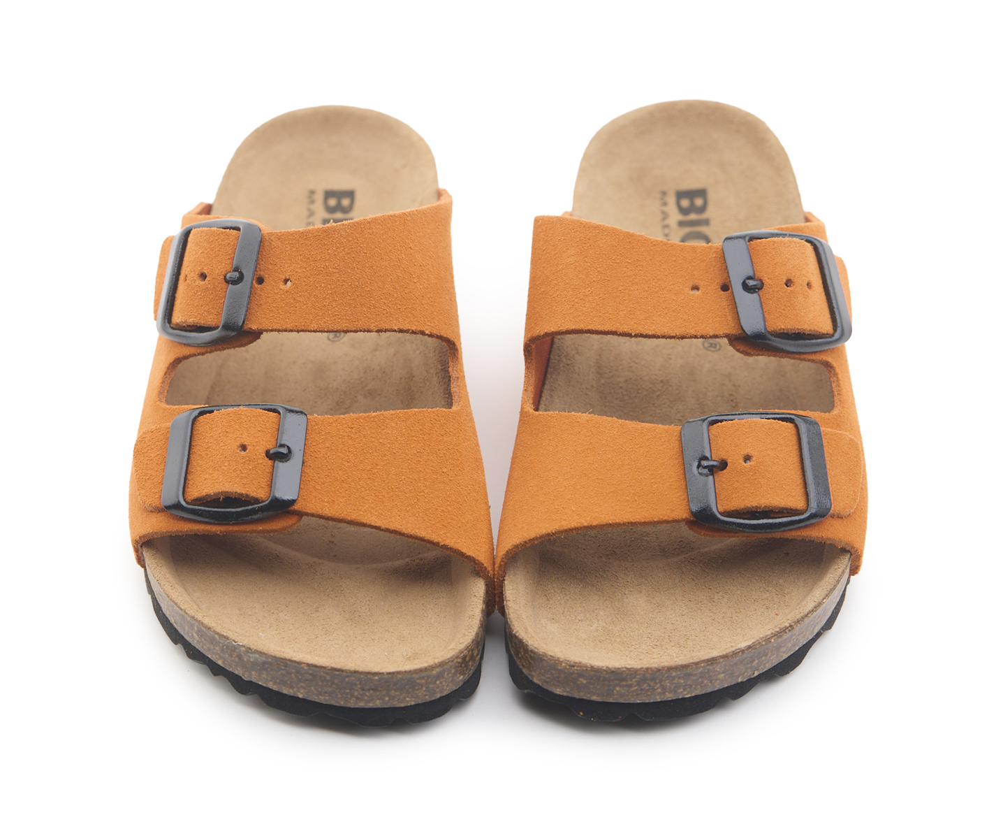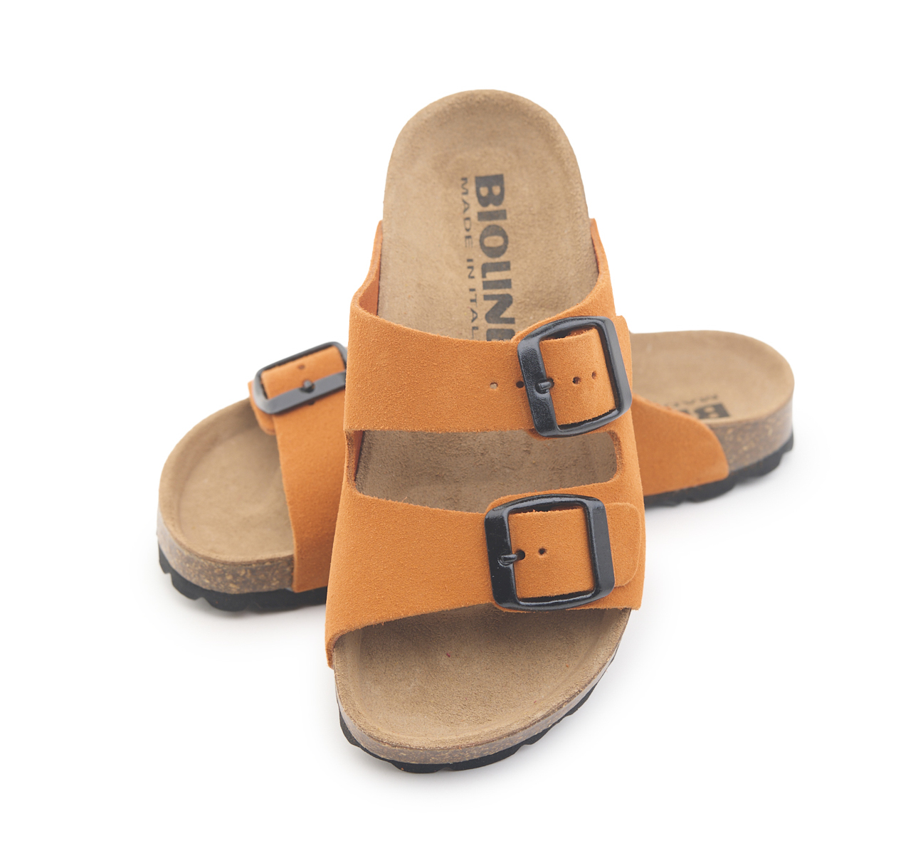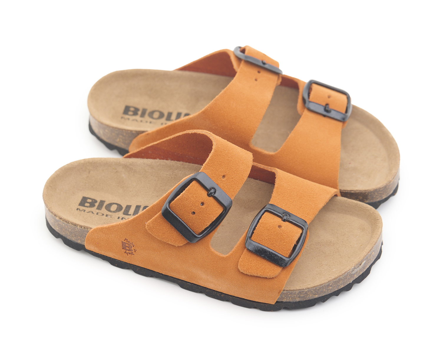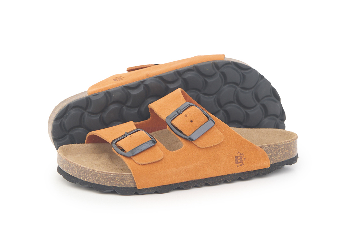 Pianella due fibbie da bambino con tomaia in pelle crosta bovina scamosciata, sottopiede in gomma-sughero rivestito in pelle e suola tranciata in EVA.