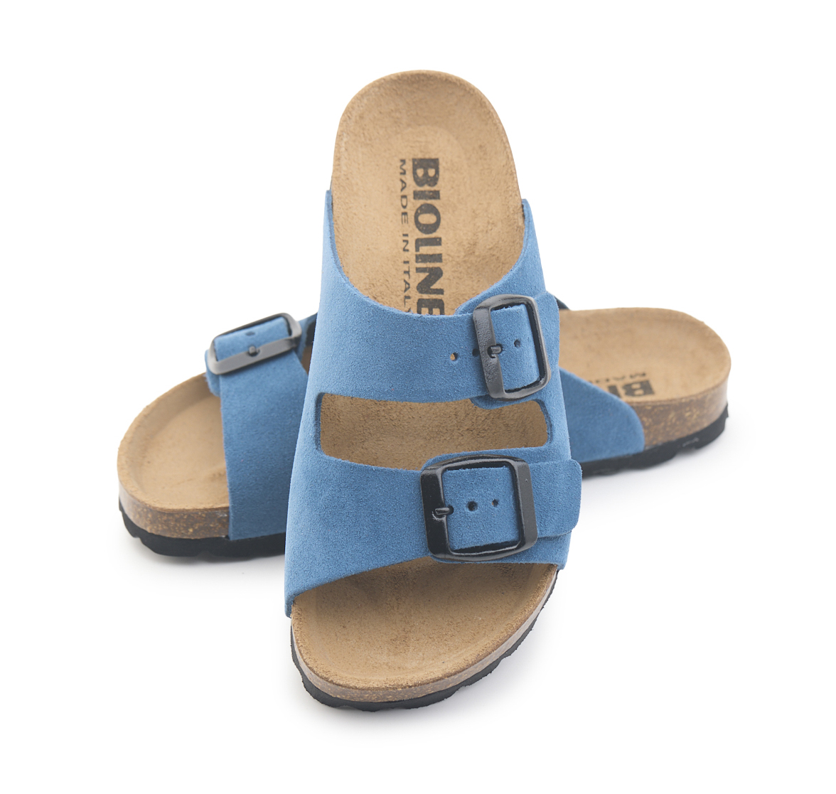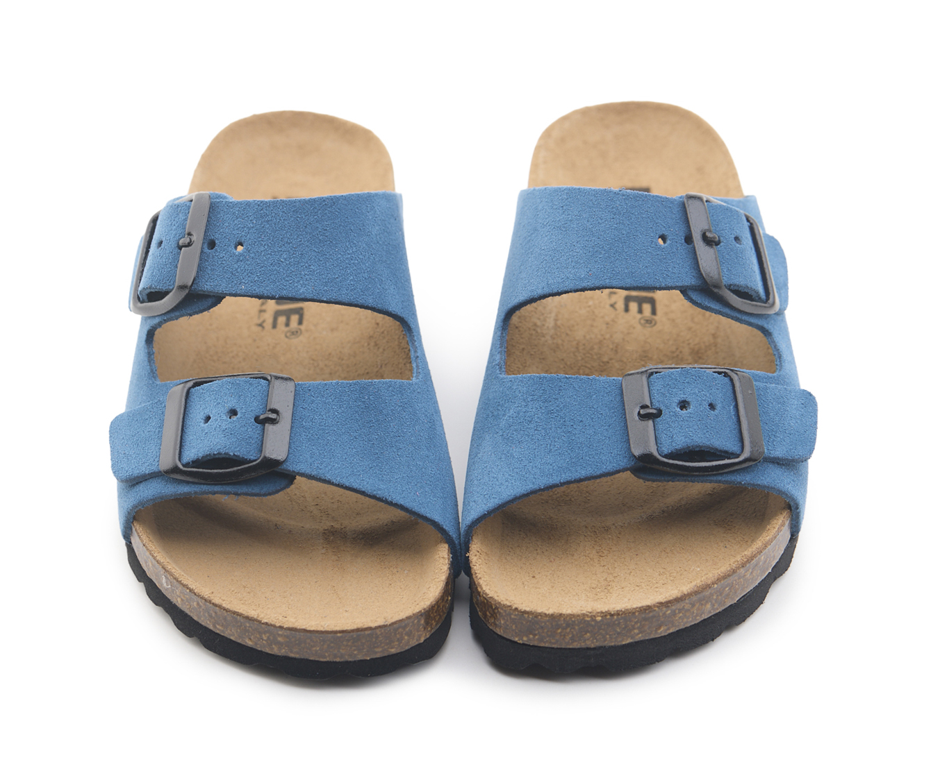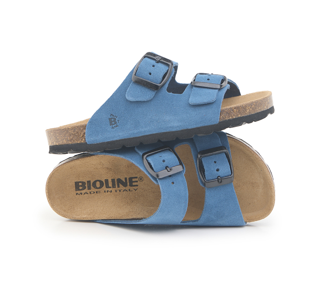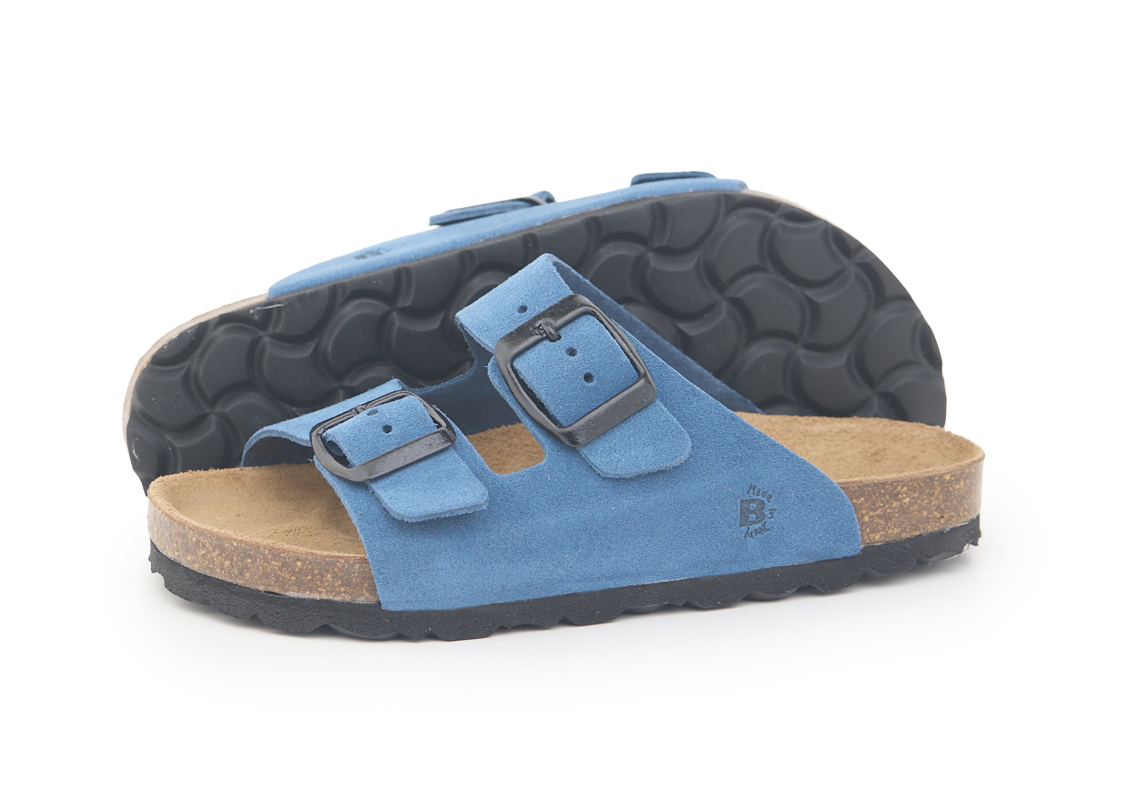 Pianella due fibbie da bambino con tomaia in pelle crosta bovina scamosciata, sottopiede in gomma-sughero rivestito in pelle e suola tranciata in EVA.
