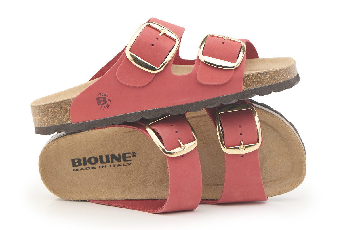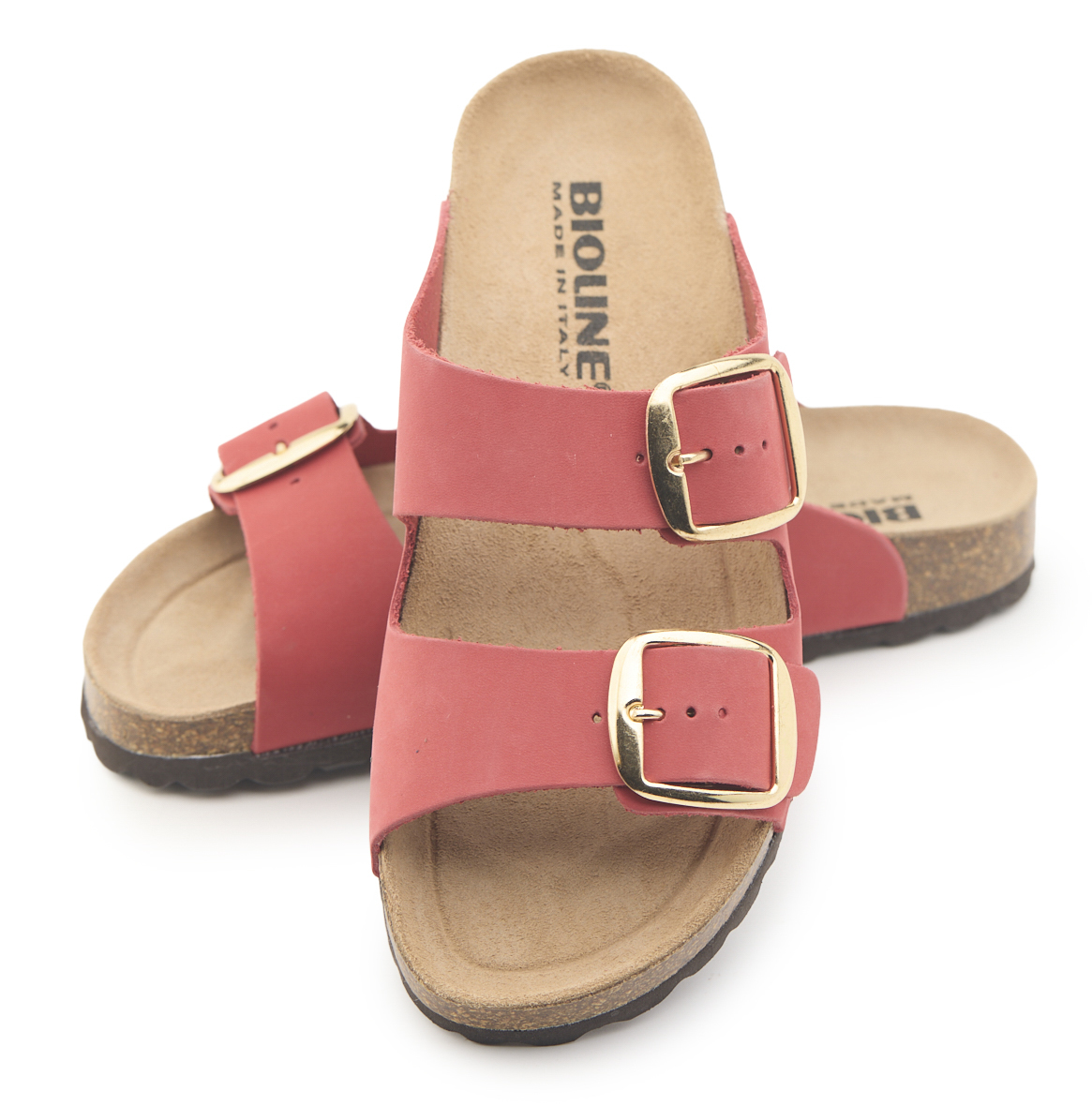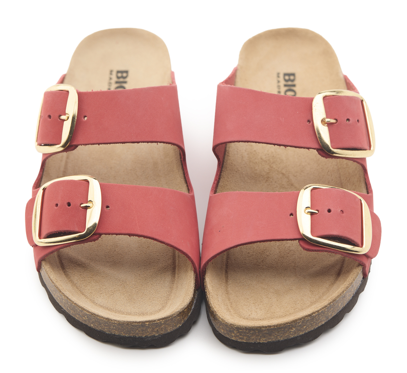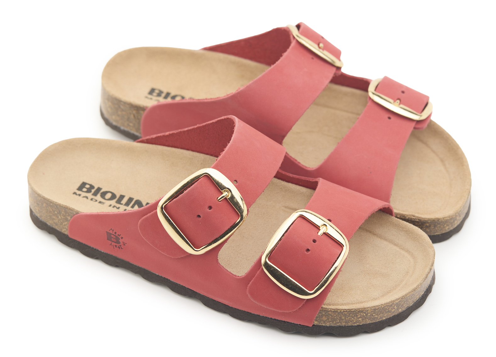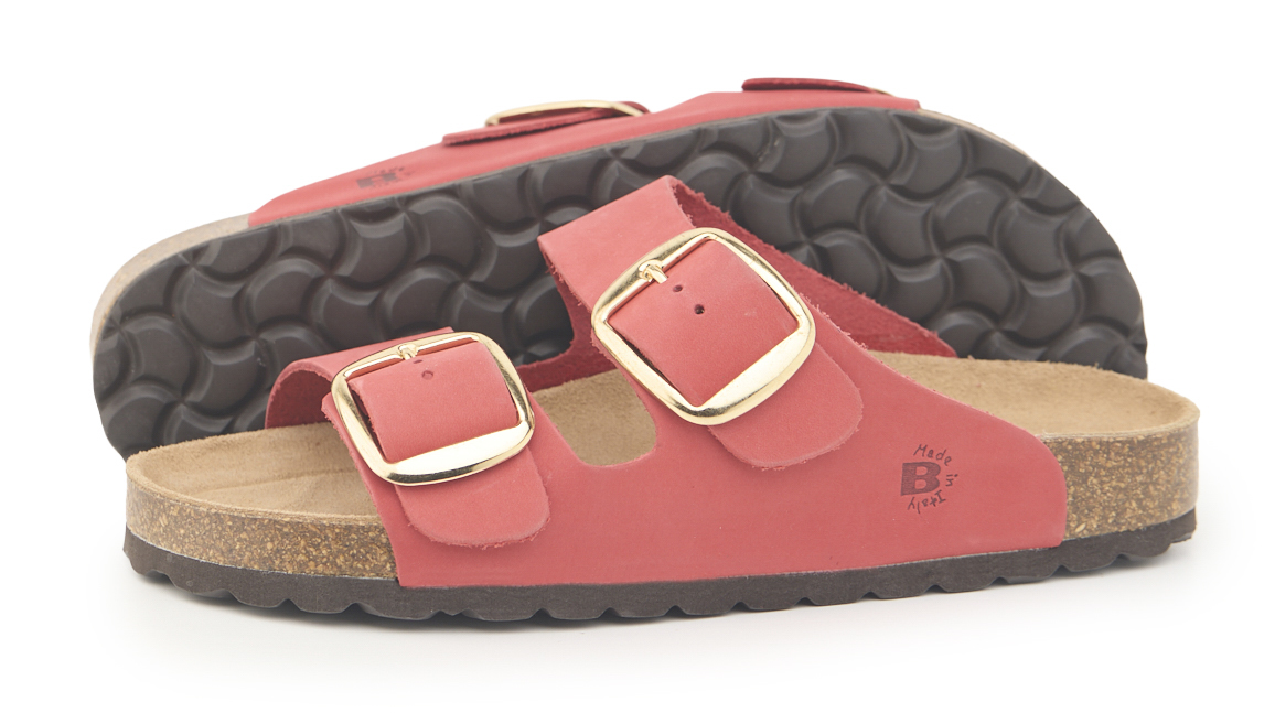 Pianella regolazione due fibbioni con tomaia in pelle Nabuk senza cuciture, sottopiede in gomma-sughero ricoperto in pelle e battistrada in EVA (etil vinil acetato) 8mm.