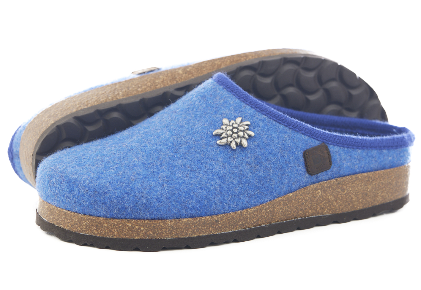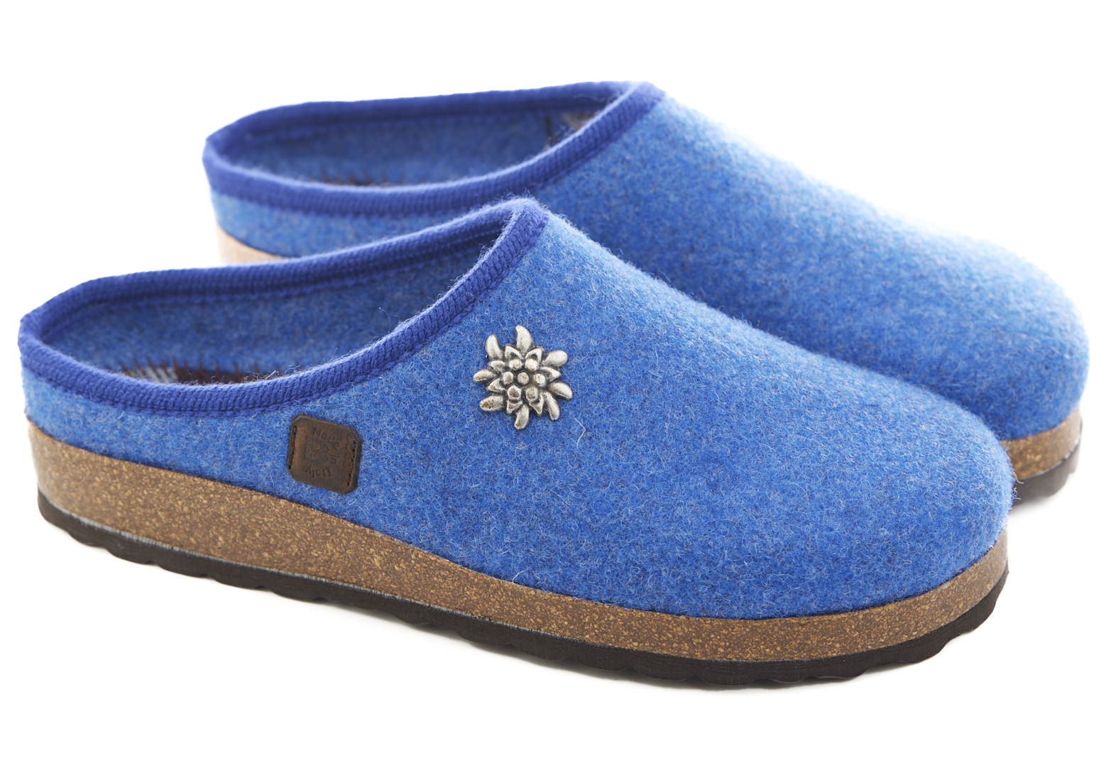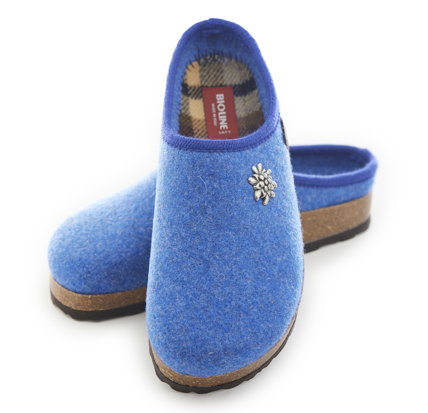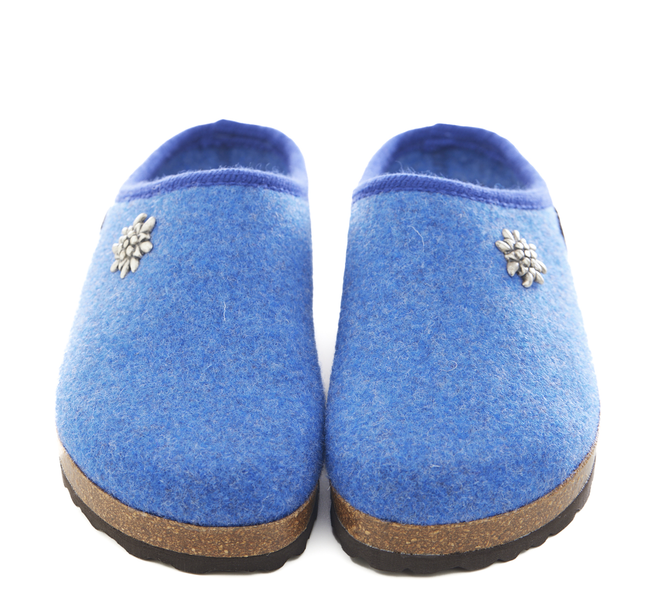 Sabot in lana merinos con riporto edelweiss costruzione strobel, un metodo di lavorazione che permette alla calzatura la massima flessibilità. Il sottopiede in gomma-sughero foderato in lana stampa scozzese è accoppiato a una suola di qualità in microporosa EVA.