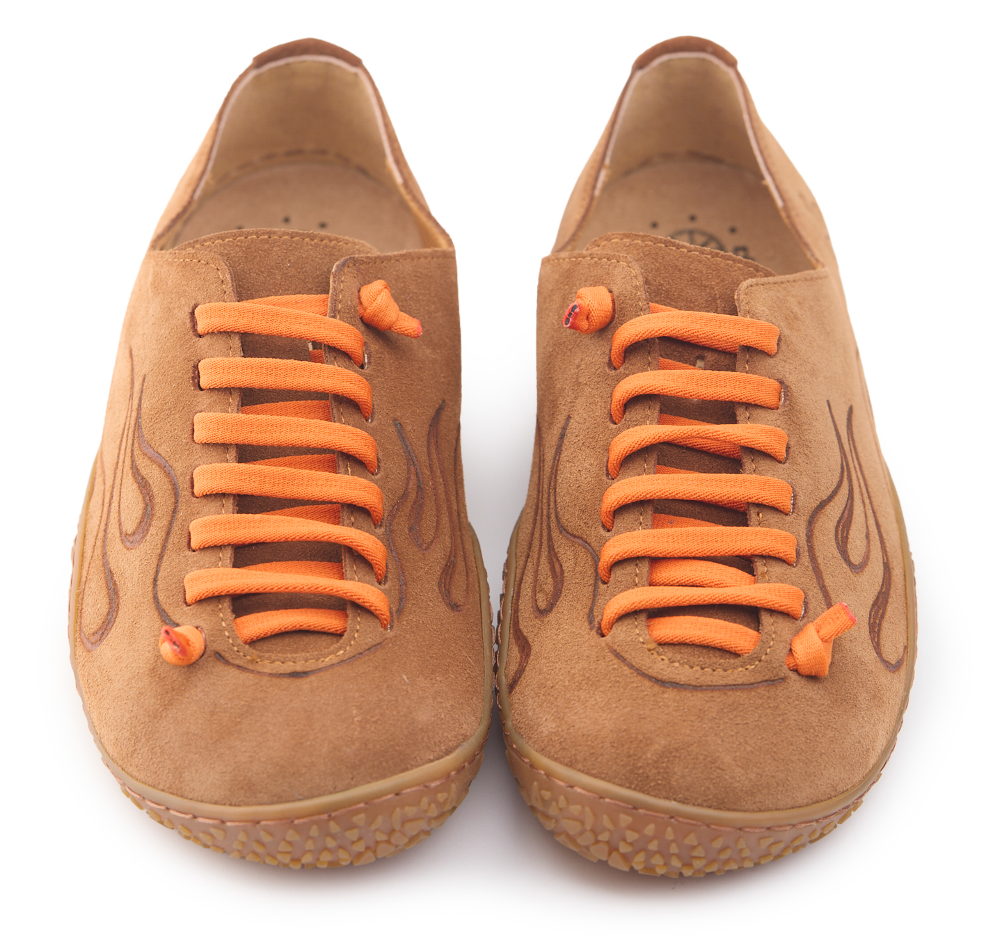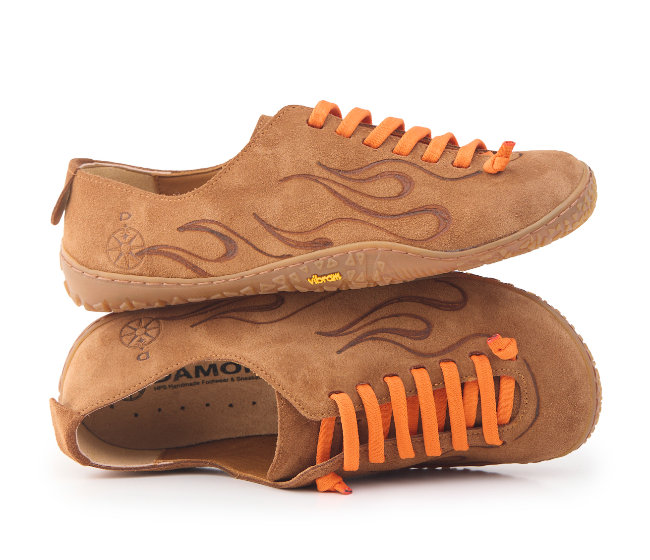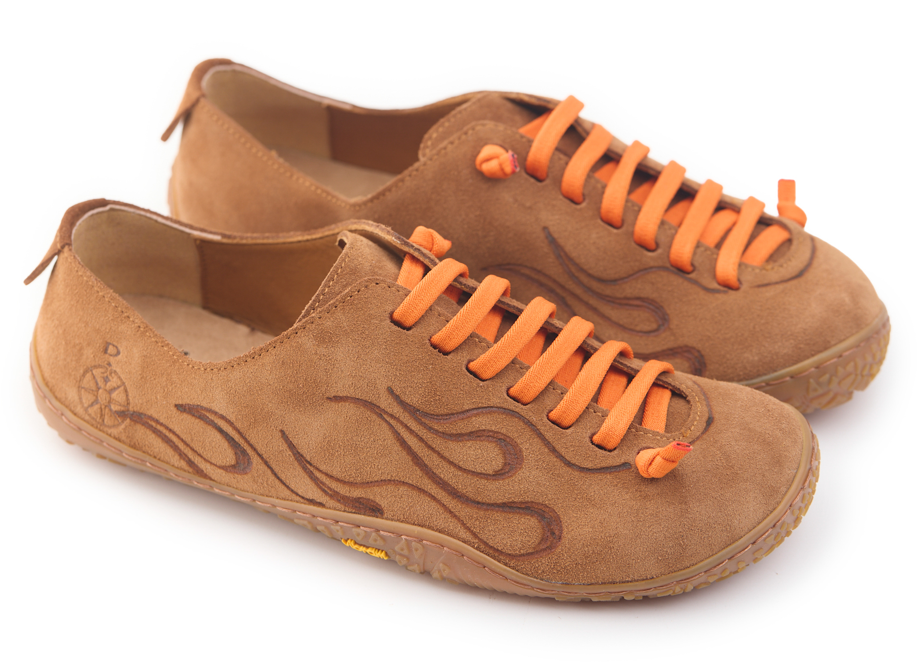 Scarpetta barefoot realizzato in pelle scamosciata, fodera in pelle vitello e lacci elastici annodati. Pirografata a mano da AC Longboards con disegno fiamme.