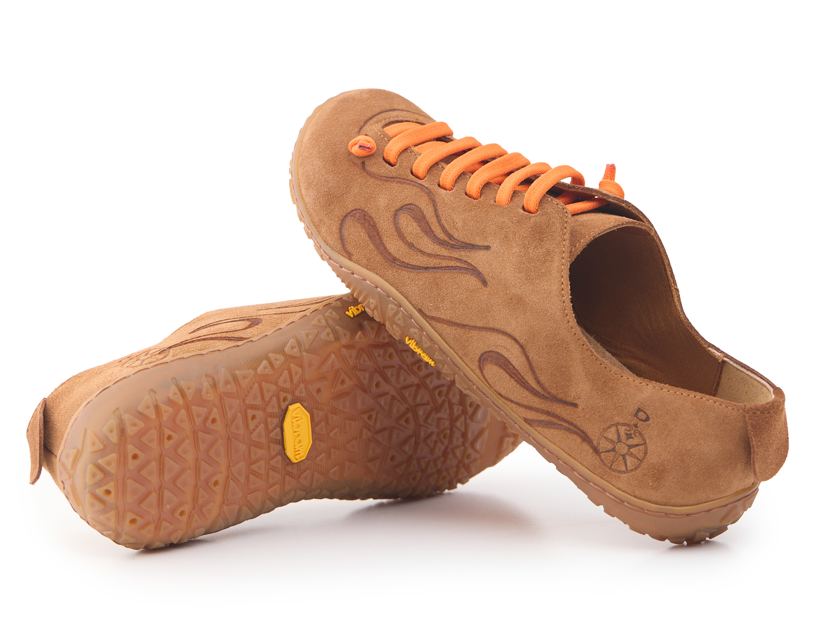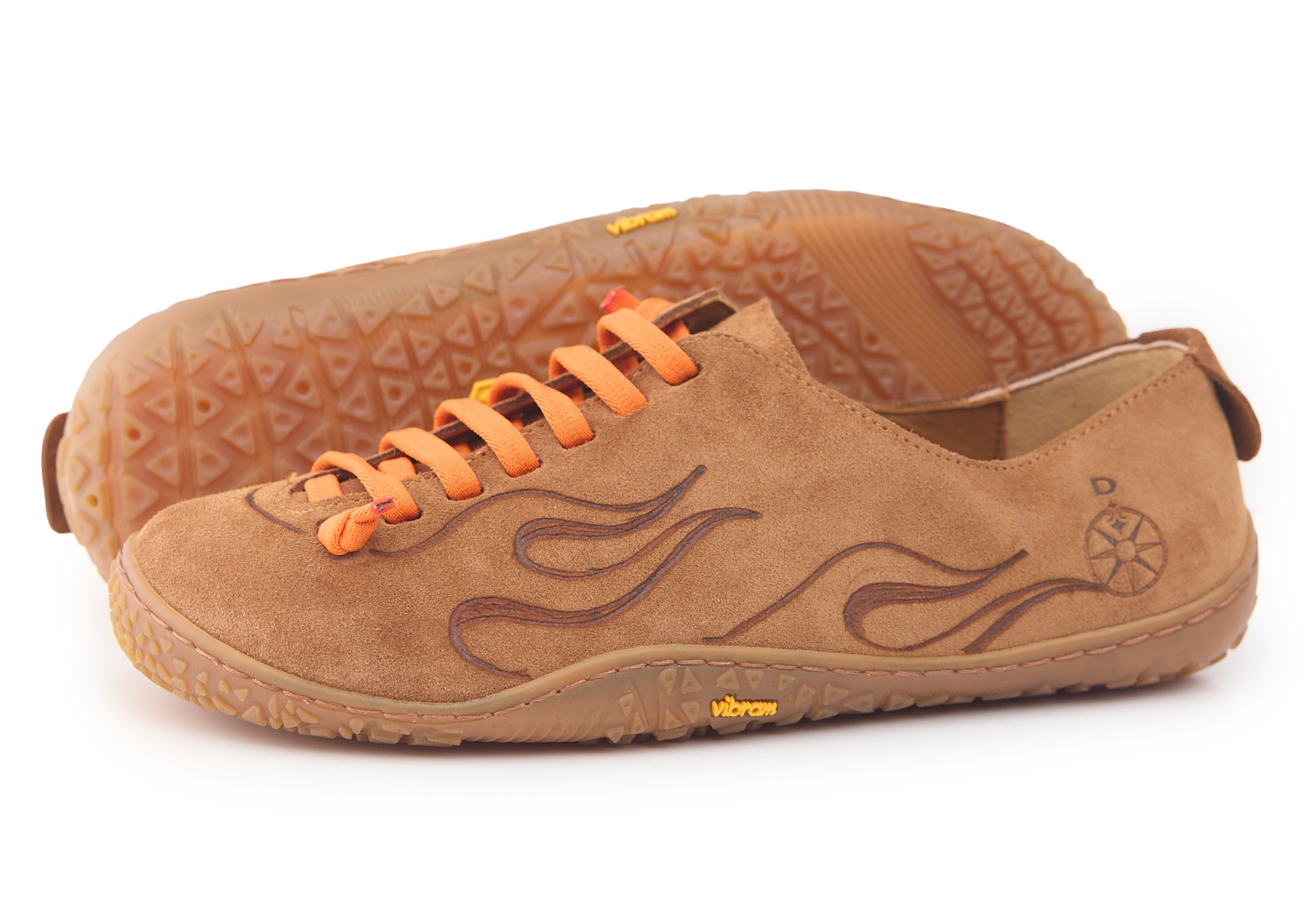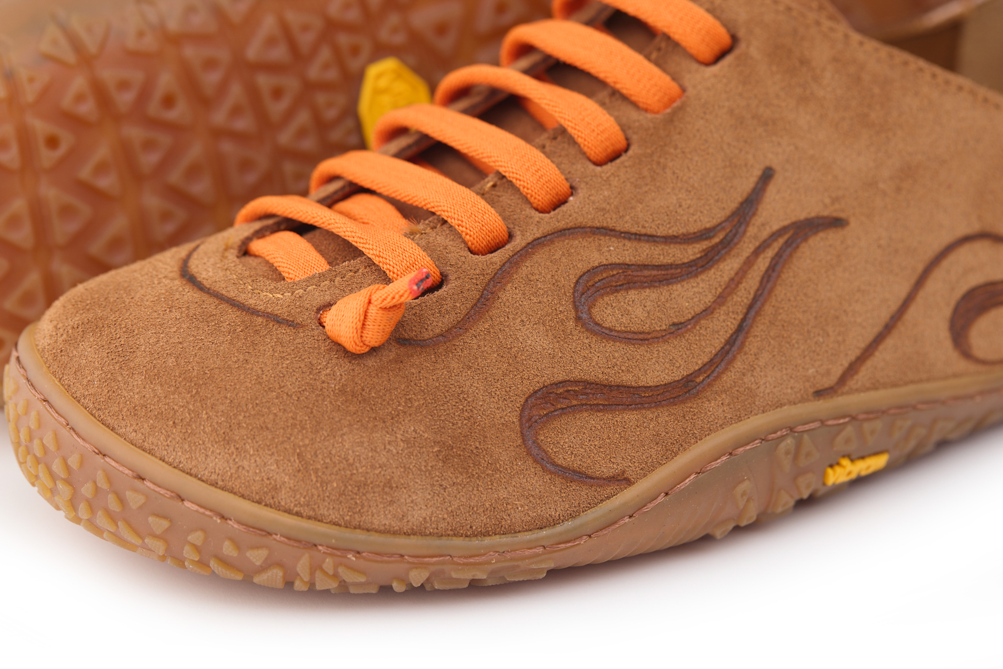 Scarpetta barefoot realizzato in pelle scamosciata, fodera in pelle vitello e lacci elastici annodati. Pirografata a mano da AC Longboards con disegno fiamme.