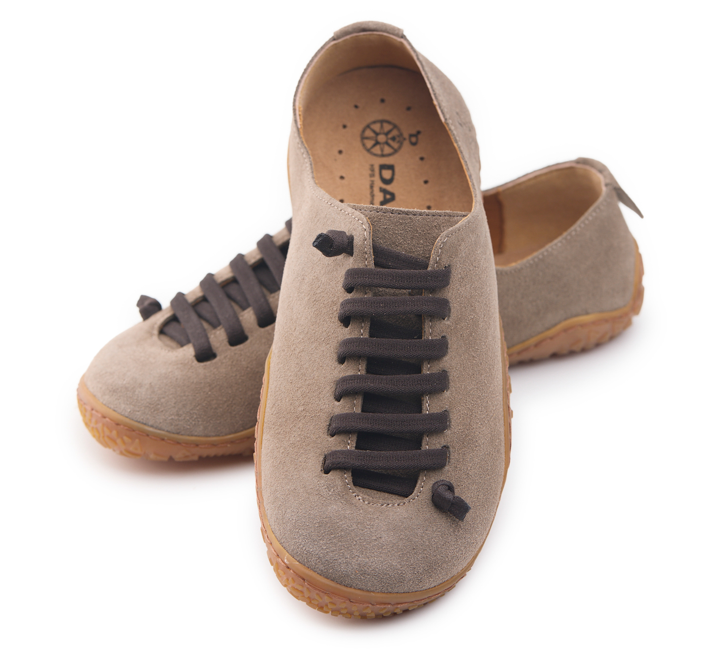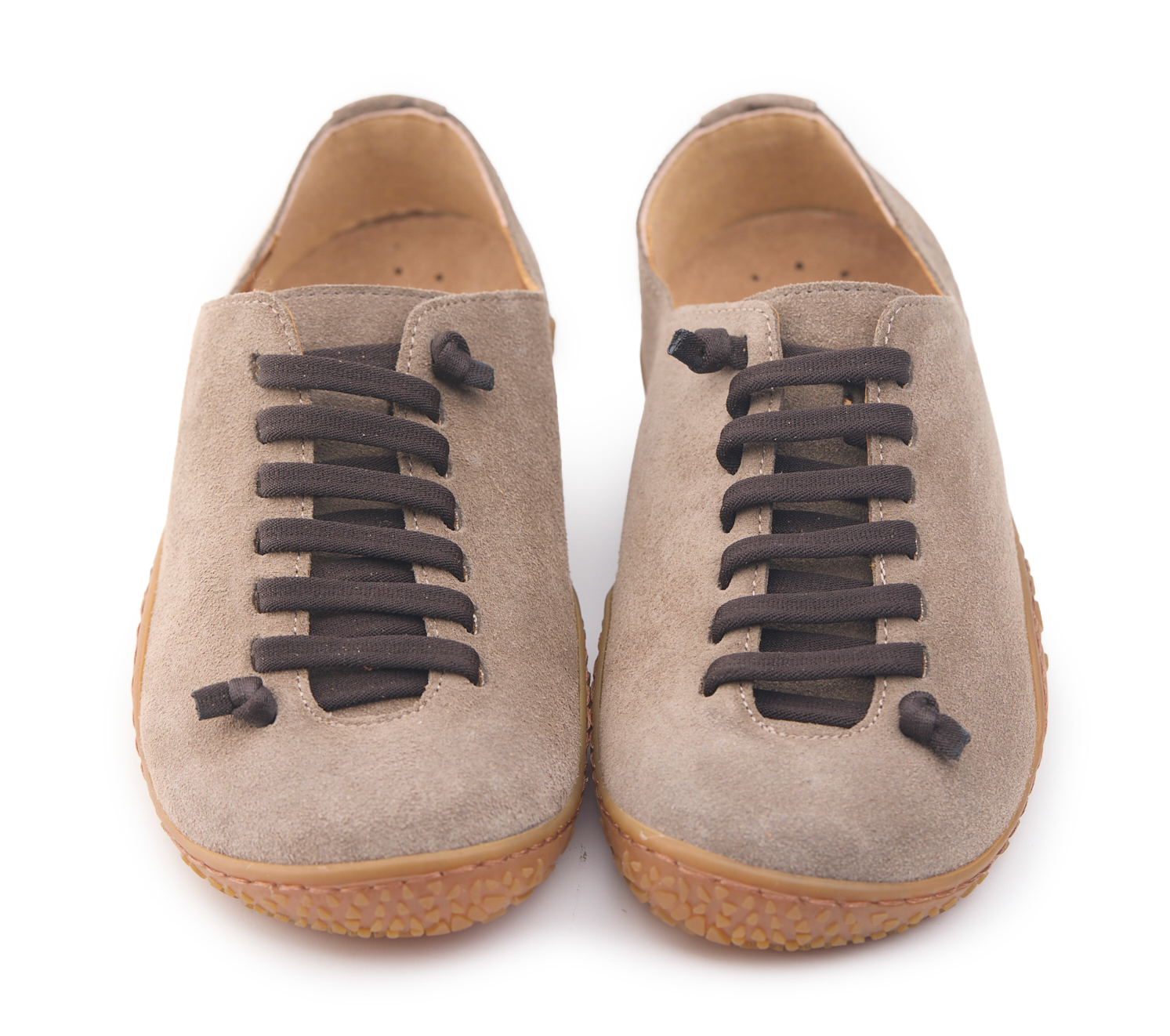 Scarpetta barefoot realizzato in pelle scamosciata, fodera in pelle vitello e lacci elastici annodati.