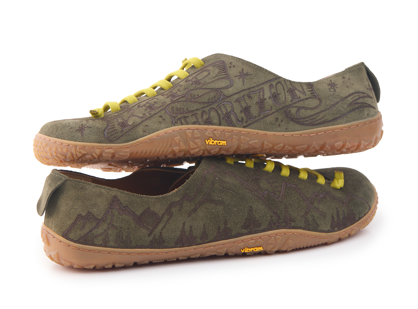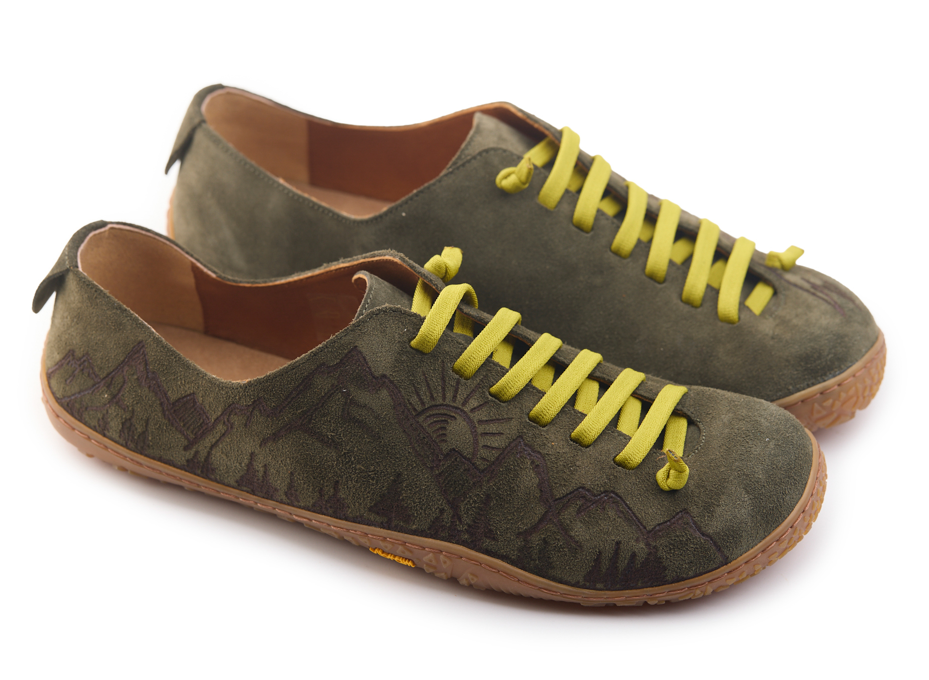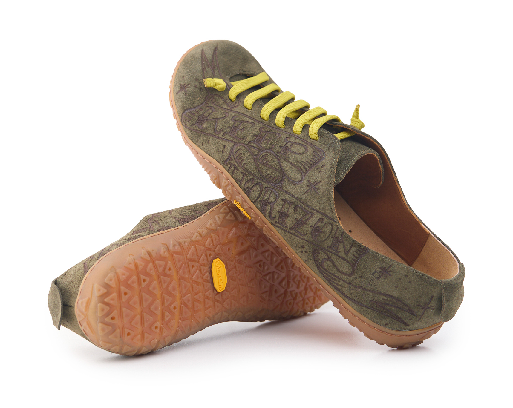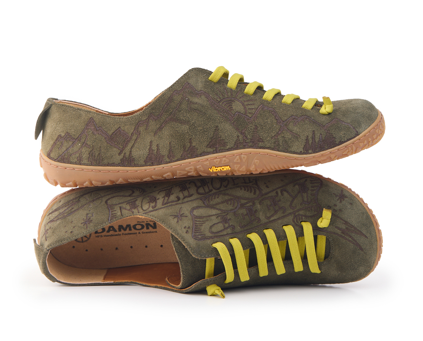 Scarpetta barefoot realizzato in pelle scamosciata, fodera in pelle vitello e lacci elastici annodati. Pirografata a mano da AC Longboards con disegno montagne e papiri con scritta ‘Keep Horizon’.
