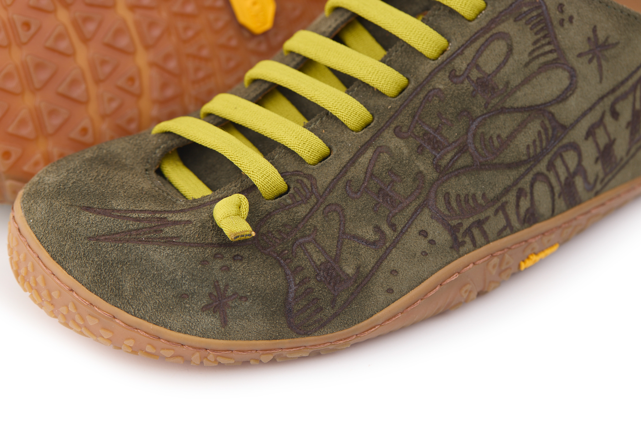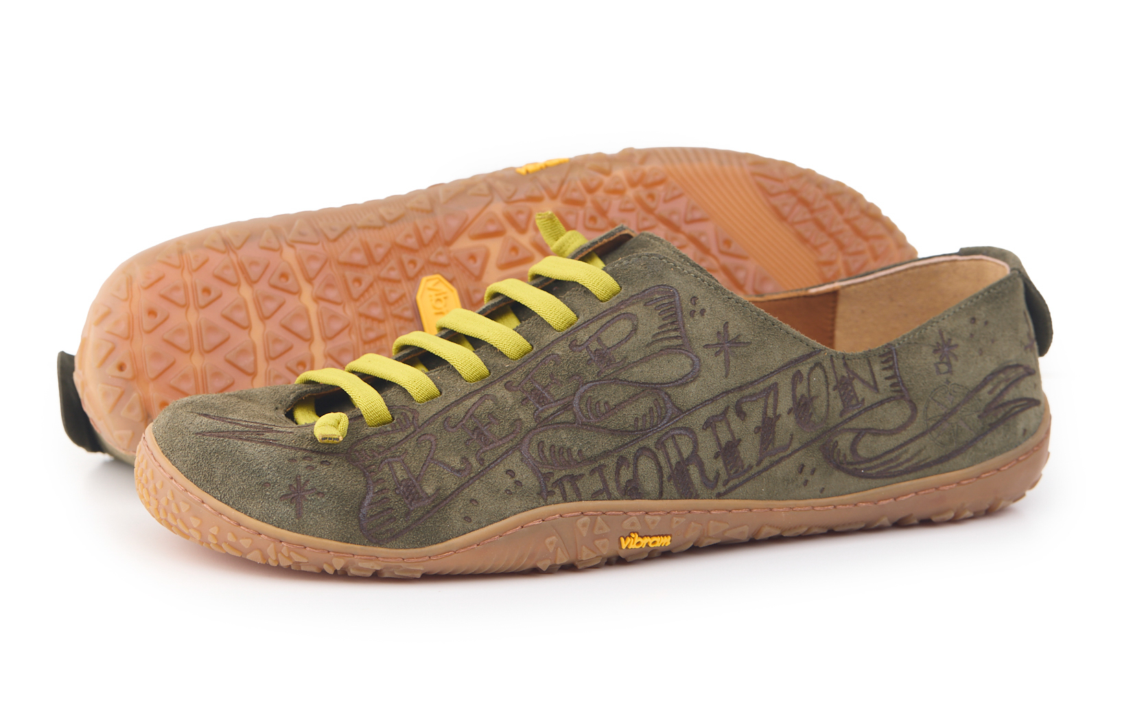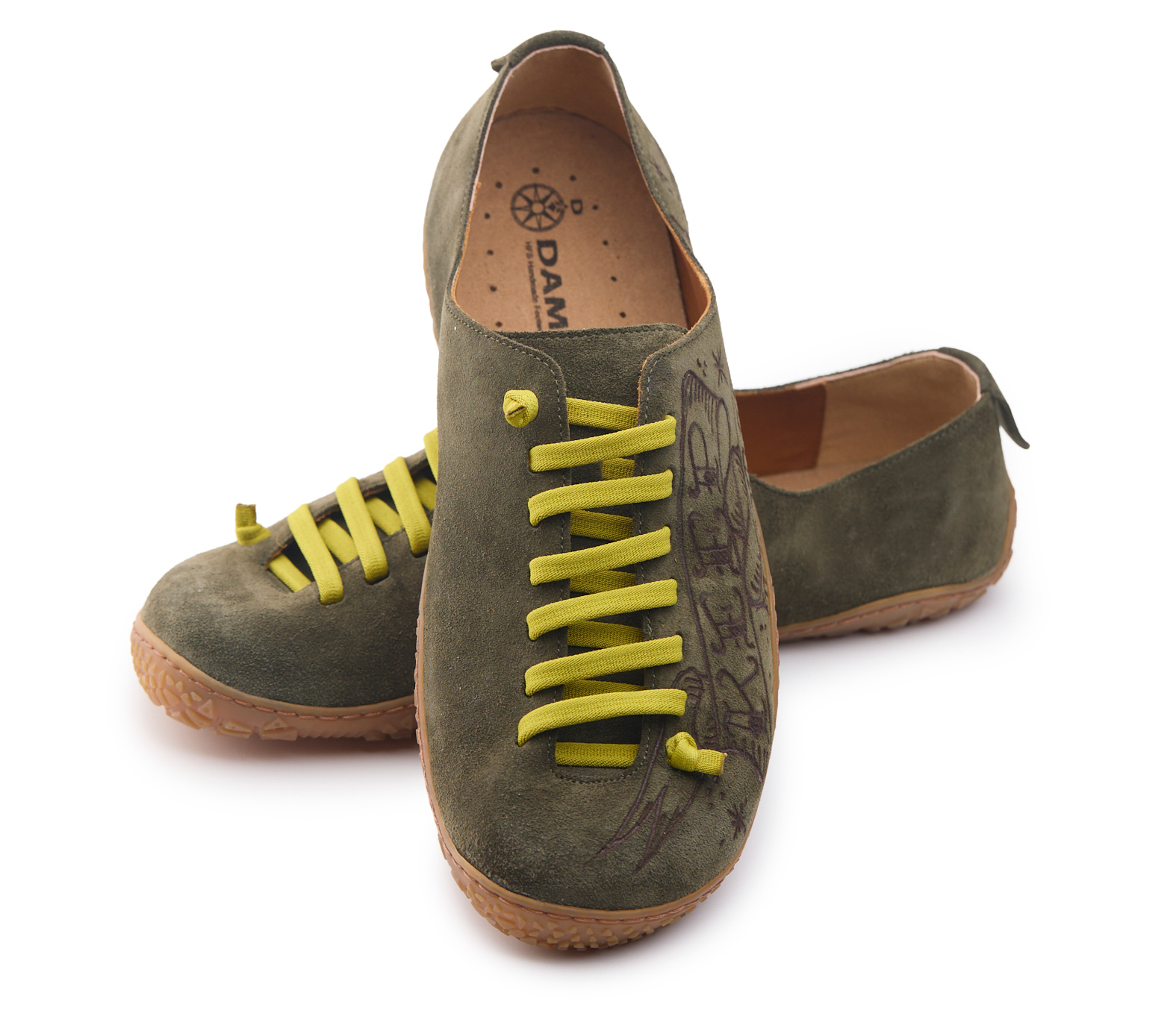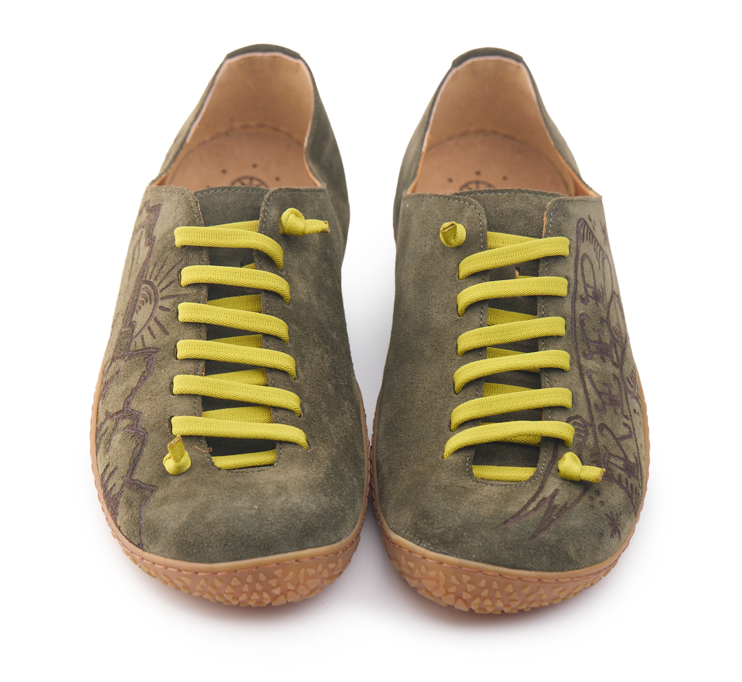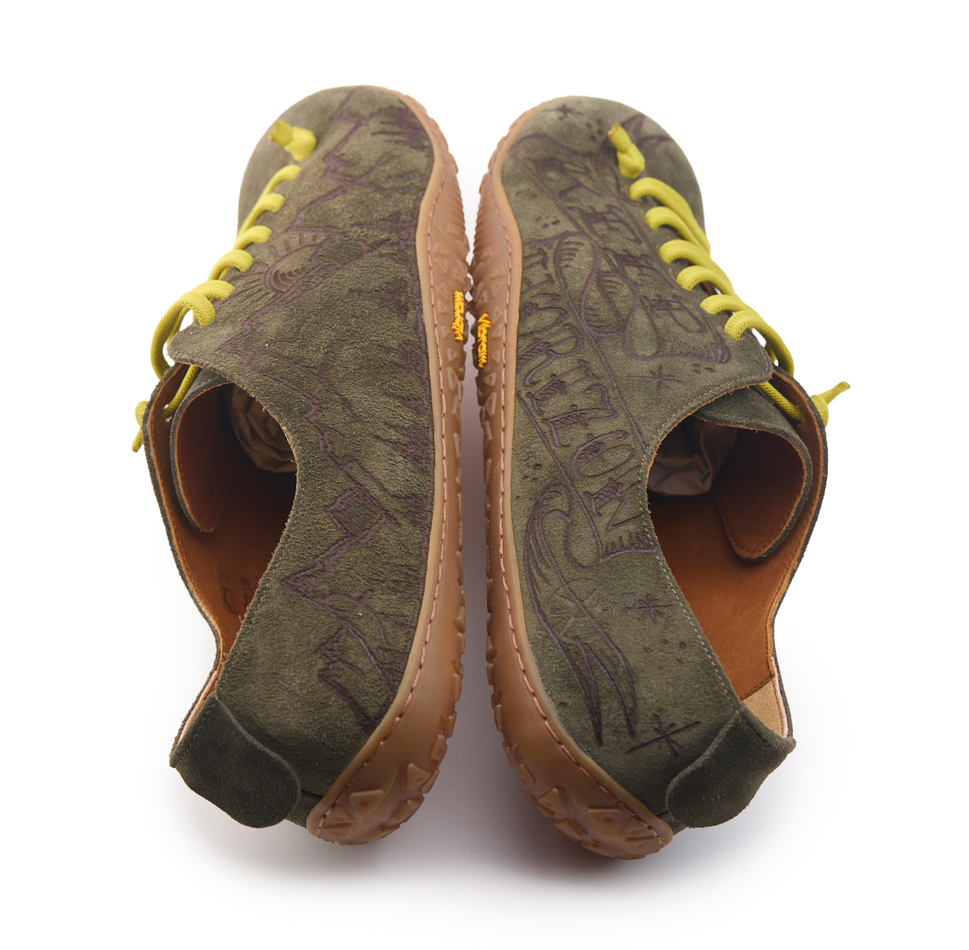 Scarpetta barefoot realizzato in pelle scamosciata, fodera in pelle vitello e lacci elastici annodati. Pirografata a mano da AC Longboards con disegno montagne e papiri con scritta ‘Keep Horizon’.