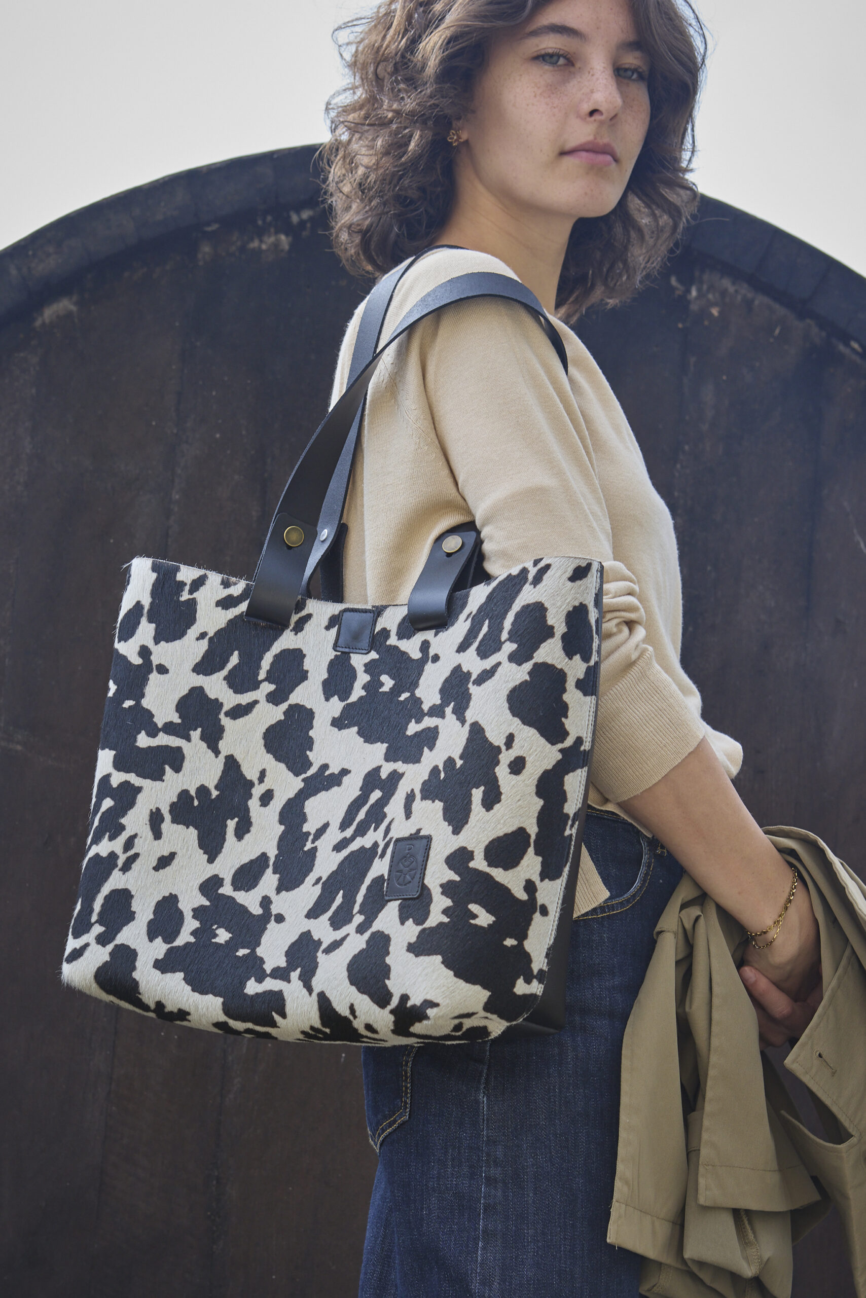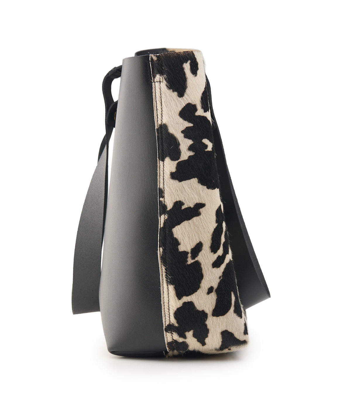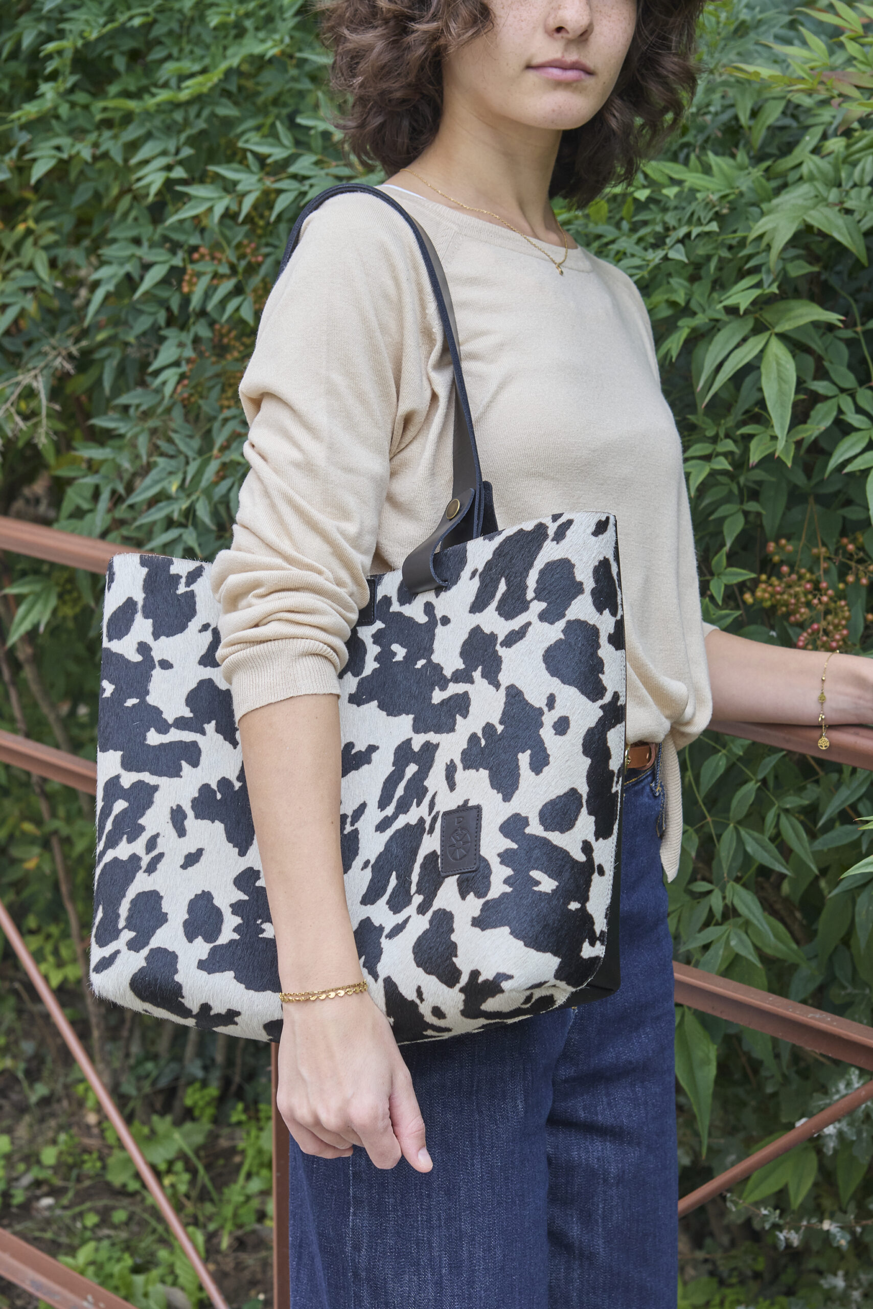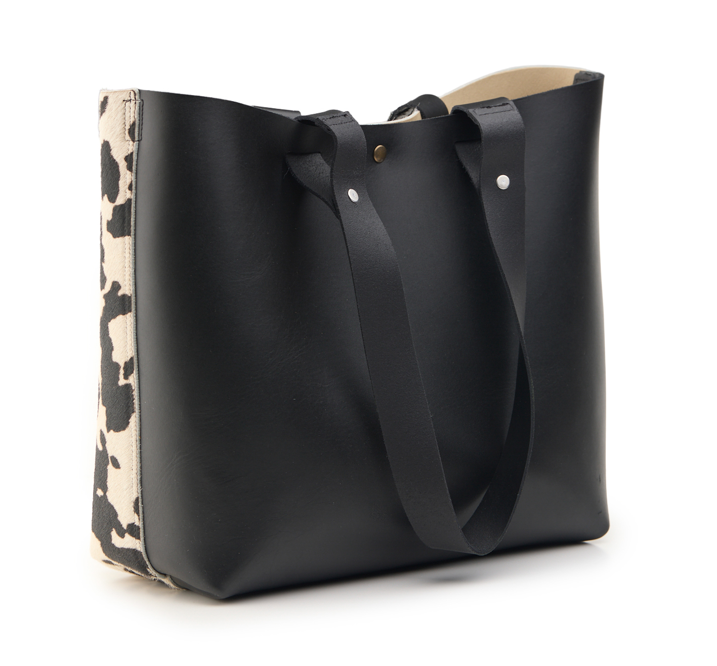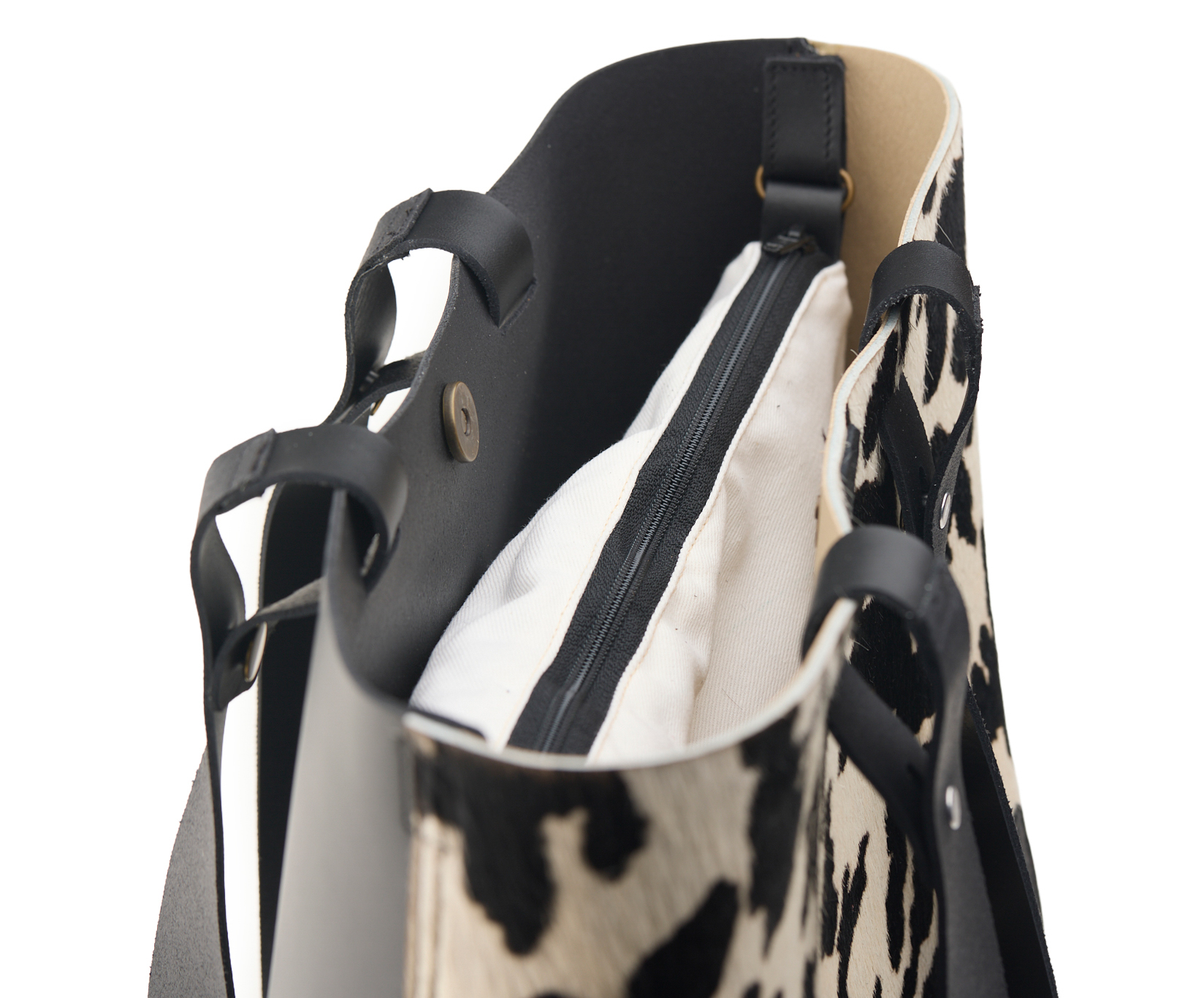 Borsa componibile in pelle cavallino Mucca e pelle nera composta da scocca, manico e sacca interna, per contenere e proteggere tutti gli oggetti che custodirà al suo interno.