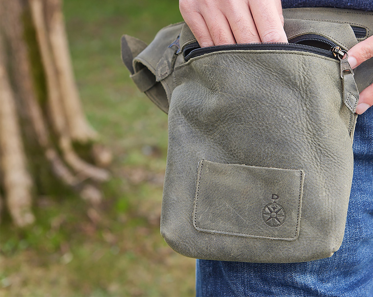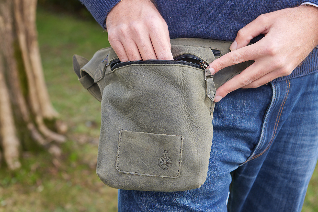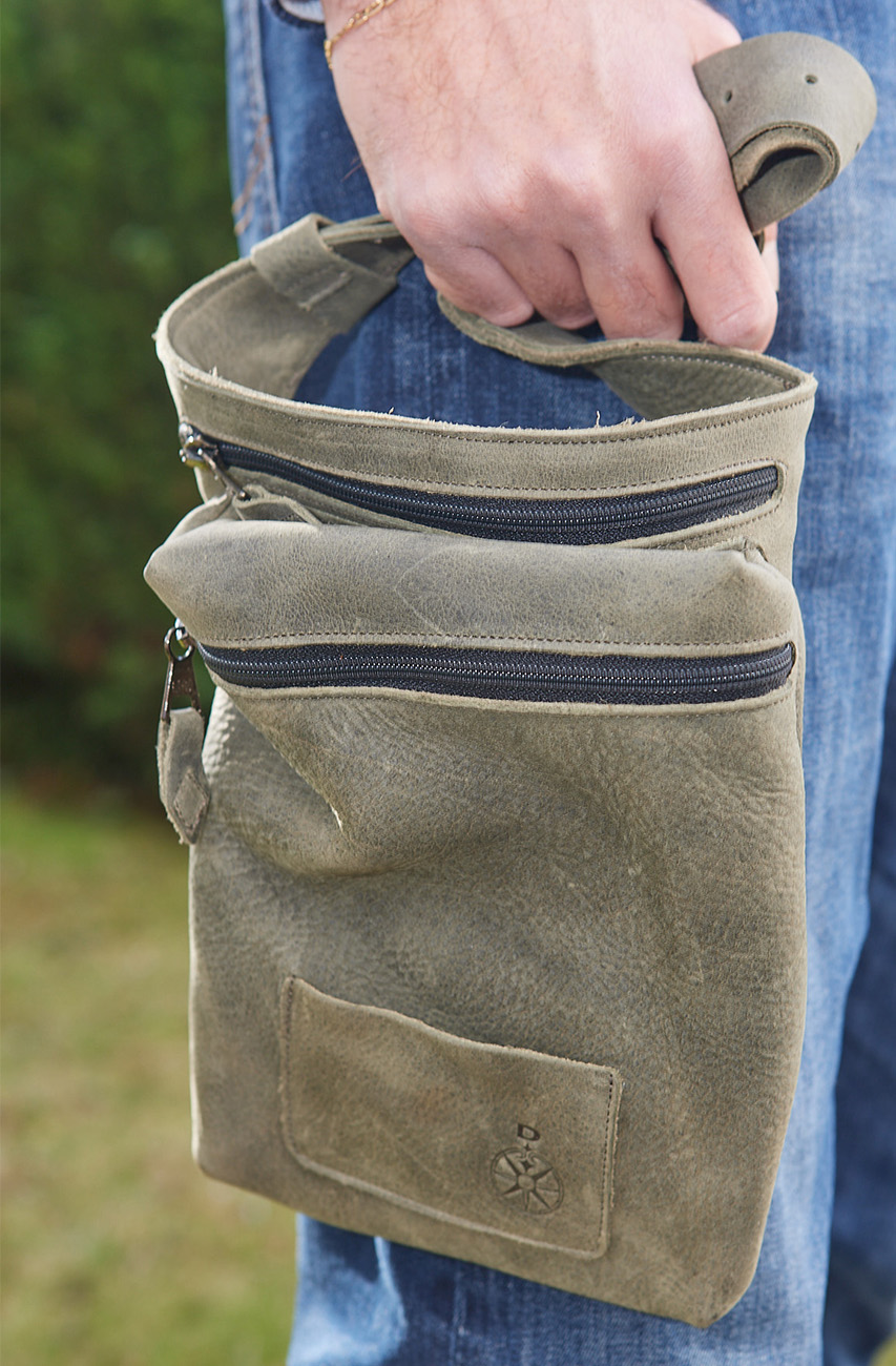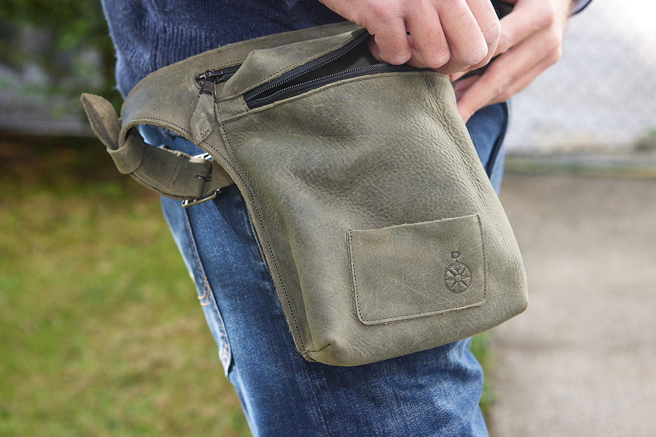 Marsupio da portare preferibilmente in vita, realizzato in pelle ingrassata e bottalata color fumo.