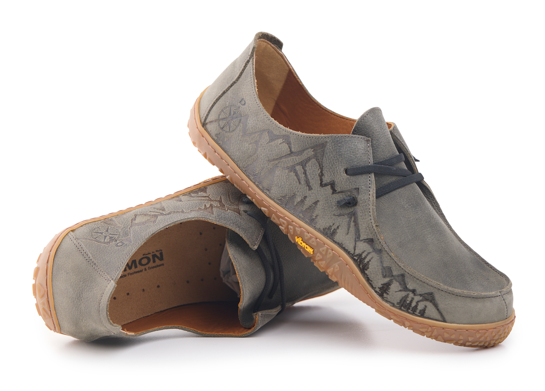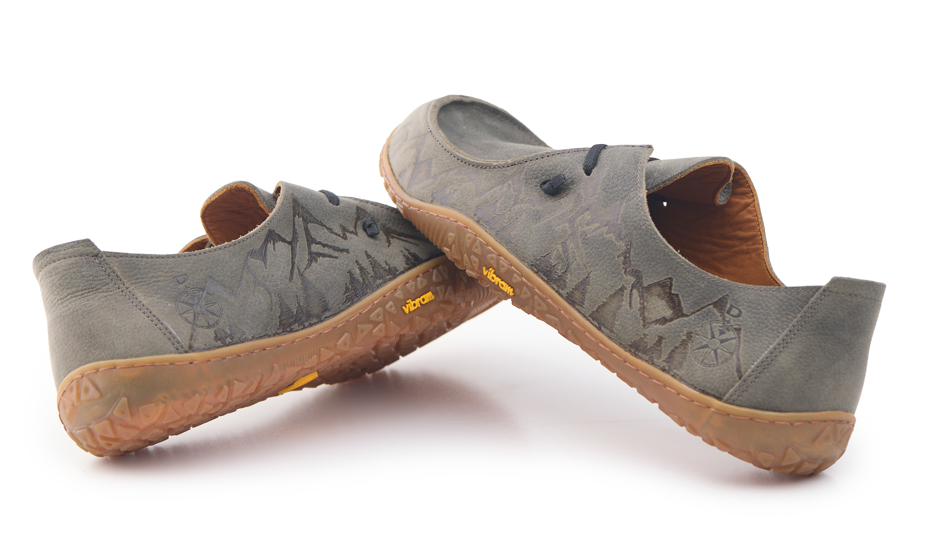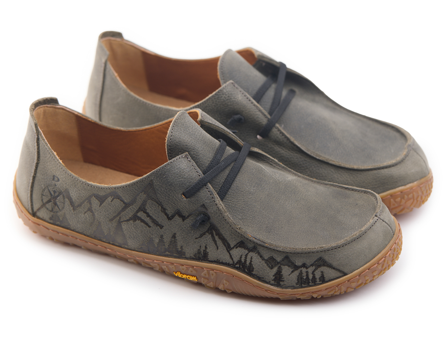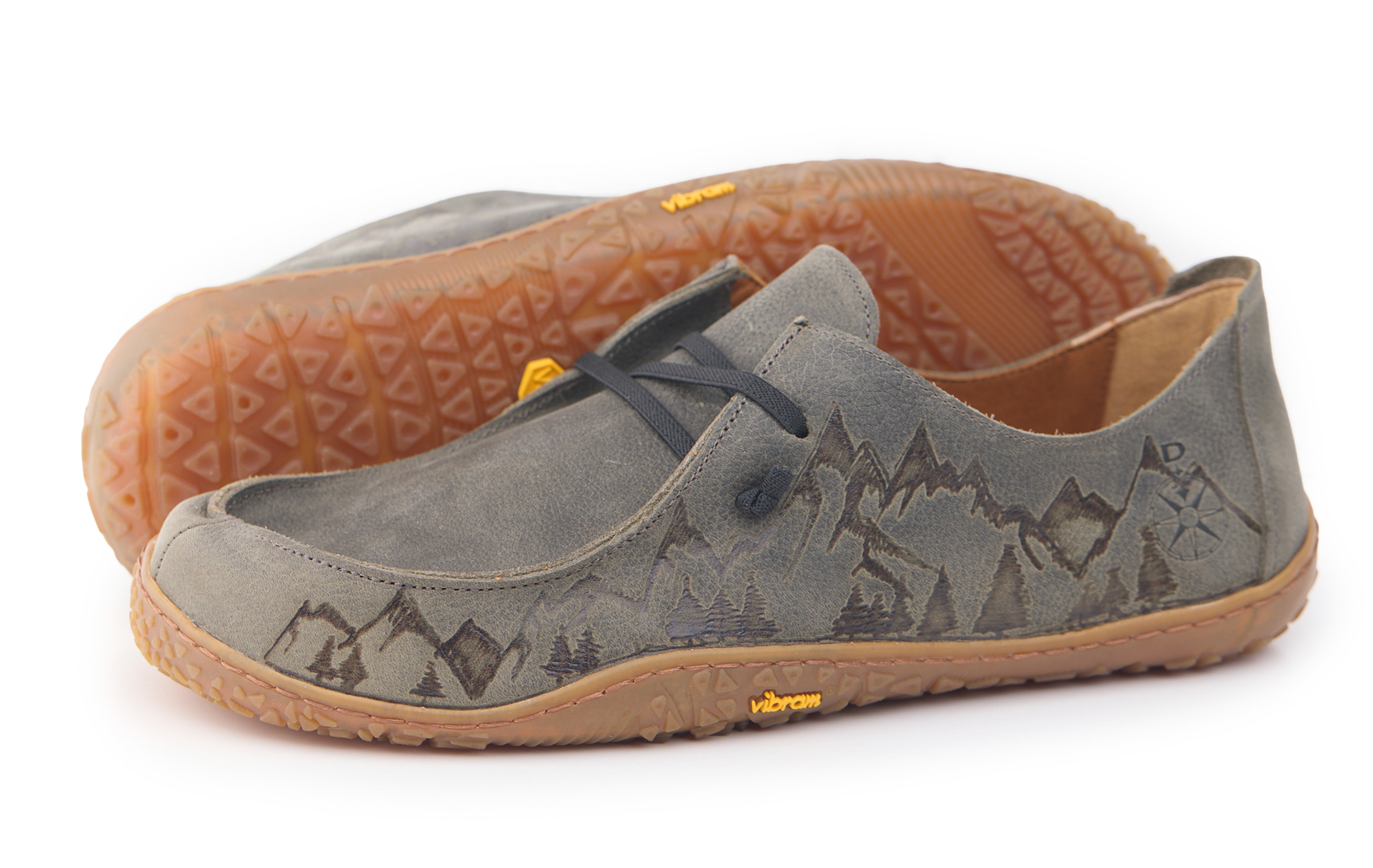 Mocassino barefoot realizzato in pelle nabuk pieno fiore oliato e bottalato, fodera in pelle vitello e lacci elastici annodati. Pirografata a mano da AC Longboards con disegno montagne.