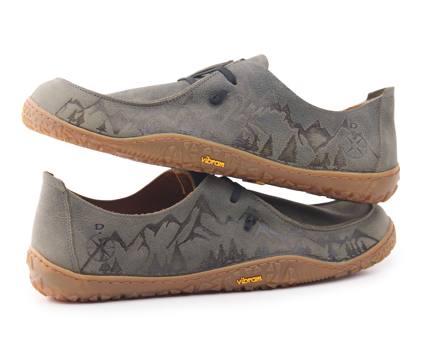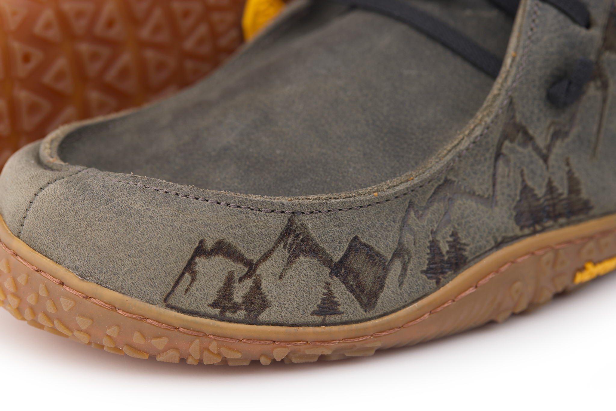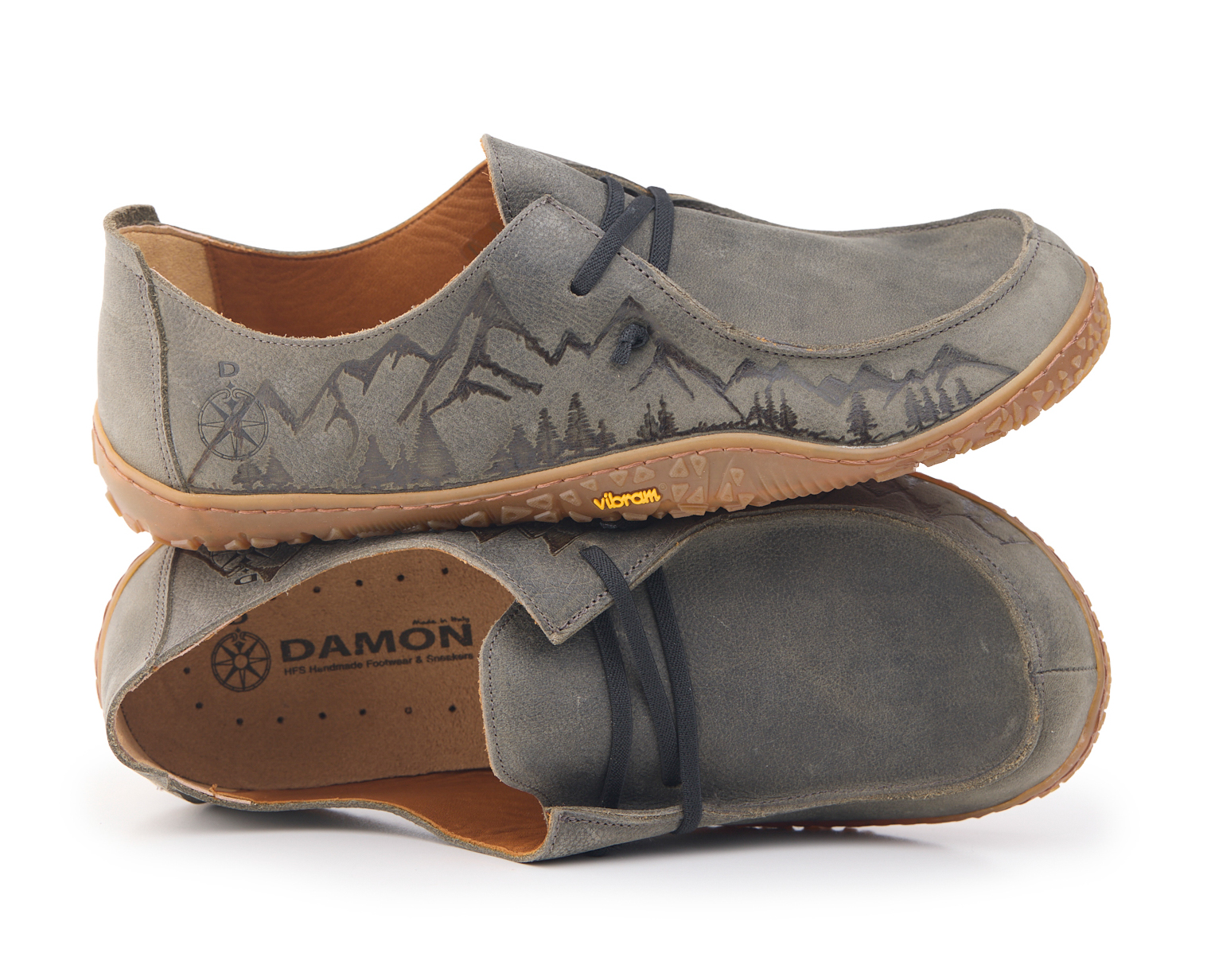 Mocassino barefoot realizzato in pelle nabuk pieno fiore oliato e bottalato, fodera in pelle vitello e lacci elastici annodati. Pirografata a mano da AC Longboards con disegno montagne.