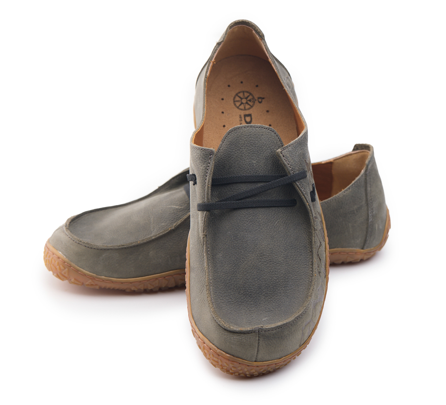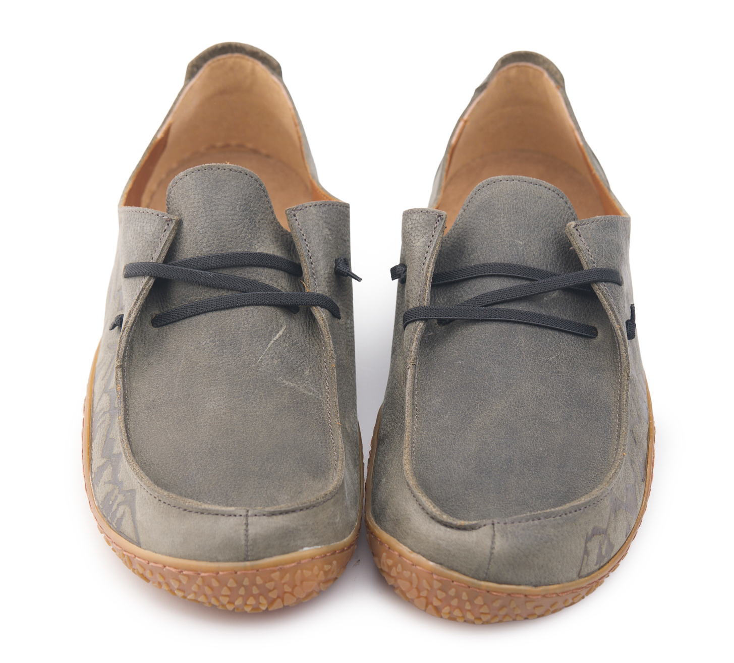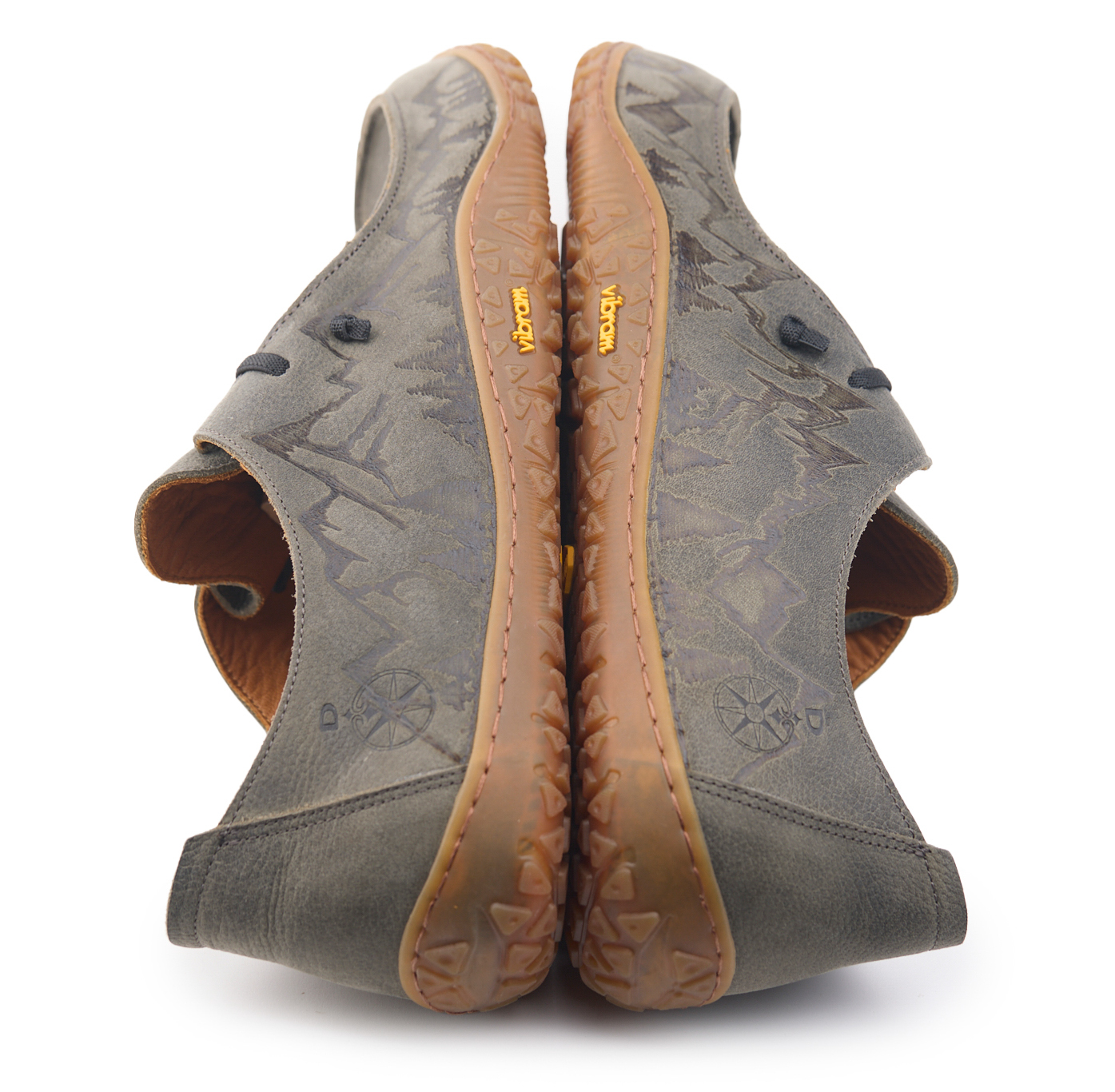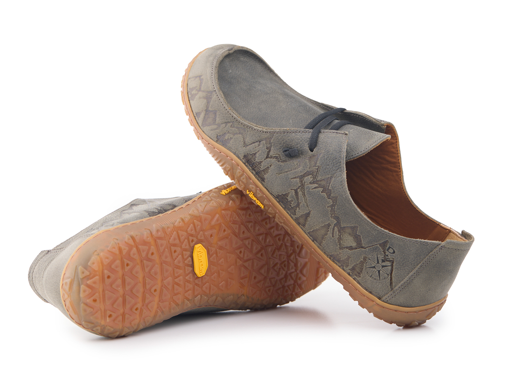 Mocassino barefoot realizzato in pelle nabuk pieno fiore oliato e bottalato, fodera in pelle vitello e lacci elastici annodati. Pirografata a mano da AC Longboards con disegno montagne.