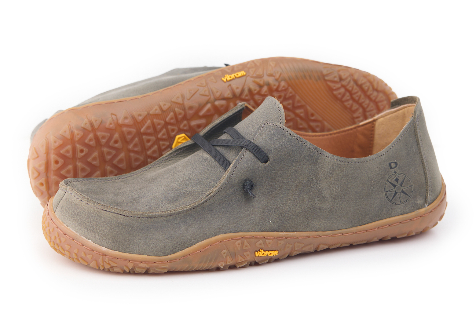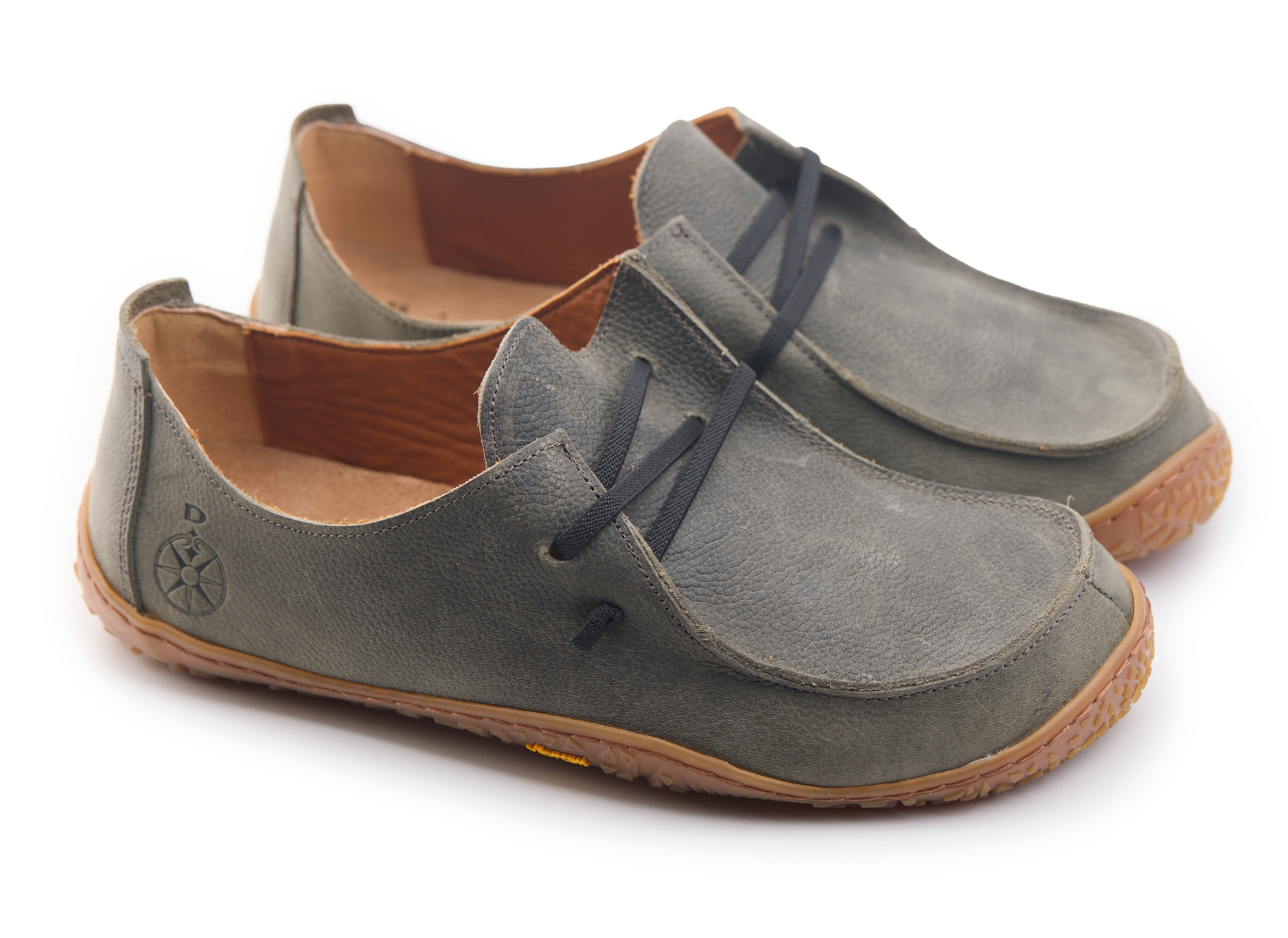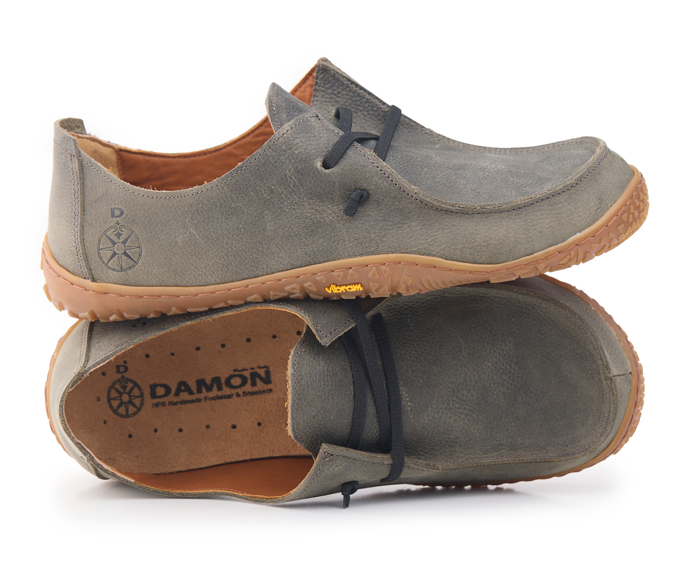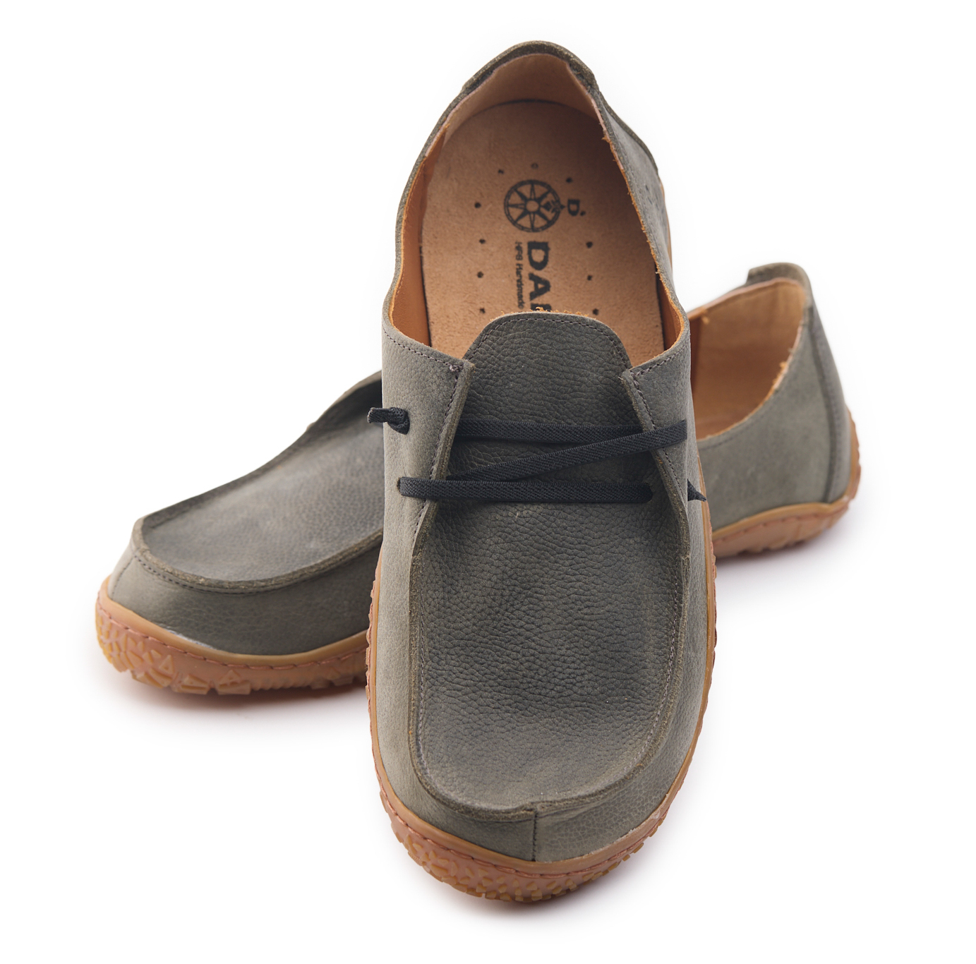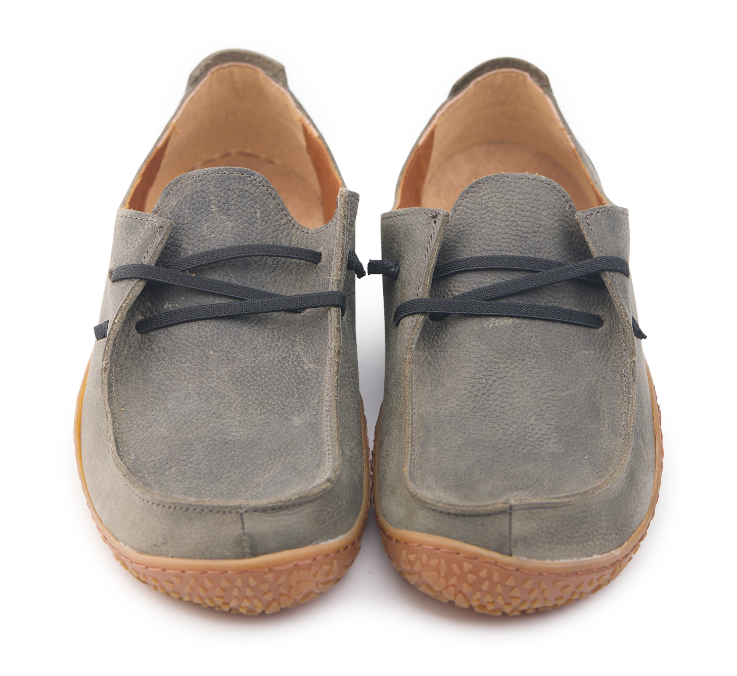 Mocassino barefoot realizzato in pelle nabuk pieno fiore oliato e bottalato, fodera in pelle vitello e lacci elastici annodati.