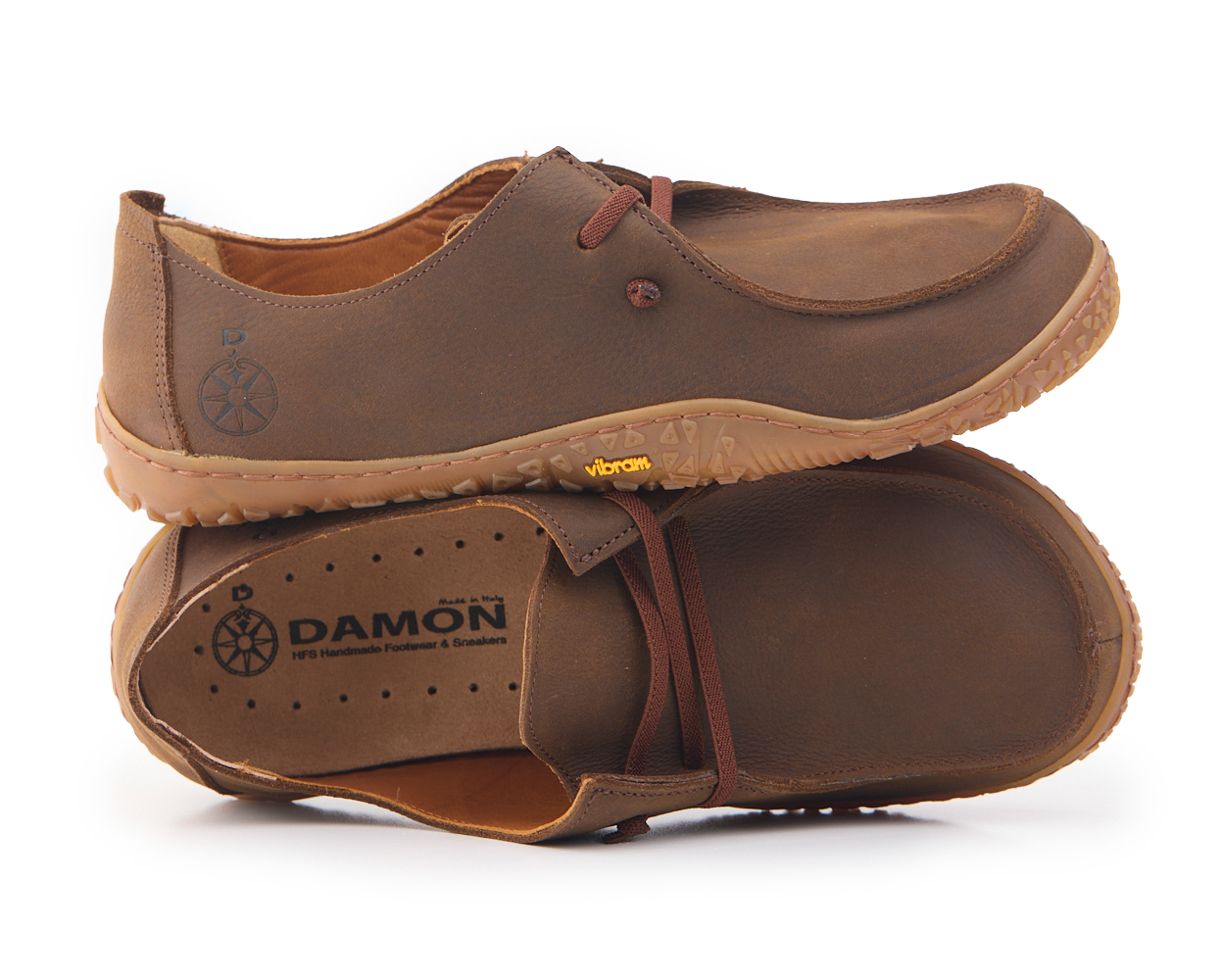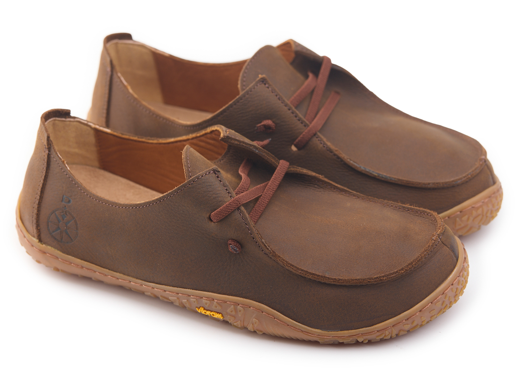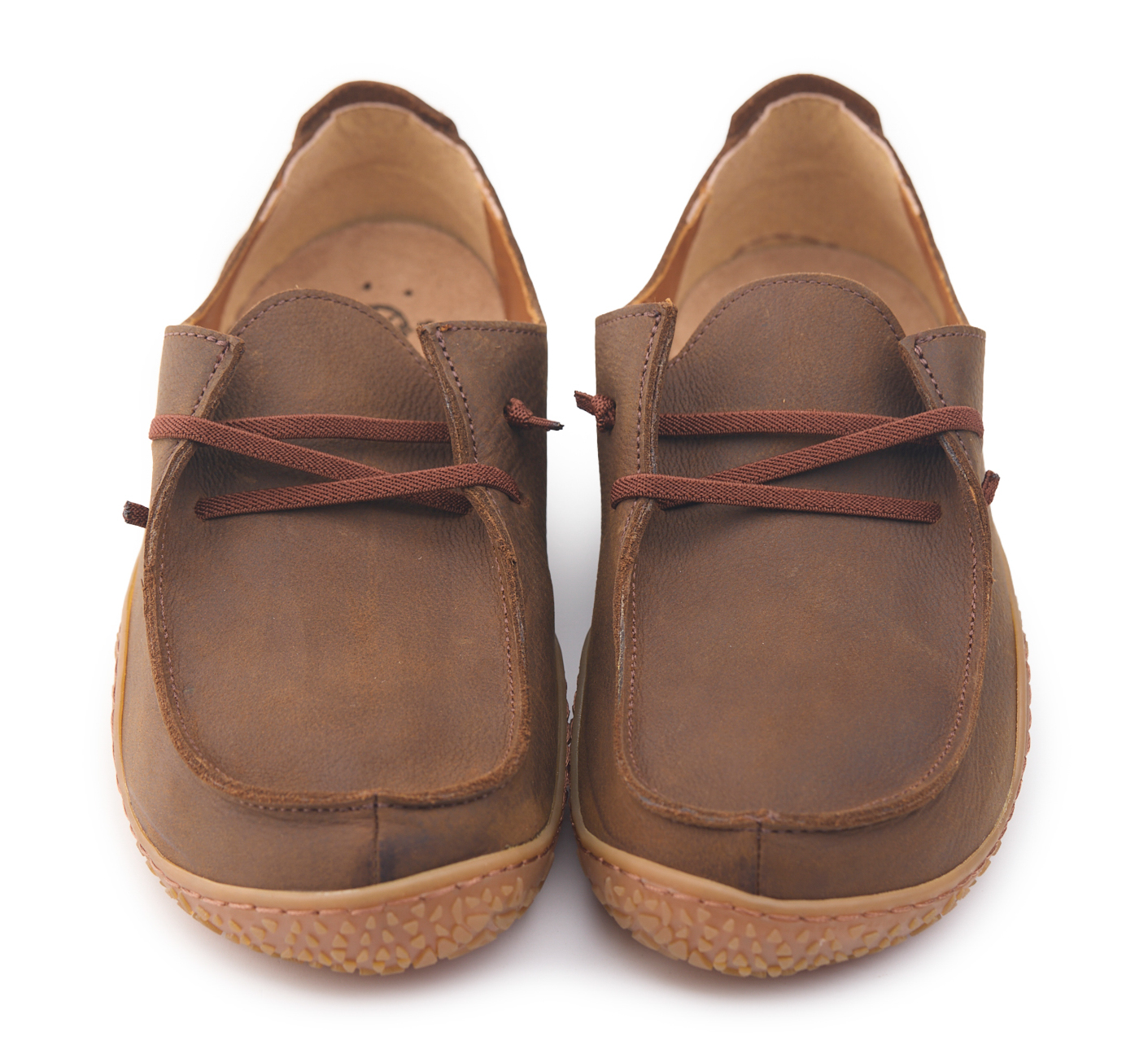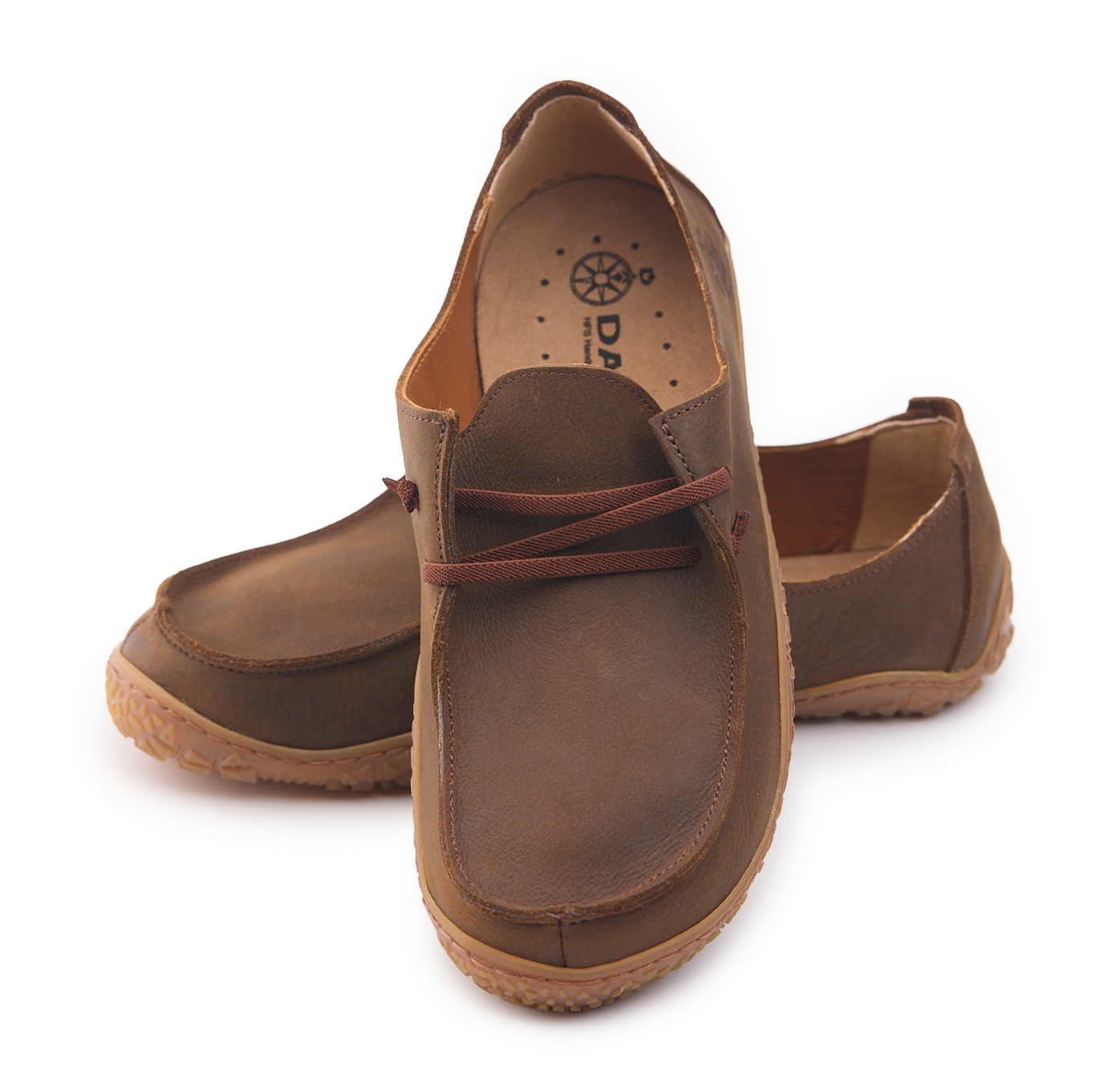 Mocassino barefoot realizzato in pelle nabuk pieno fiore oliato e bottalato, fodera in pelle vitello e lacci elastici annodati.