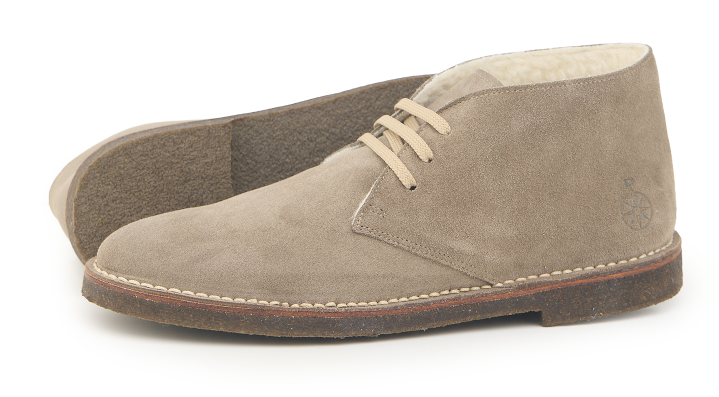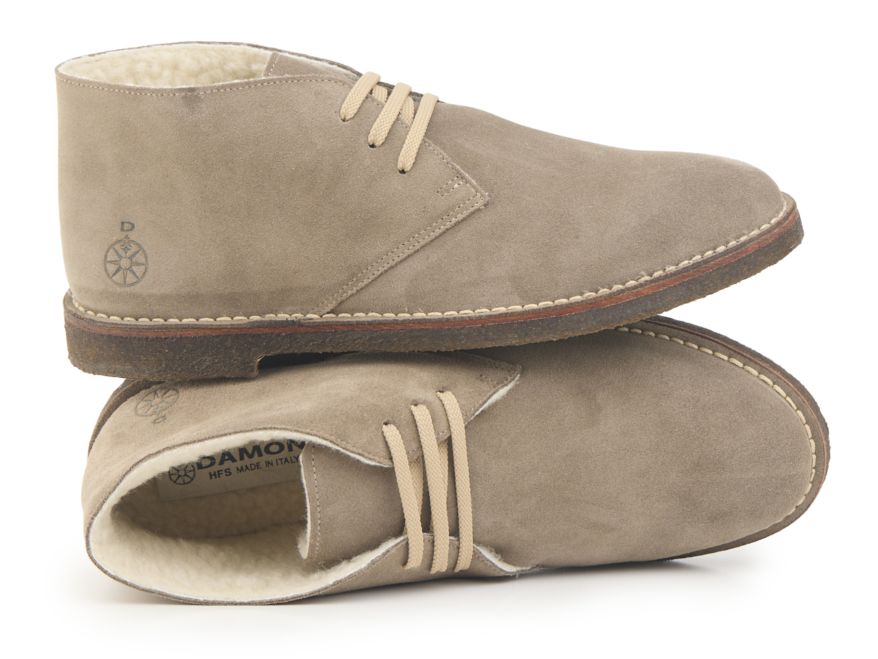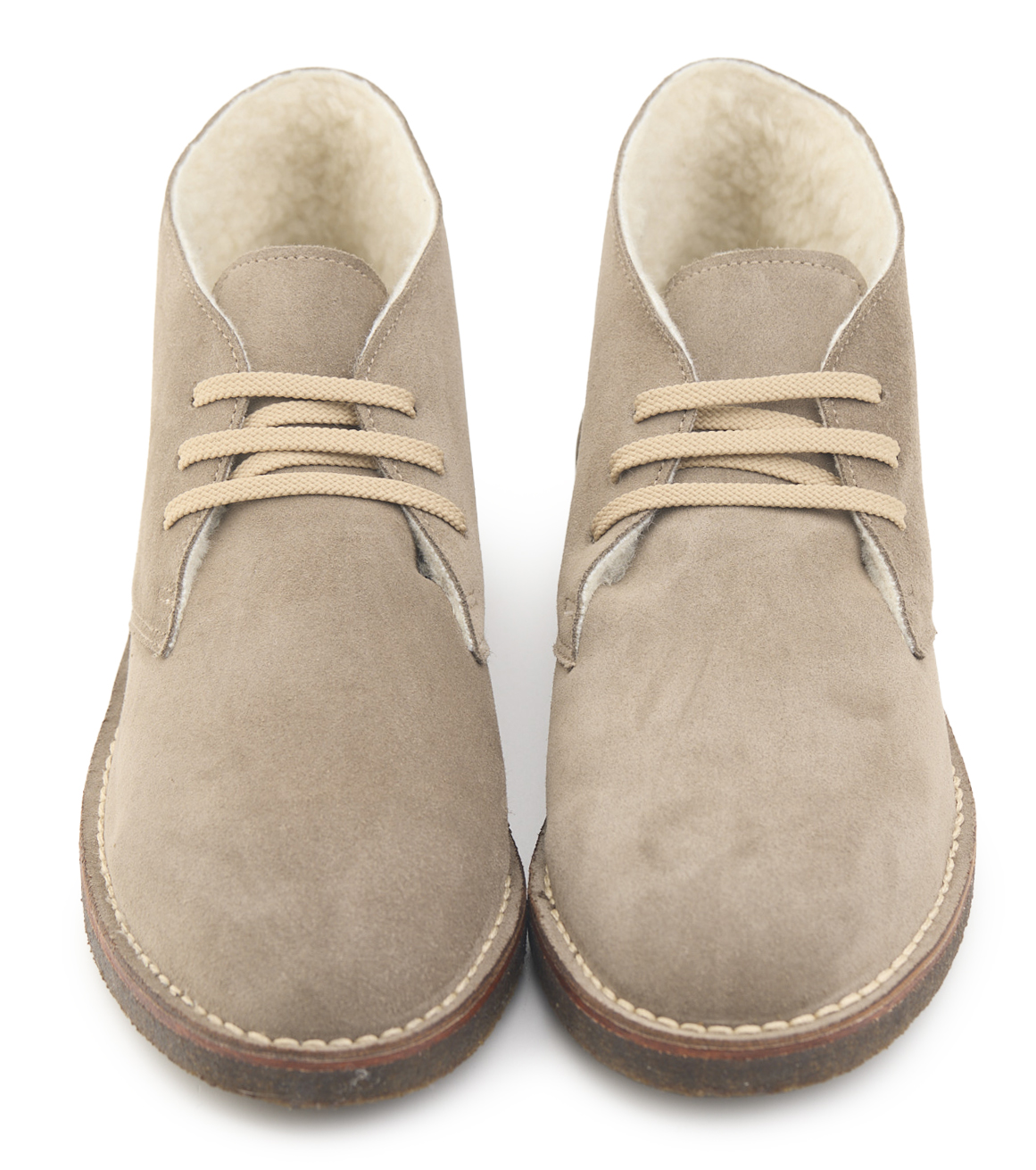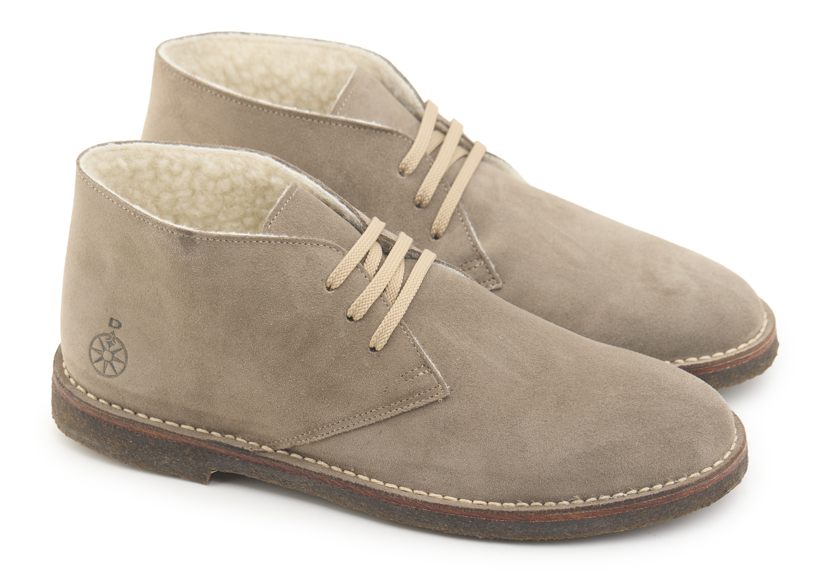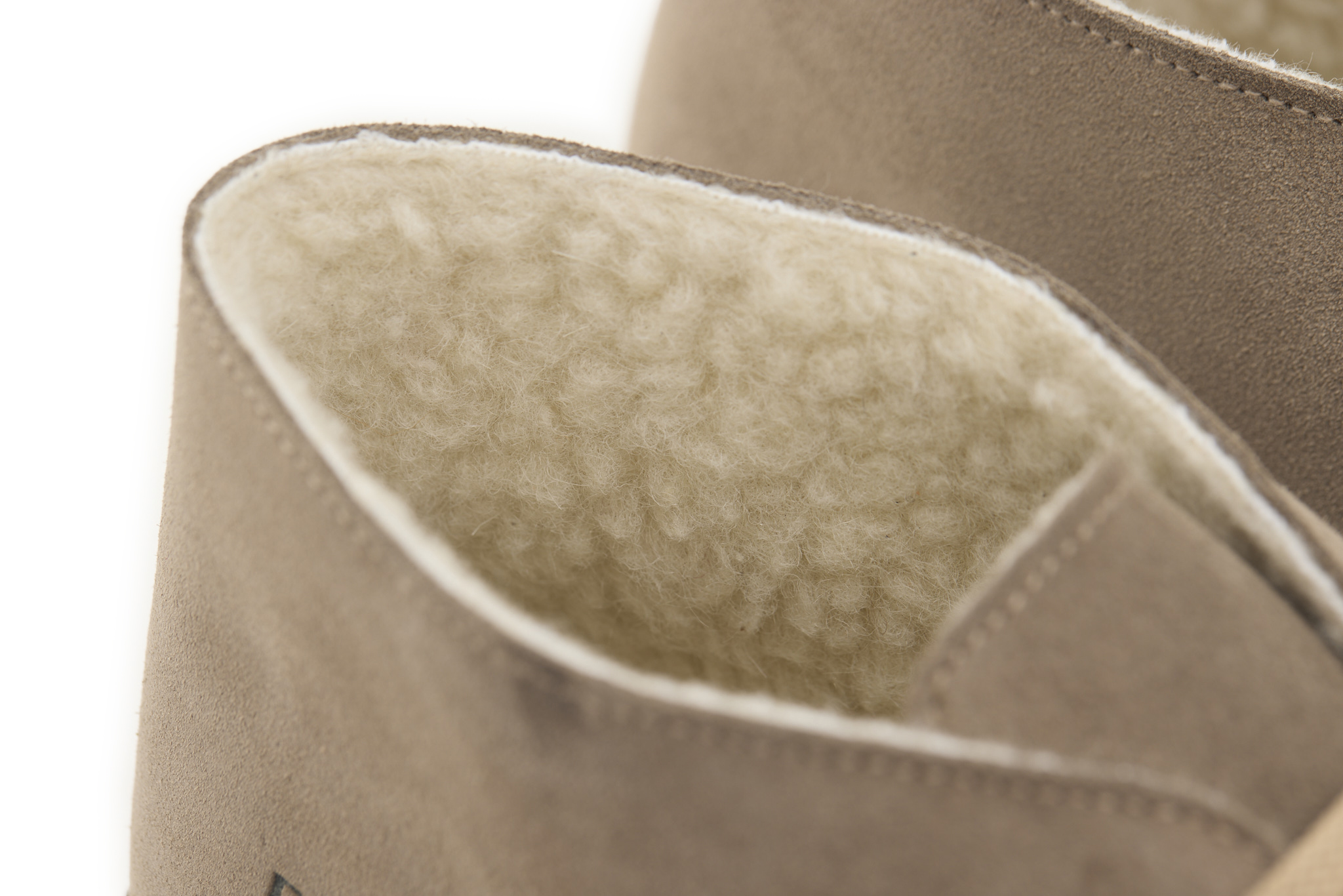 Polacchino comfort realizzato in pelle scamosciata e fodera in lana certificata RWS, Responsible Wool Standard. Lavorazione Ideal, sottopiede memory e suola in gomma NR (Natural Rubber).