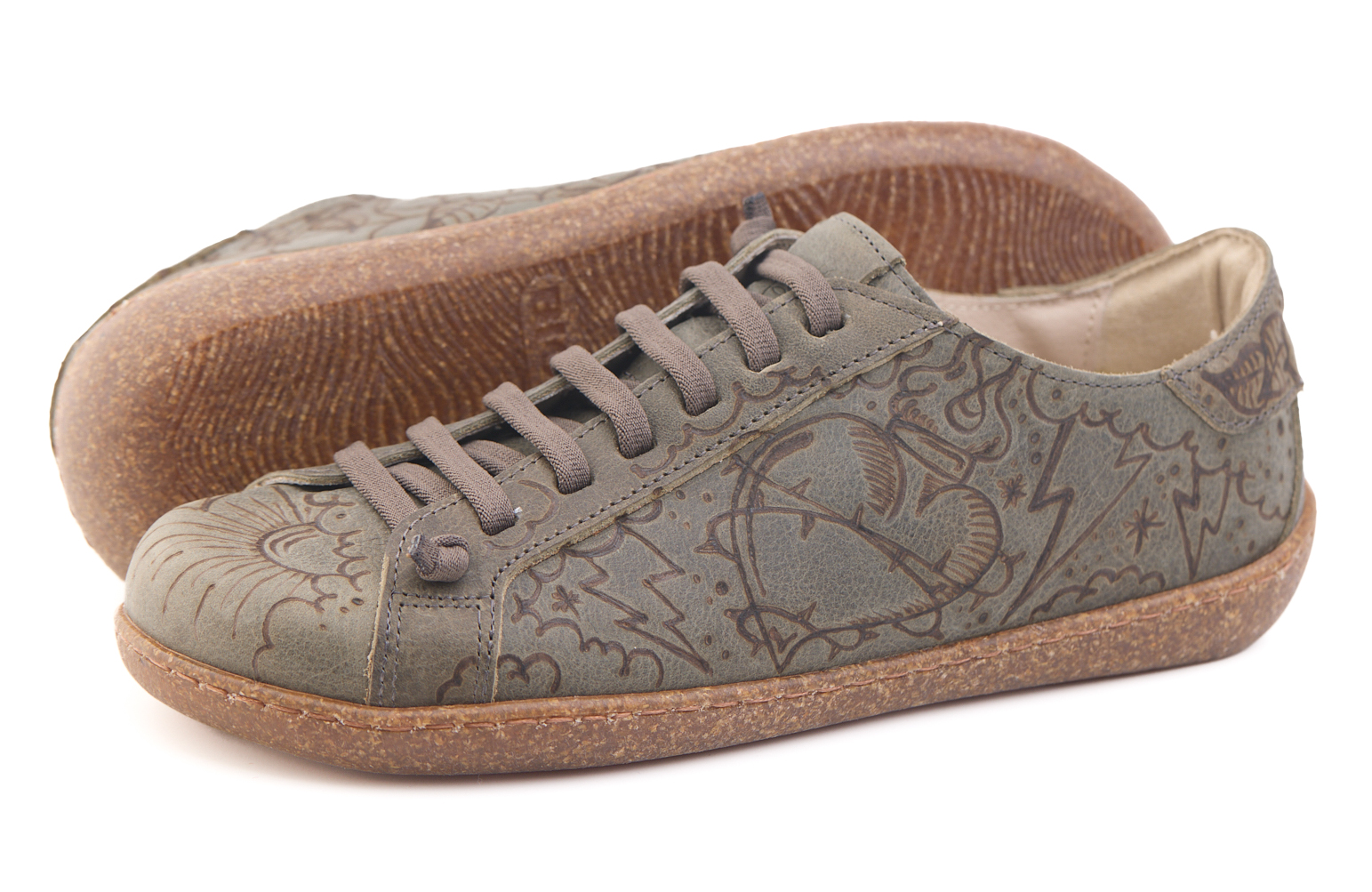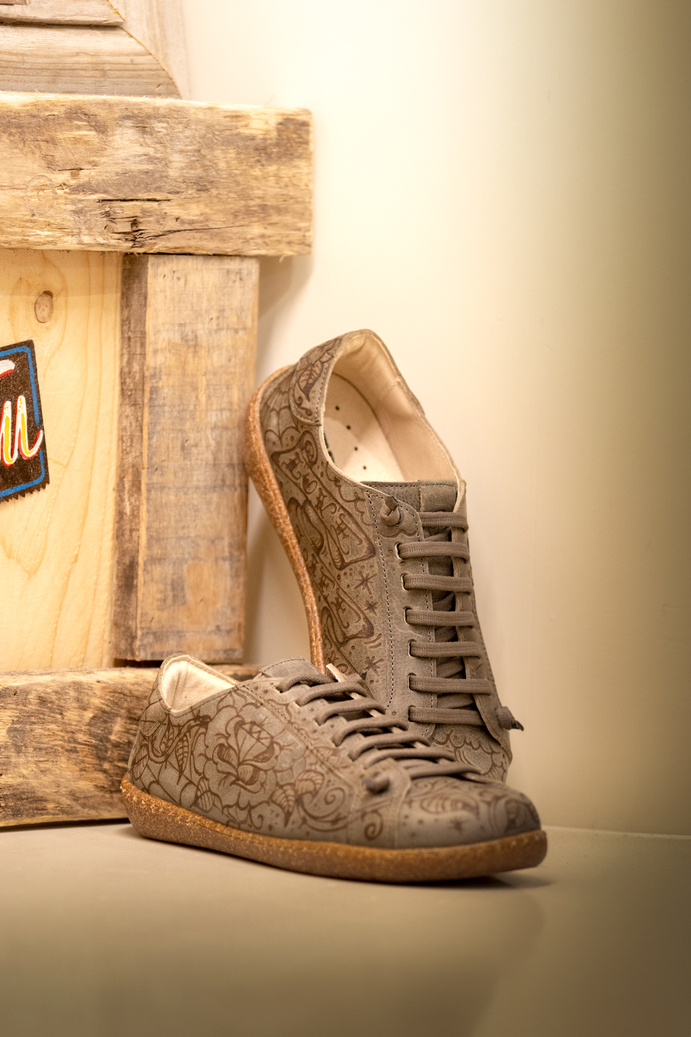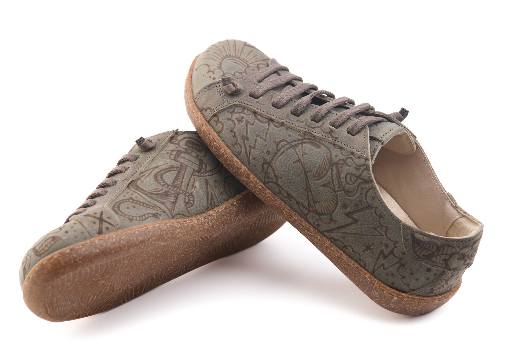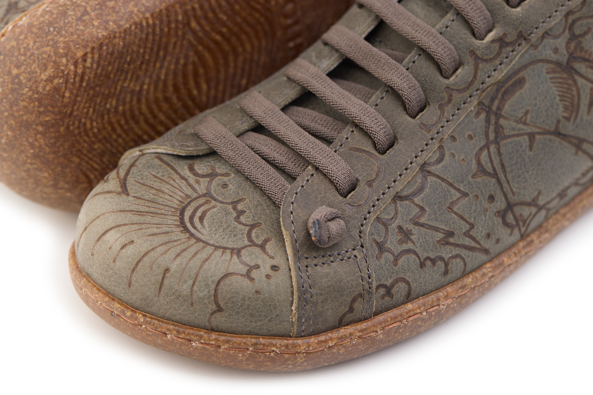 Sneakers comfort in pelle ingrassata e bottalata conciata artigianalmente pirografato completamente a mano da AC Longboards, fodera in vitello con lacci elastici in tinta e sottopiede estraibile gomma-sughero ricoperto in pelle. Suola in materiale termoplastico e sughero.