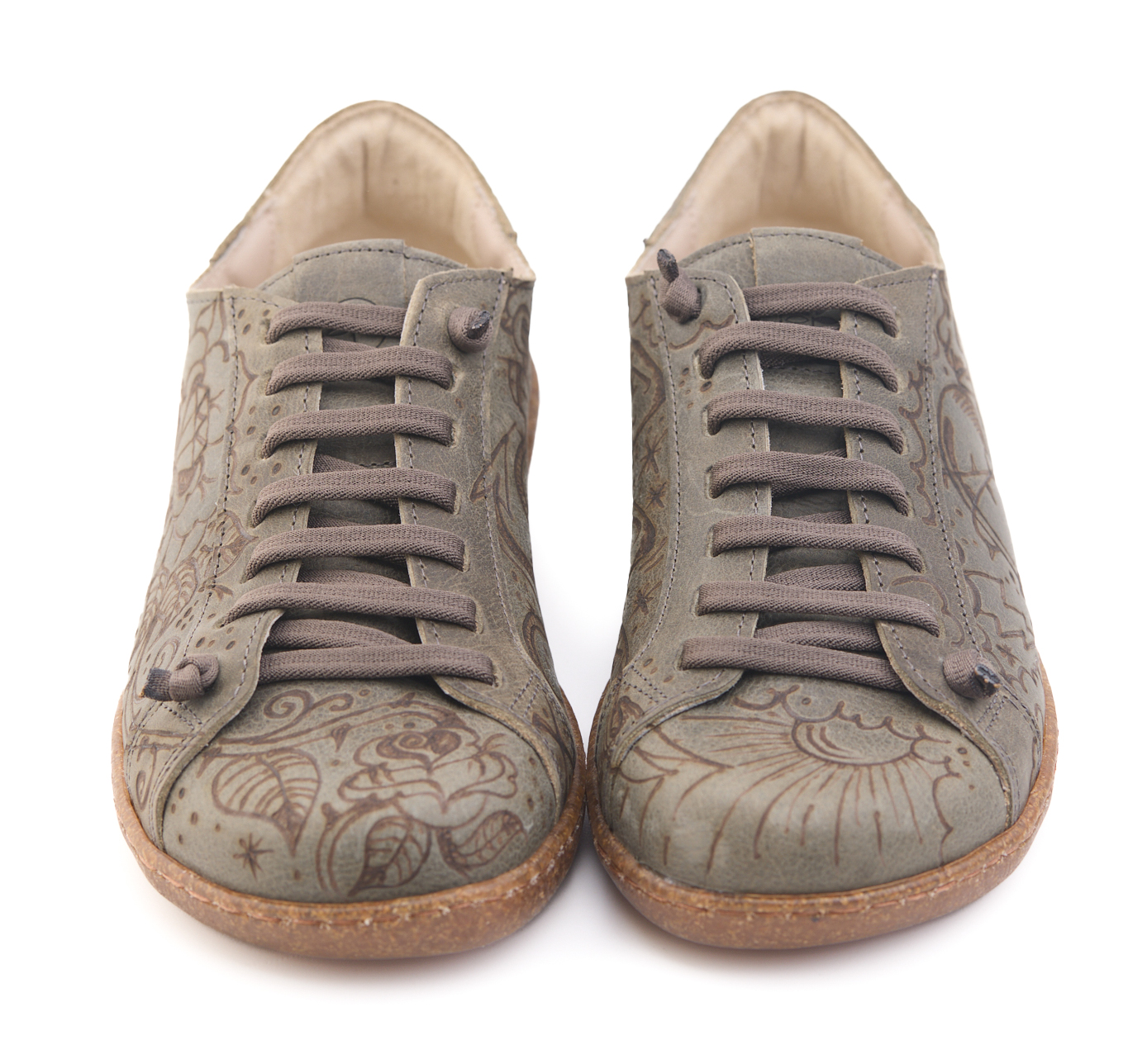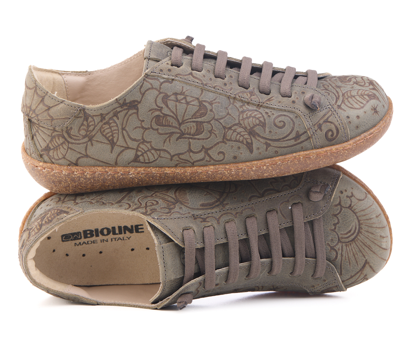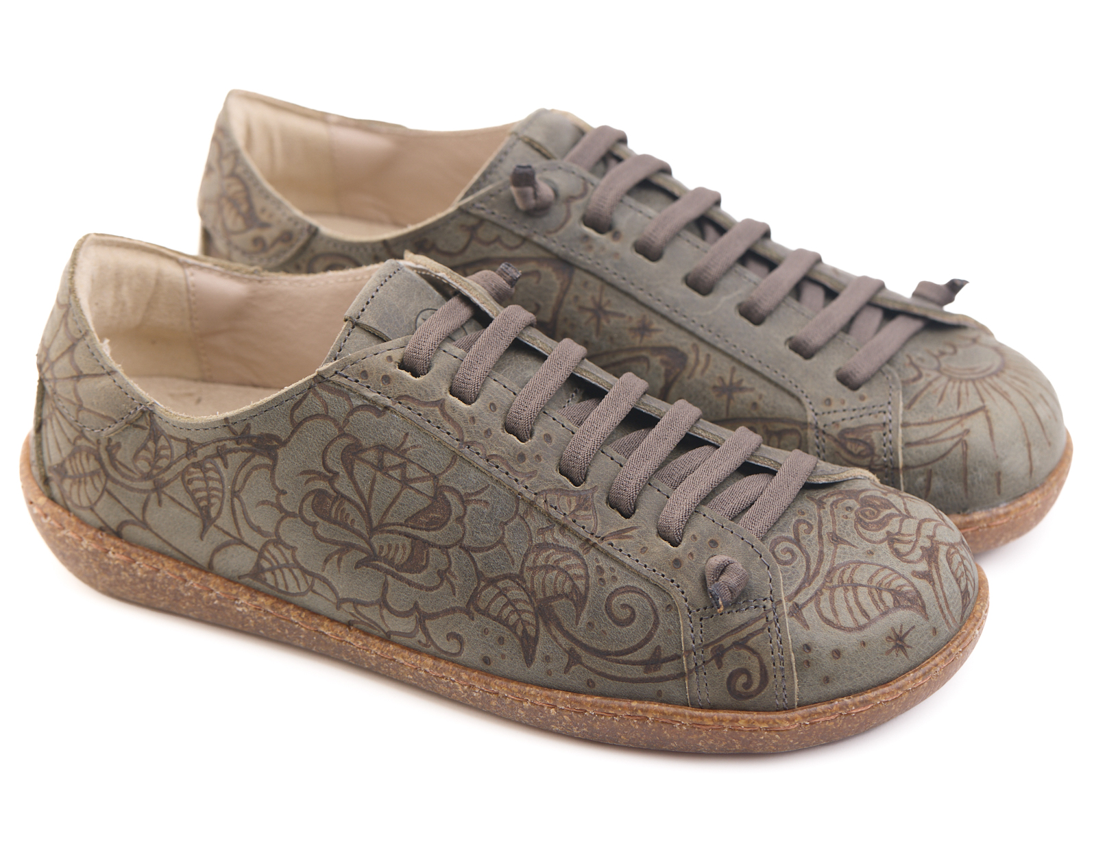 Sneakers comfort in pelle ingrassata e bottalata conciata artigianalmente pirografato completamente a mano da AC Longboards, fodera in vitello con lacci elastici in tinta e sottopiede estraibile gomma-sughero ricoperto in pelle. Suola in materiale termoplastico e sughero.