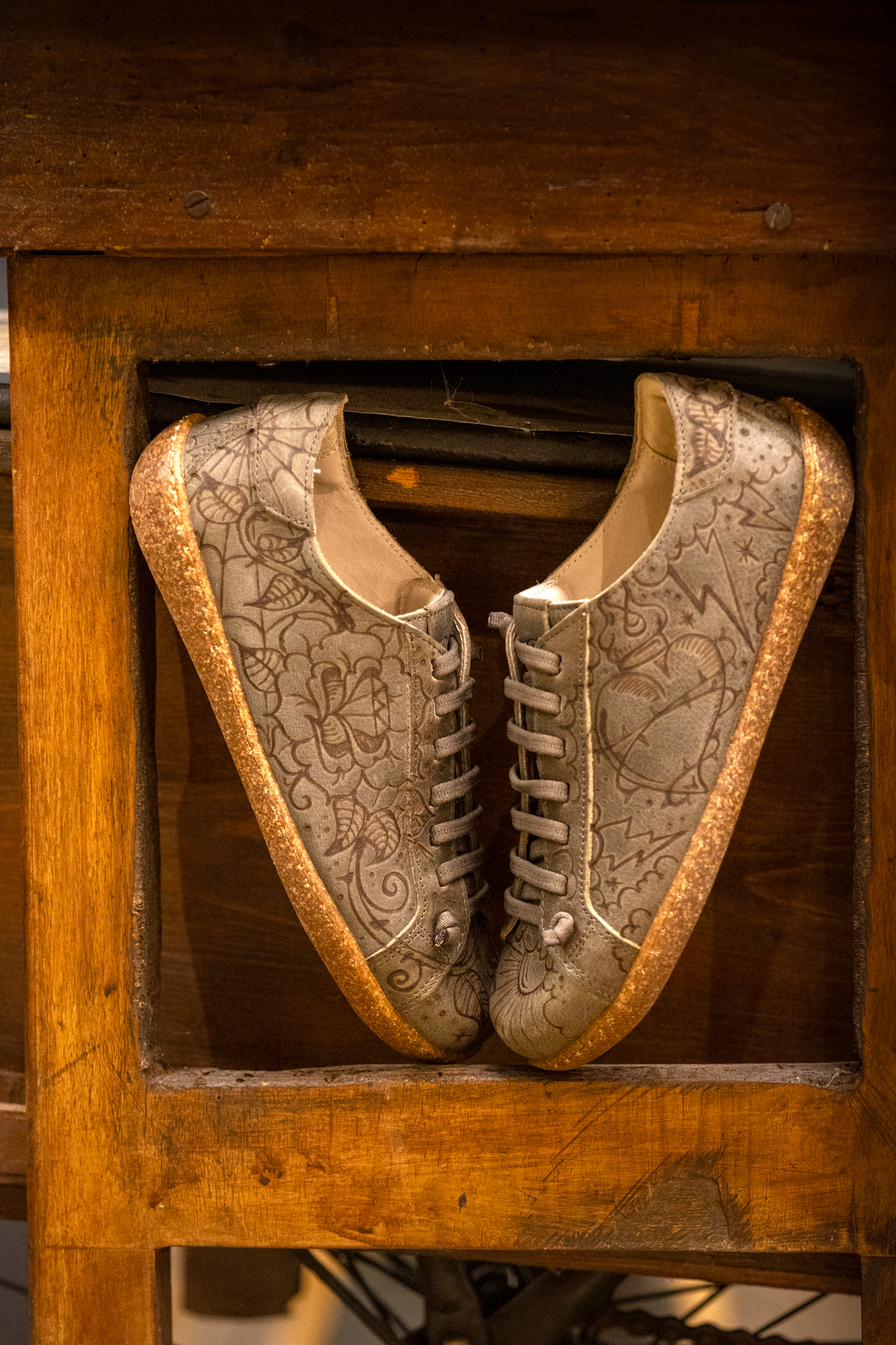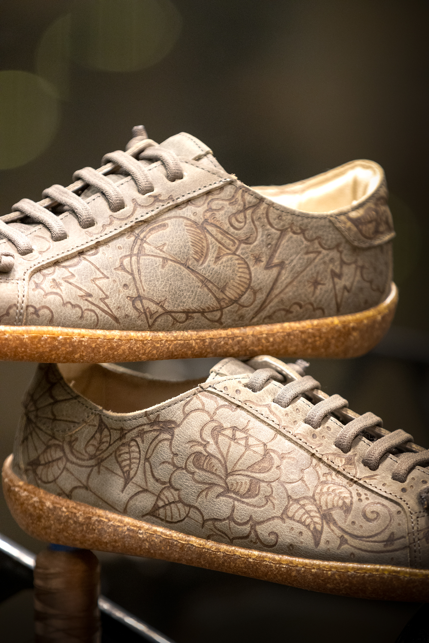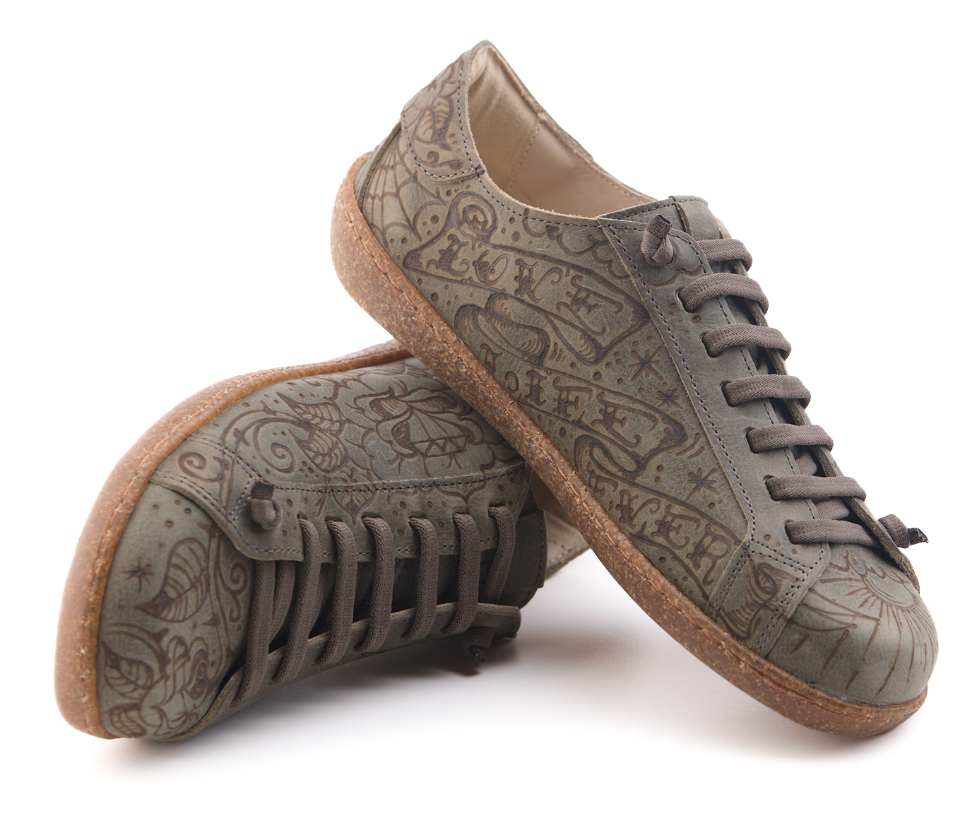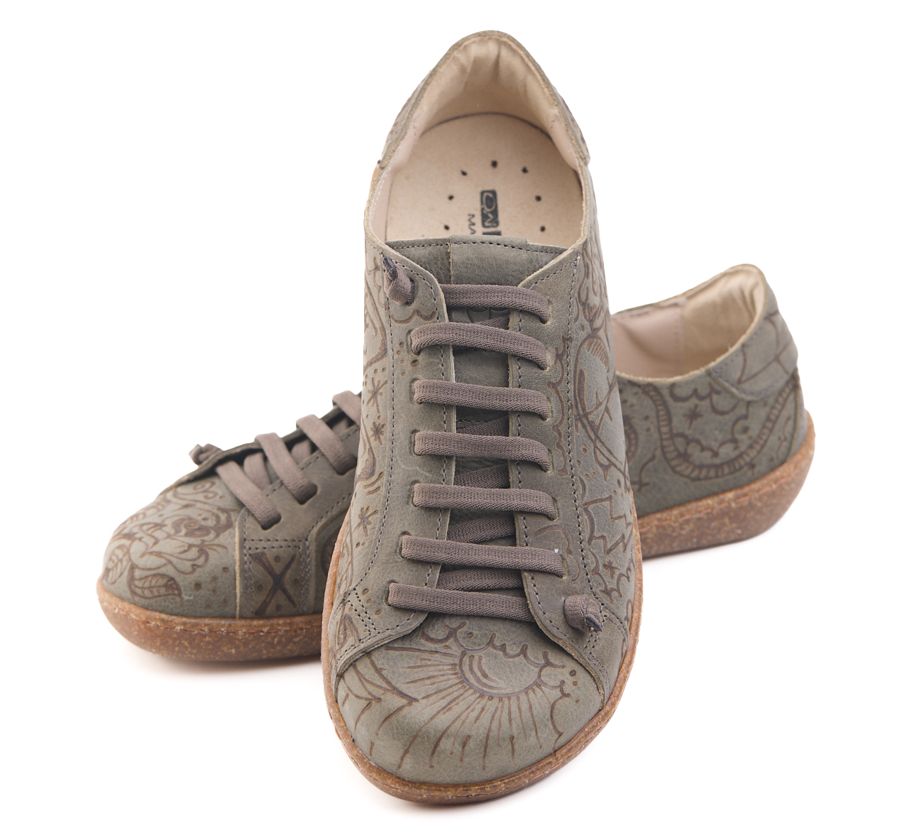 Sneakers comfort in pelle ingrassata e bottalata conciata artigianalmente pirografato completamente a mano da AC Longboards, fodera in vitello con lacci elastici in tinta e sottopiede estraibile gomma-sughero ricoperto in pelle. Suola in materiale termoplastico e sughero.