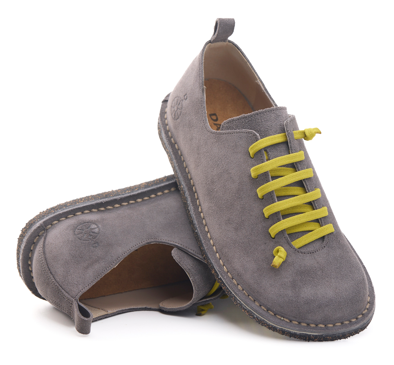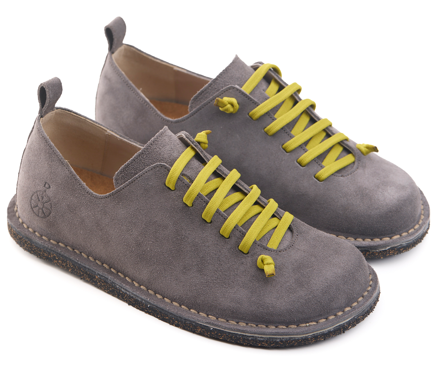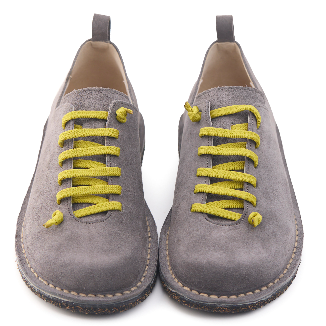 Scarpetta comfort in pelle scamosciata con lacci elastici e fodera in pelle vitello.